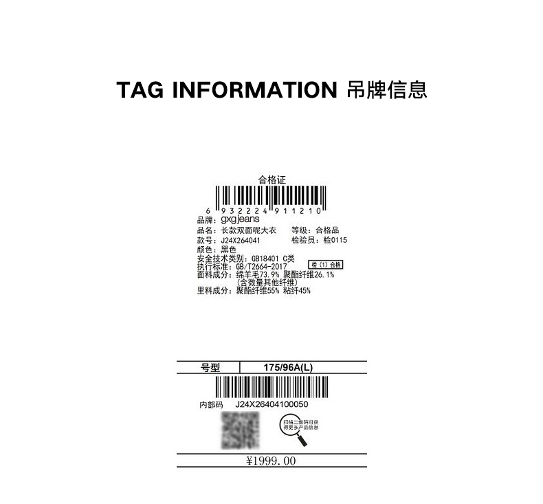 gxg.jeans男装 冬季热卖长款双面呢大衣J24X264041