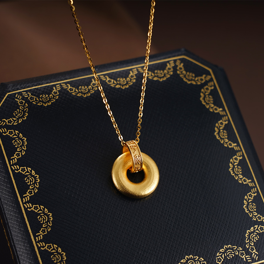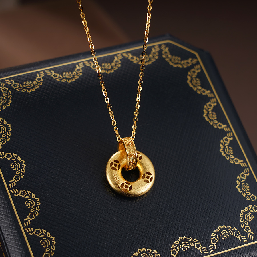 【寓意】:项链以纯银精制,磨砂工艺打造,巧妙融合铜钱元素,整体色泽温润,华而不炫,寓意财源广进、招财聚富。