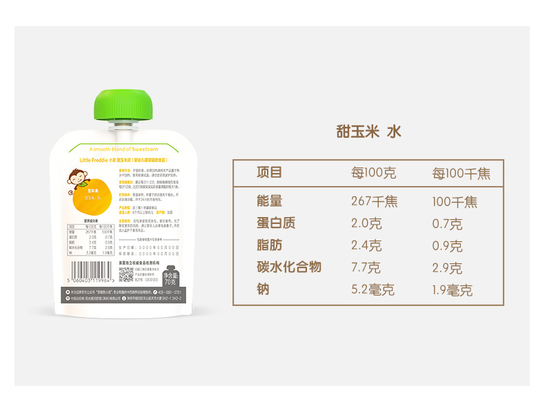英国Little Freddie 小皮 甜玉米泥 70g/袋宝宝婴儿辅食泥 蔬菜糖盐 6月+