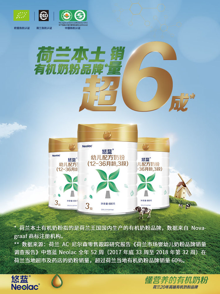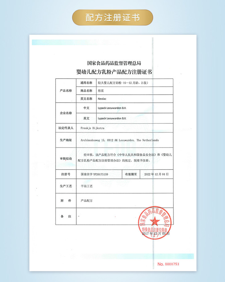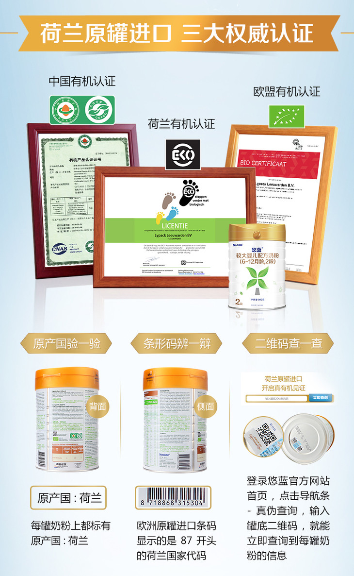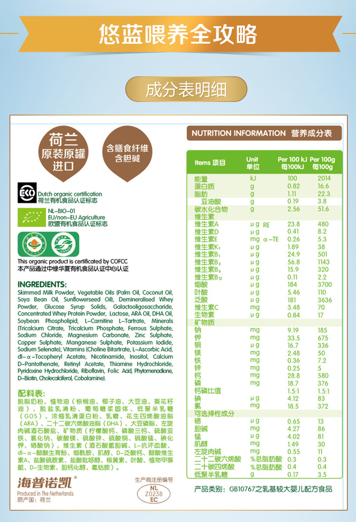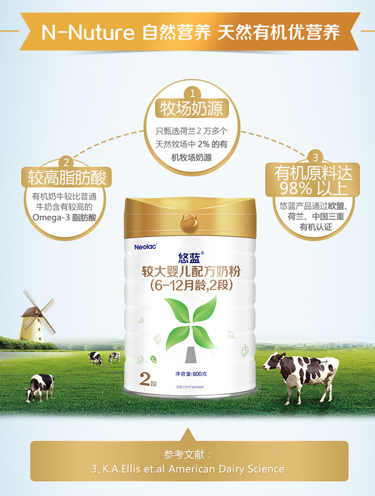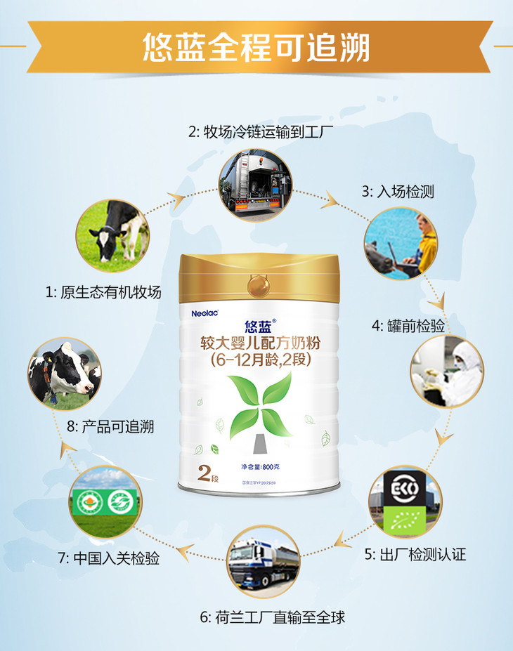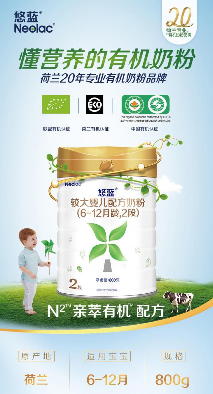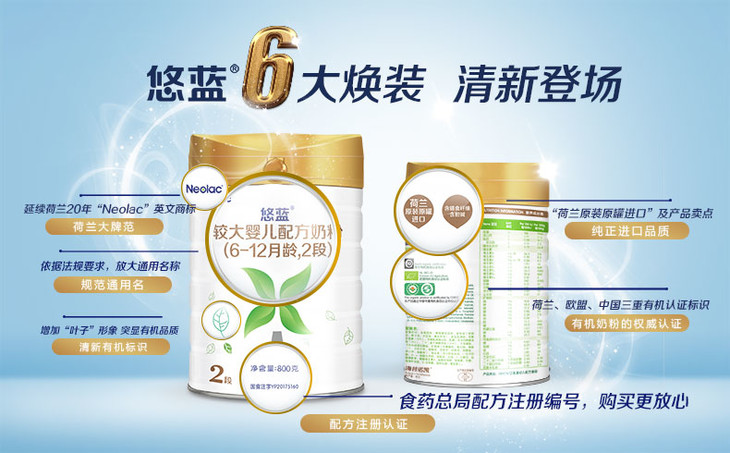 荷兰进口Neolac悠蓝有婴幼儿配方奶粉2段6-12个月800g(2021年7月)