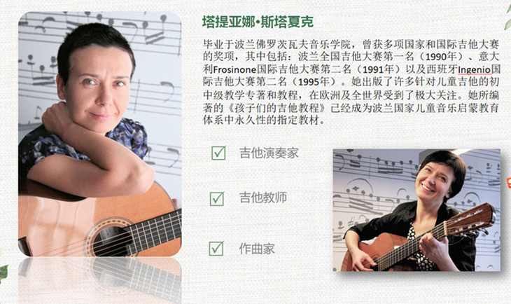 塔蒂亚娜·斯塔夏克,波兰吉他演奏家,出版社特约吉他板块主编。本书为波兰引进版图书,编辑策划并组稿。本套书分为基础篇和进阶篇两个分册。这是一套针对儿童的、从零起步学吉他的教程,其独奏曲旋律简洁,节奏生动,非常符合儿童审美需求;所配图画运用水彩画风,色彩柔美,线条讲究,与吉他作品的谱例相得益彰,有机地互动;随机呈现的演奏技法要点和乐理知识,阐述清晰,简明扼要,容易掌握。这套教程曾送到专业吉他老师处审阅,被充分肯定,称为“儿童吉他汤普森”。此外,它以四种语言呈现,版权已顺利输出到德国和奥地利。