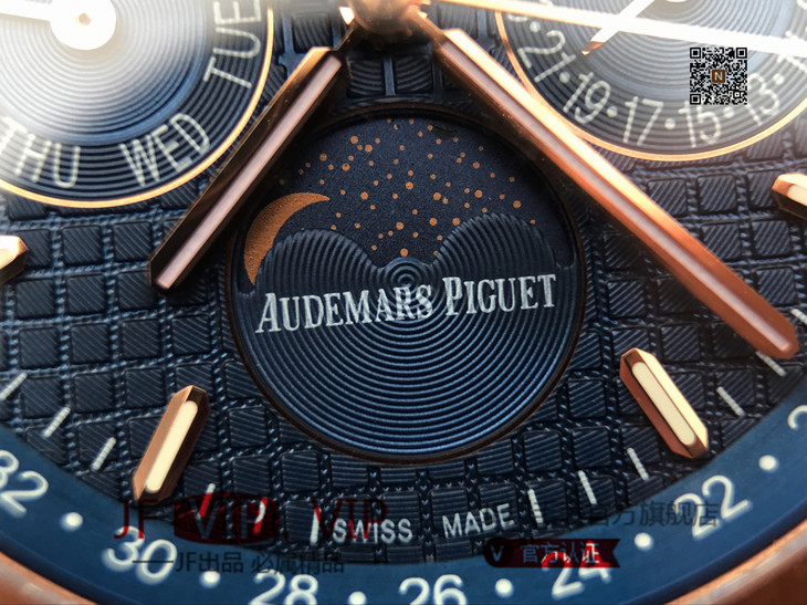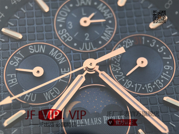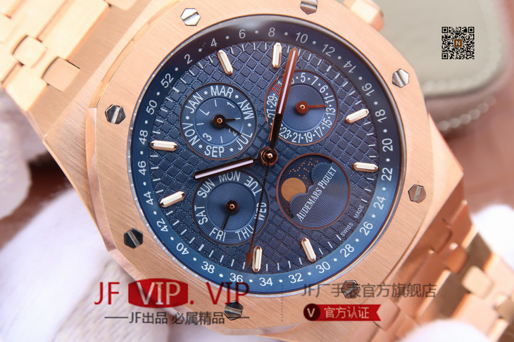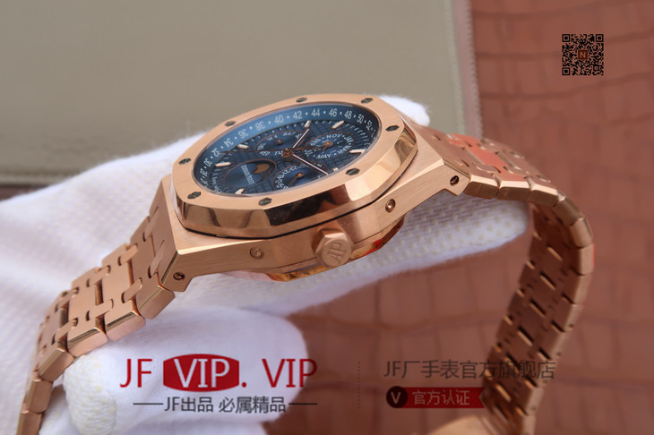 JF爱彼皇家橡树26574。功能:日期显示、星期显示、月份显示、年历显示、万年历、月相进口机克隆原装5134自动机械机芯,