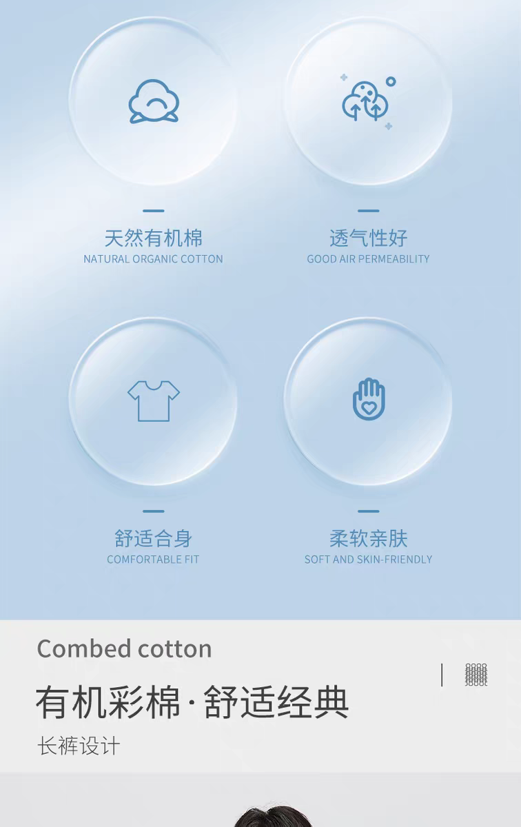 产品卖点:面料采用有机棉,无染色,无荧光剂,无静电,亲肤透气,安全健康。上衣的前短后长,小开叉,圆领的设计修饰脖颈,裤子的贴袋工艺,固定口袋,不跑位,松紧的腰部,细节的优化处理,增强服装整体体验感。