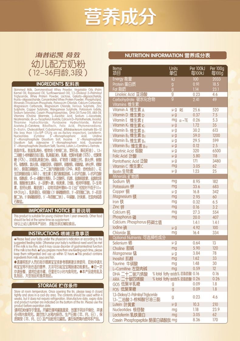 1897荷致系列幼儿儿配方奶粉3段900g