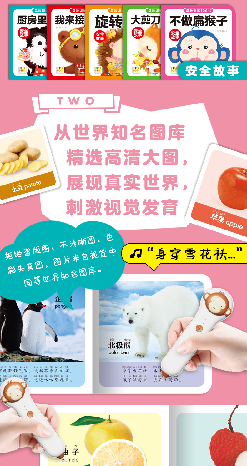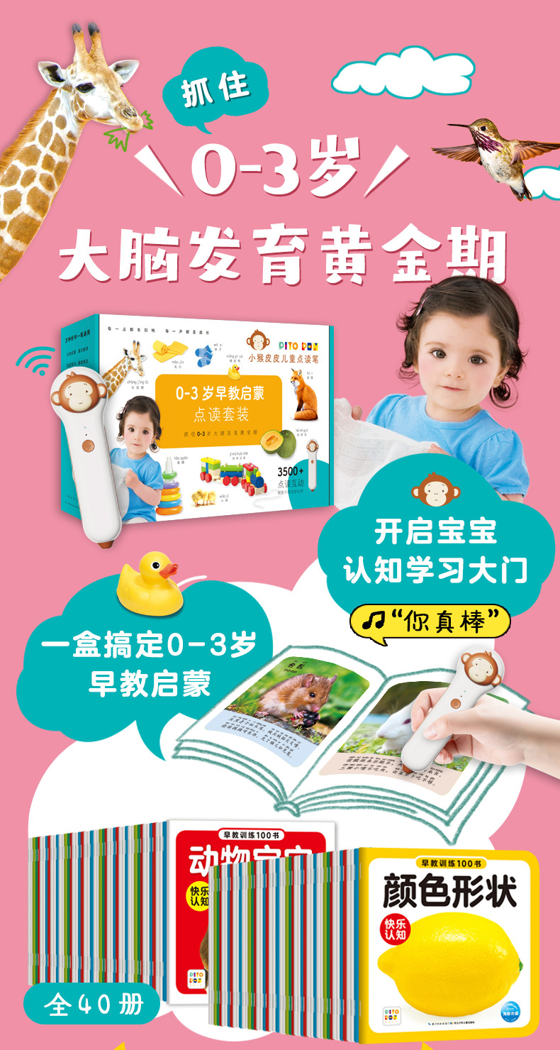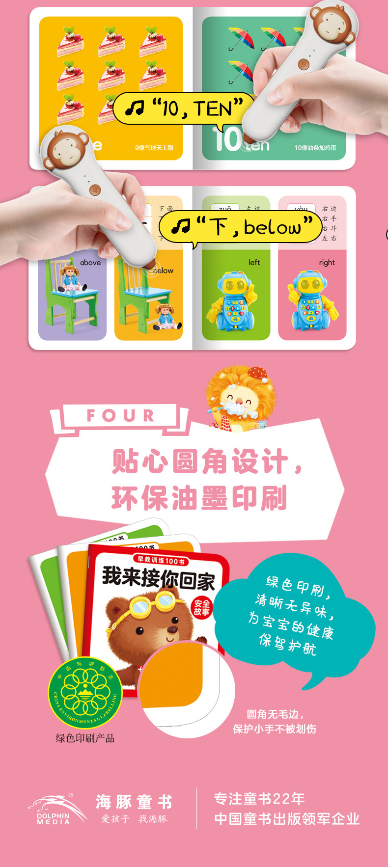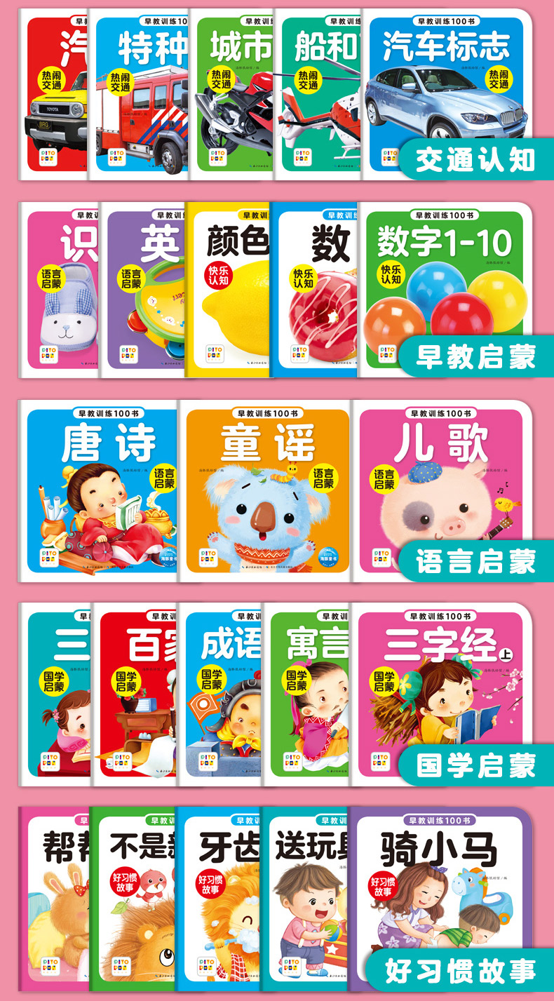 0-3岁是宝宝智力发育的黄金时期,也是宝宝启蒙教育与潜能开发的关键期。抓住这个黄金时期,不仅能让宝宝的认知能力突飞猛进,还能有效提升宝宝的学习兴趣。《早教训练100书》是一套为0-3岁宝宝量身打造的启蒙图书。全书共有20环,合计100册。书中既有动物、自然、交通等认知内容,让宝宝从身边熟悉的事物开启认知大门;又有数学、语言、国学等学习内容,帮助宝宝开启早期的学习之路;还有安全、好习惯、情绪管理等故事,让宝宝从故事中学会好习惯和好品格。书中插图有高清亮丽的实物图以及暖萌可爱的手绘图。色彩鲜艳的实物图可以强化宝宝的视觉刺激,促进其脑神经的发育和听觉、视觉神经的协调发展,进而促进宝宝智能发展。可爱的手绘图,能给宝宝带来美的享受和艺术的熏陶。图书用圆环穿起来,方便翻阅,且易于整理、携带,能带给宝宝轻松、愉悦的阅读体验。图书采用磨圆角设计,贴心保护宝宝小手不手伤,绿色环保大豆油墨印刷,精心呵护宝宝的......