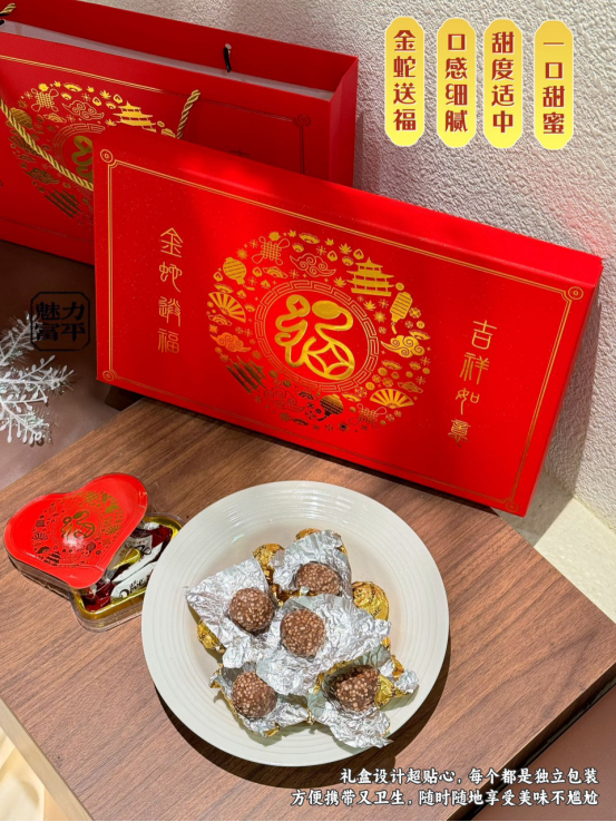 礼盒设计超贴心,每个小零食都是独立包装,方便携带又卫生,随时随地享受美味不尴尬! 送朋友、自留都超合适,这么福气的宝盒,谁能拒绝呢?快来把它收入囊中,让这个新年甜度满分!