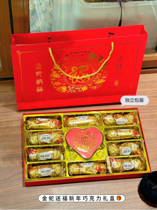 金蛇送福惊喜来啦! 快看这个新年巧克力,颜值爆表,以红金配色象征喜庆与好运,配上金蛇图案,寓意财运滚滚,福气满满。2025年,让这份特别的祝福带来好兆头! 🍫里面藏着德芙巧克力,丝滑浓郁,每一口都是甜蜜暴击!😋再加上30颗vanoost金球巧克力,一整个甜甜蜜蜜~🥤