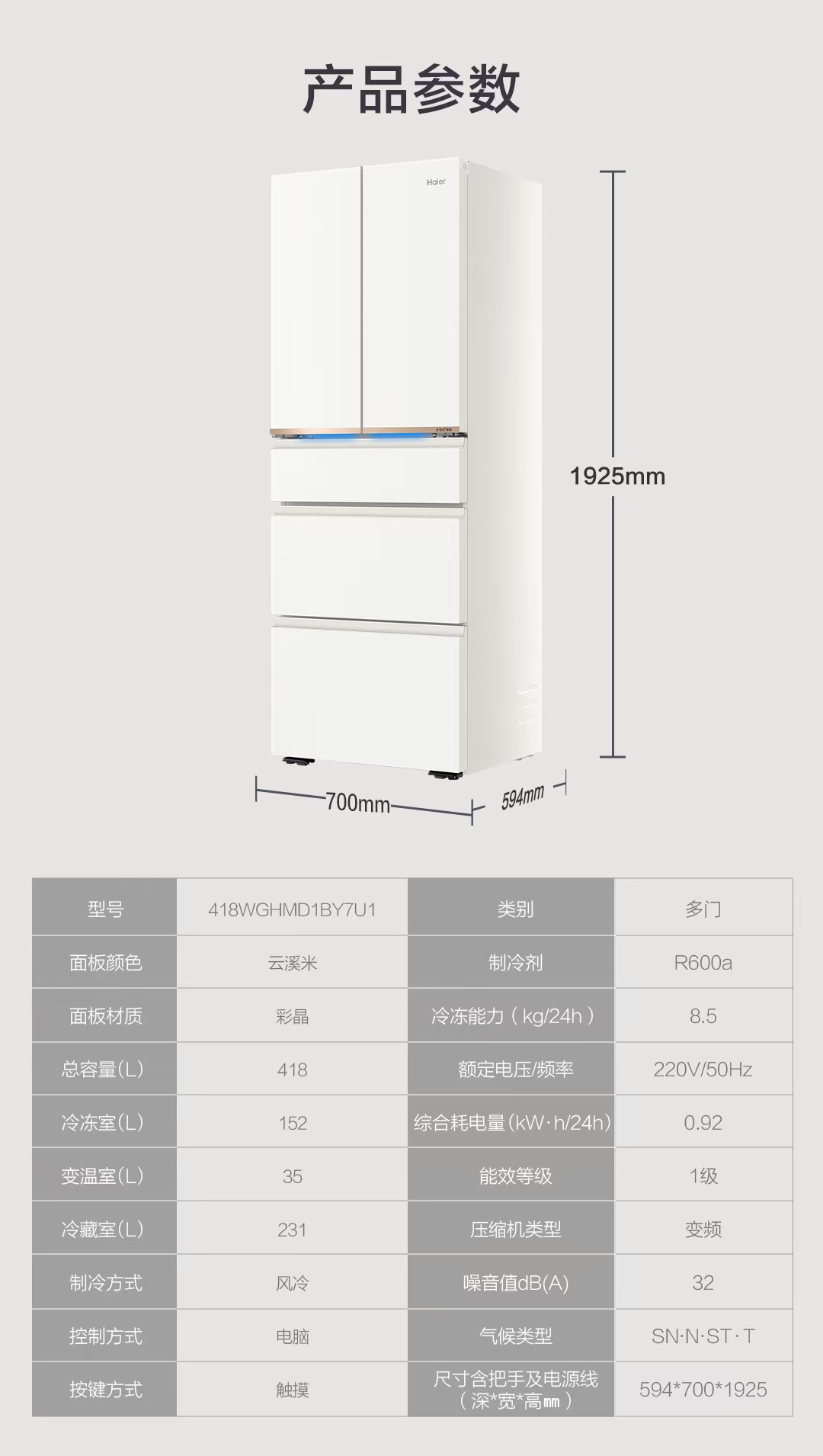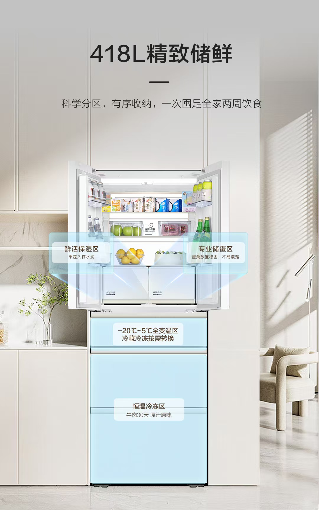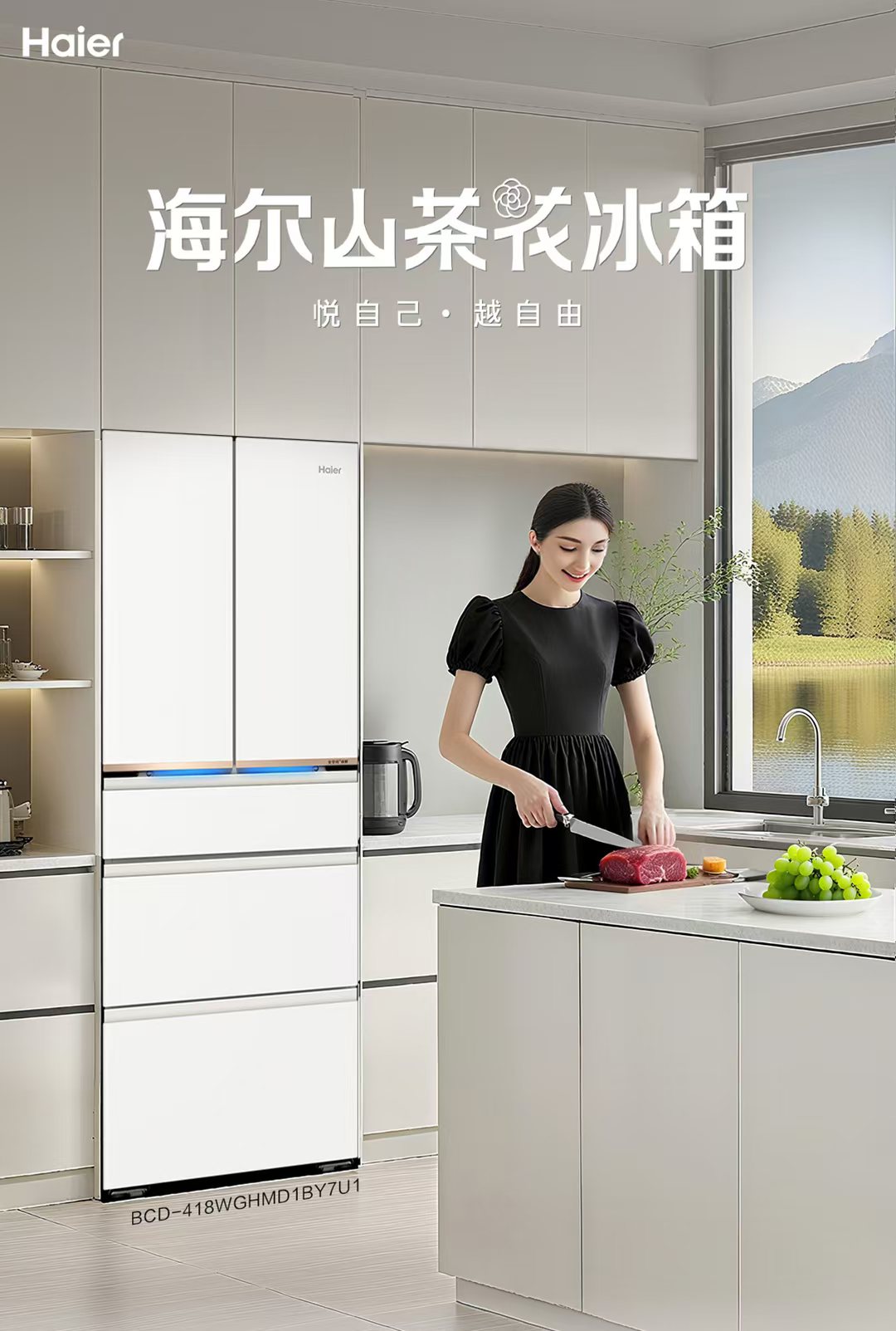 山茶花-海尔冰箱BCD-418WGHMD1BY7U1 全空间保鲜科技 594mm专业超薄零嵌 全温区变温,-20℃~5℃每度可调 多重杀菌,冷藏EPP超净系统,人感把手灯 AI智慧节能 32分贝低噪