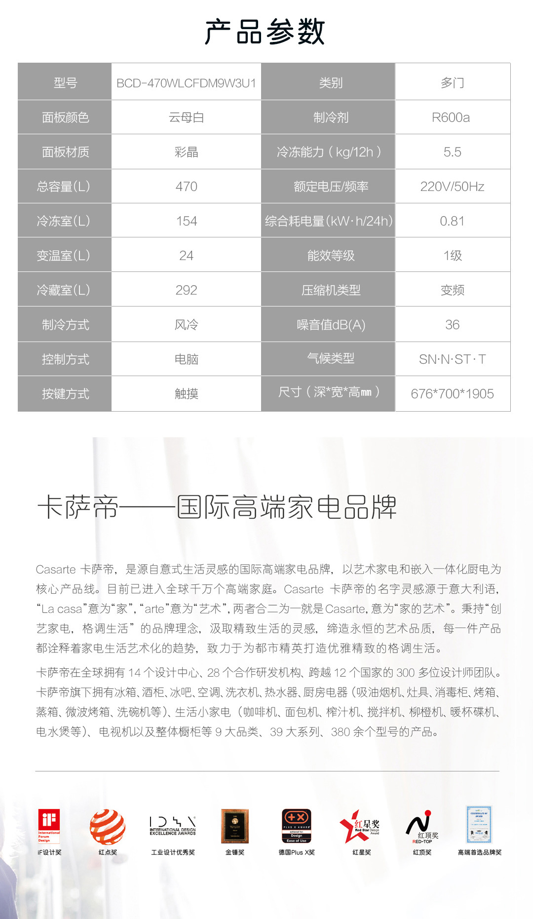 卡萨帝(Casarte)冰箱 BCD-470WLCFDM9W3U1