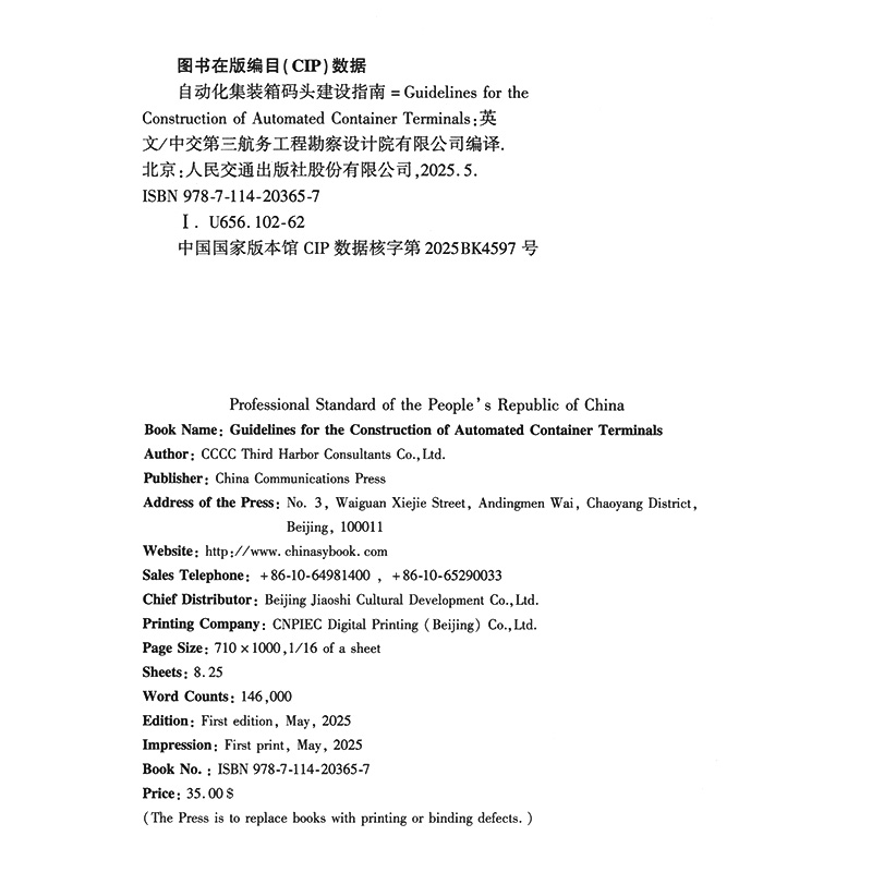 书名:Guidelines for the Construction of Automated Container Terminals(JTS/T 199-2021)《自动化集装箱码头建设指南》英文版