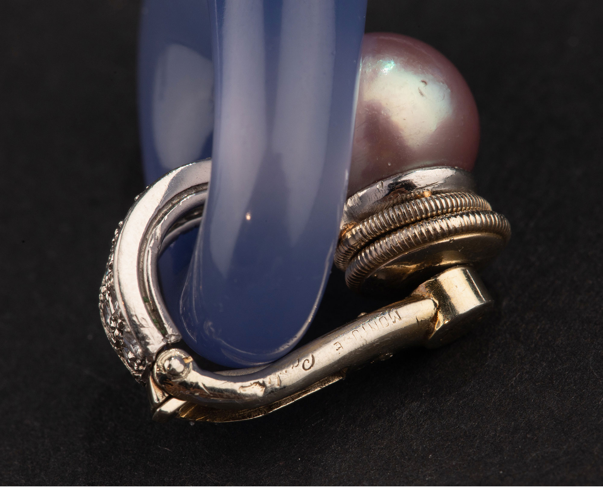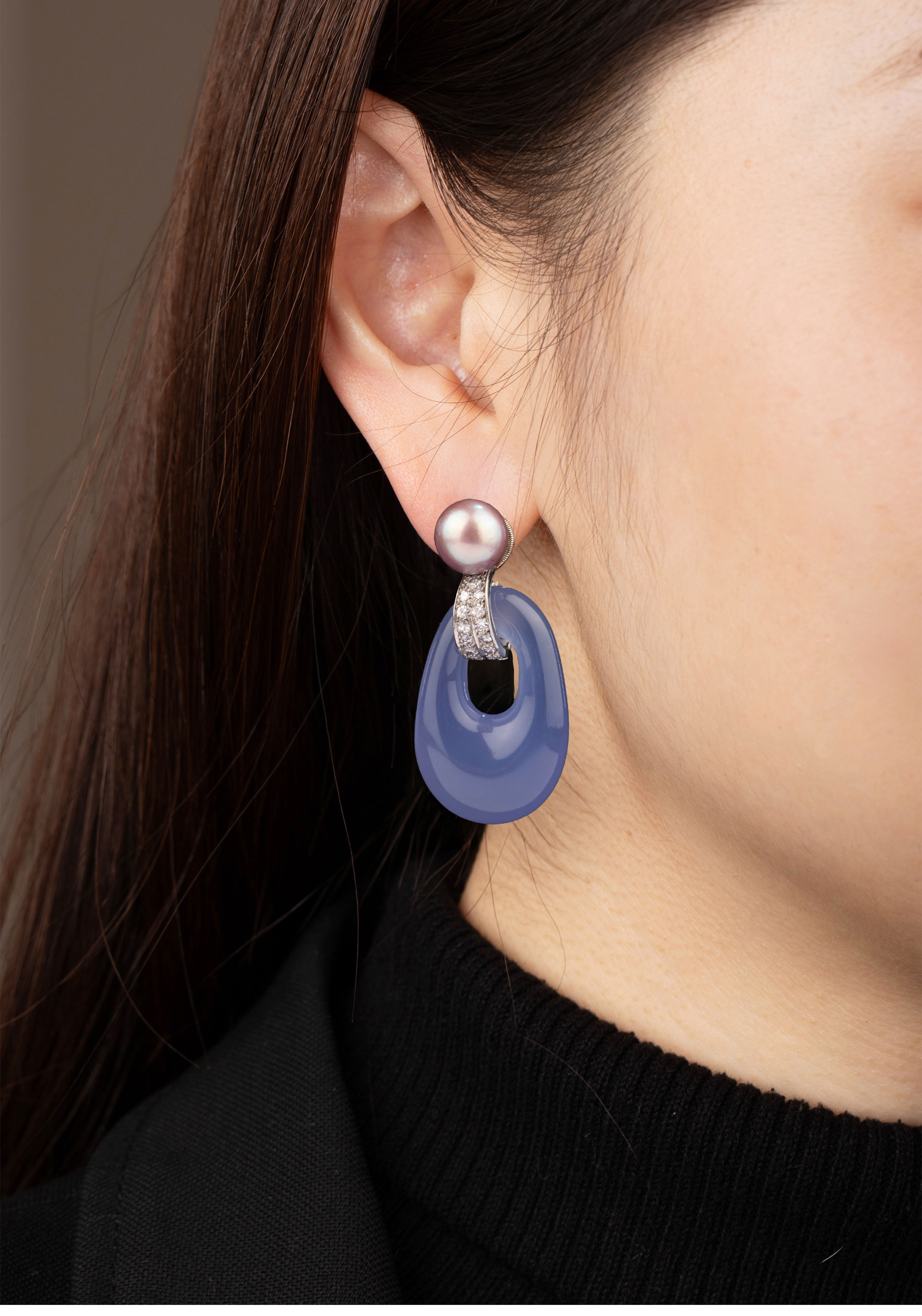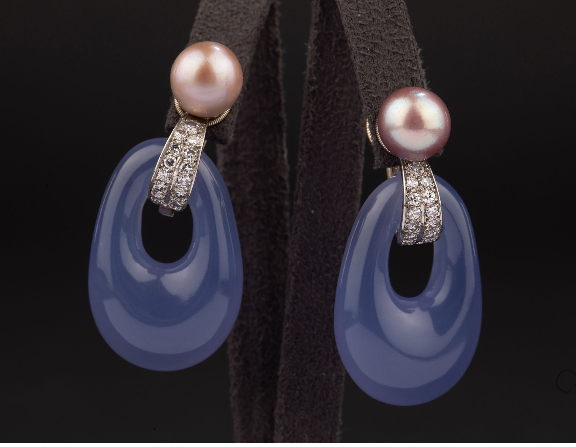 1960年代法国出品铂金镶嵌钻石及天然海水珍珠玉髓耳坠