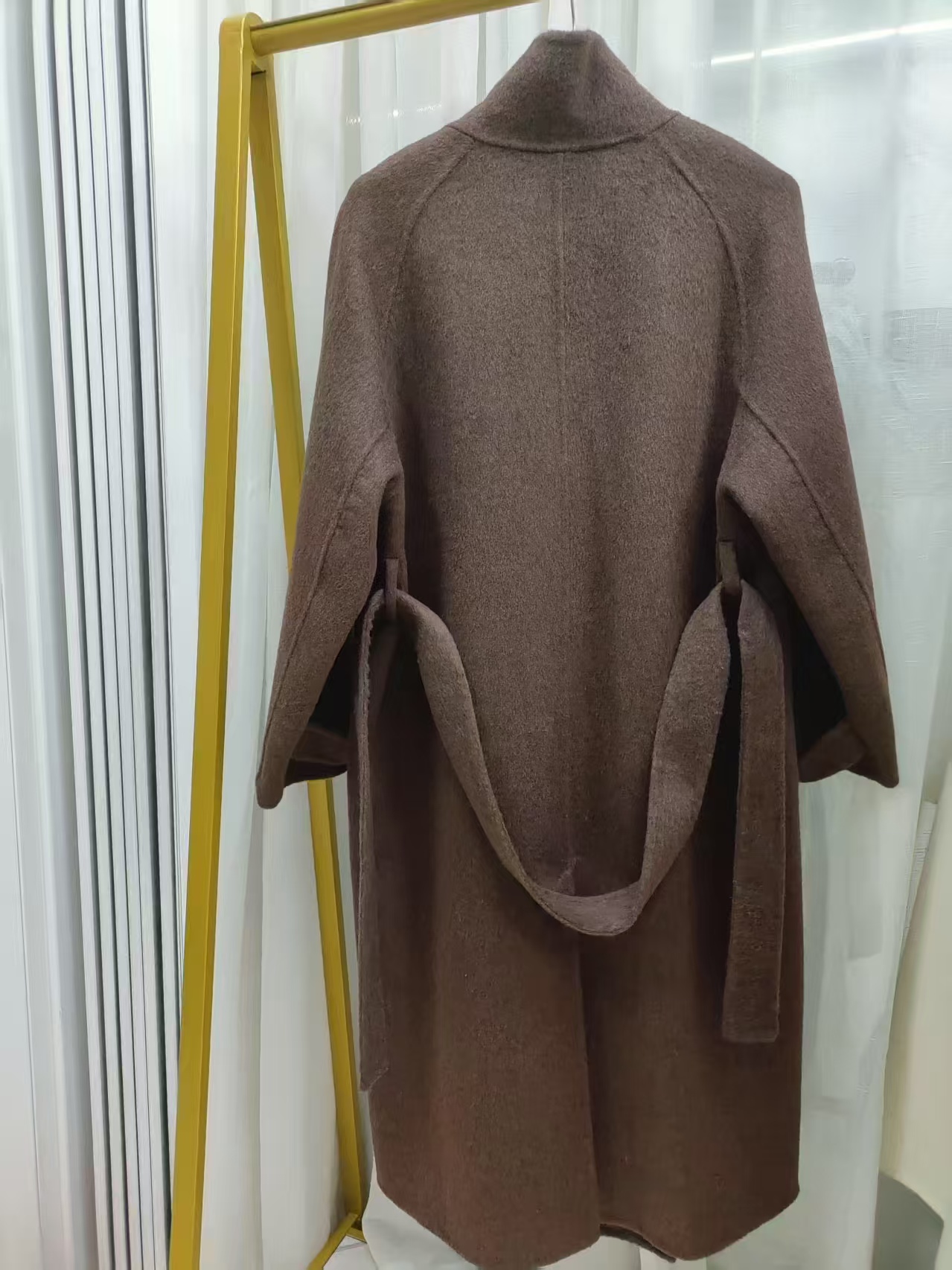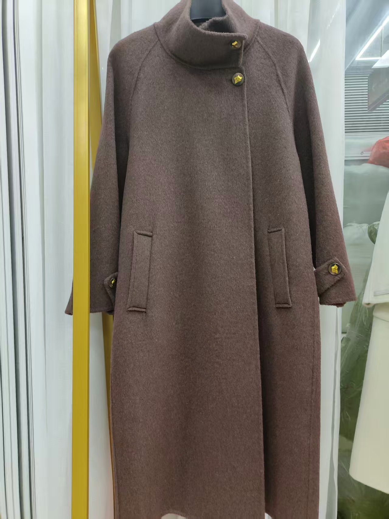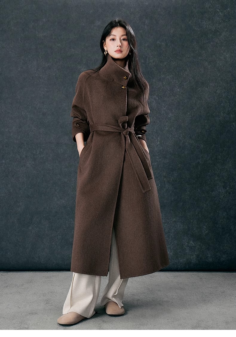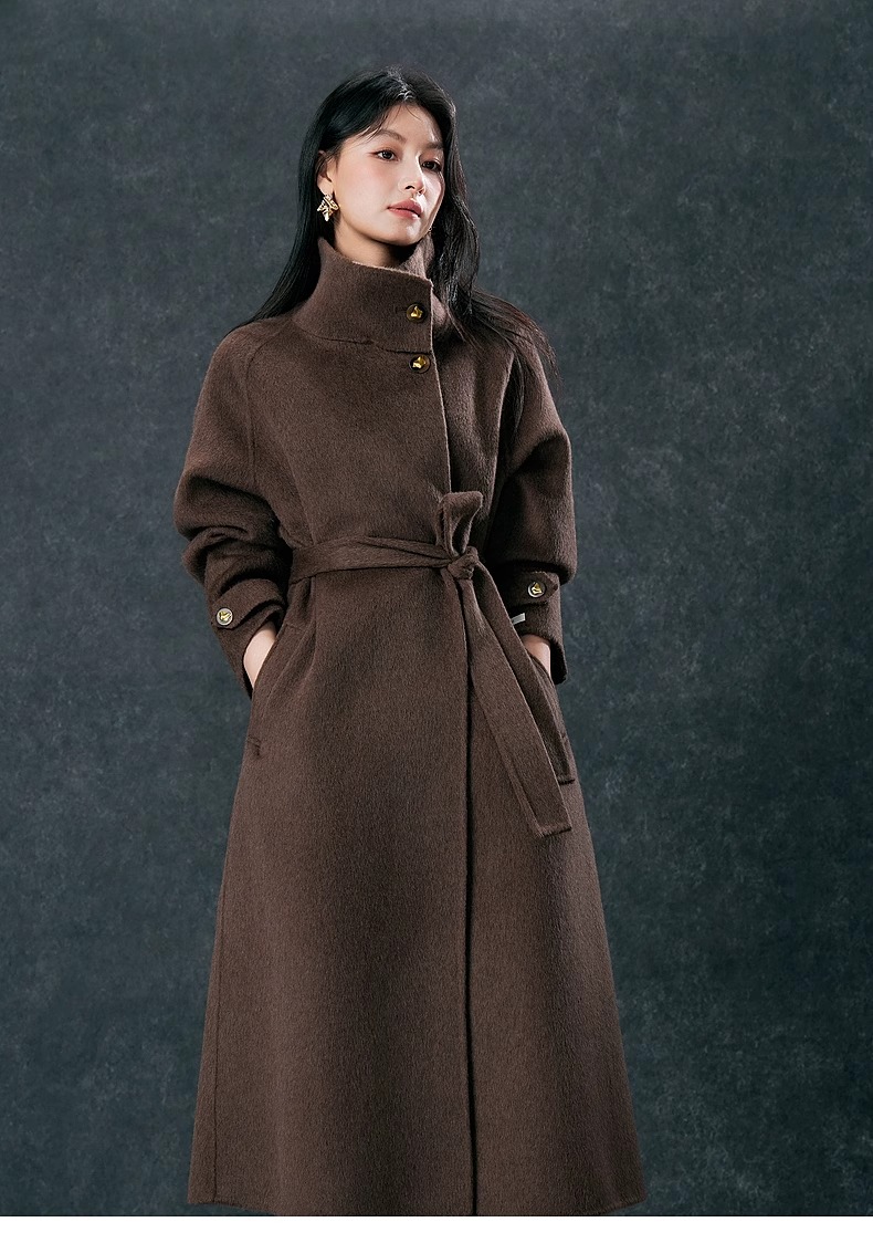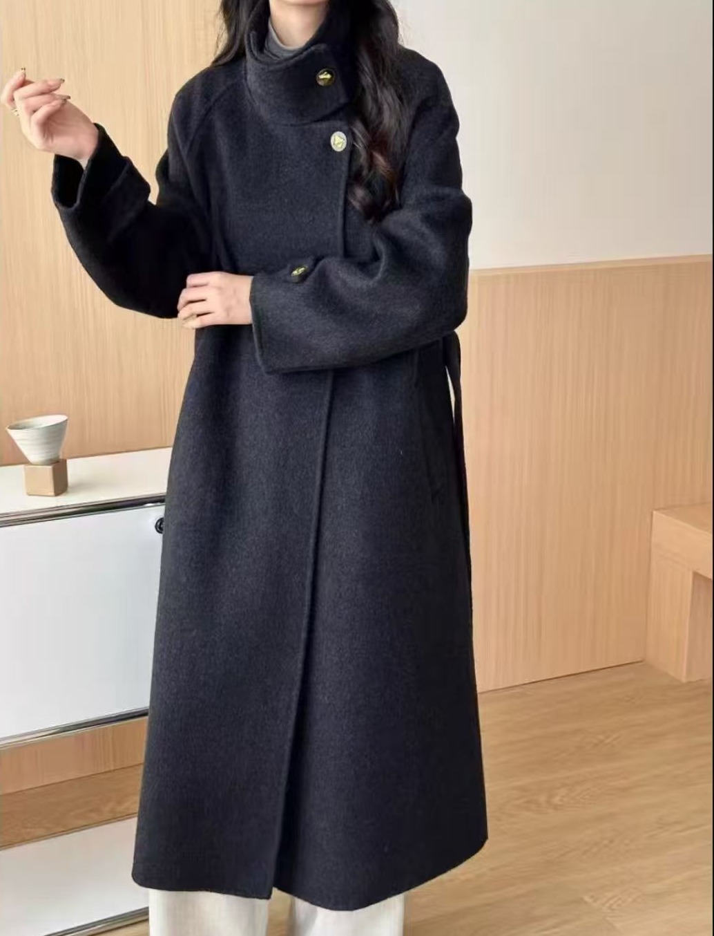 【YW】无忧购立领收腰系带毛呢外套长款绵羊毛双面呢8801水晶扣(截单后3-5天发货)