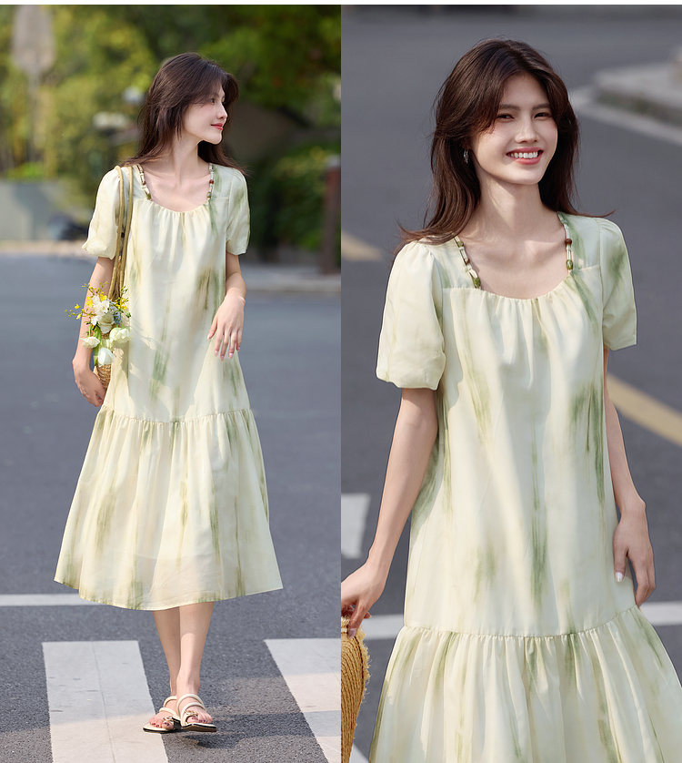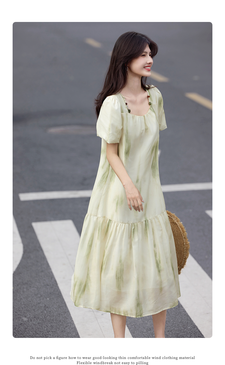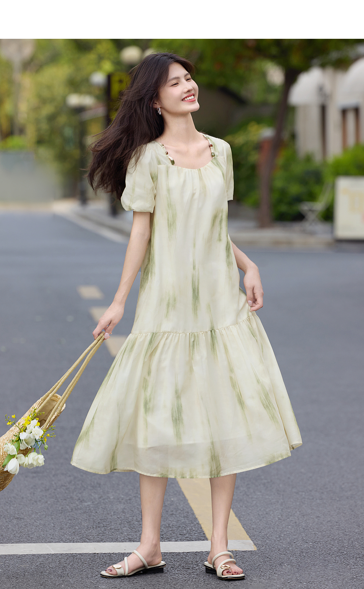 【专属特价】熙世界轻国风晕染方领连衣裙2025夏新款灯笼袖宽松雪纺蛋糕裙子