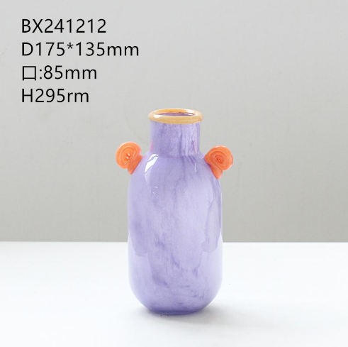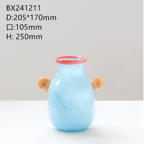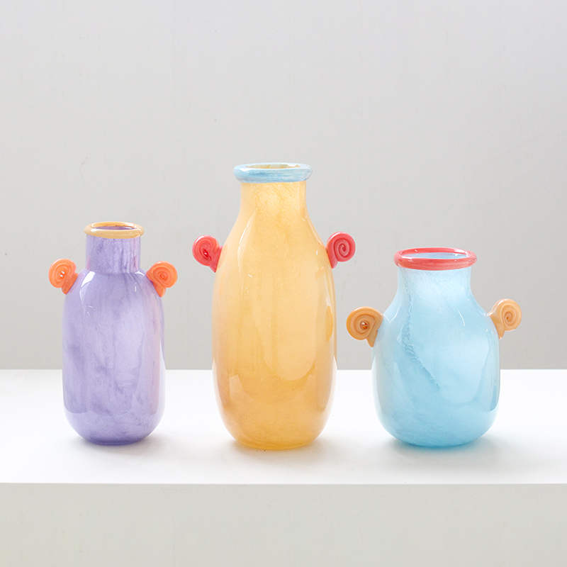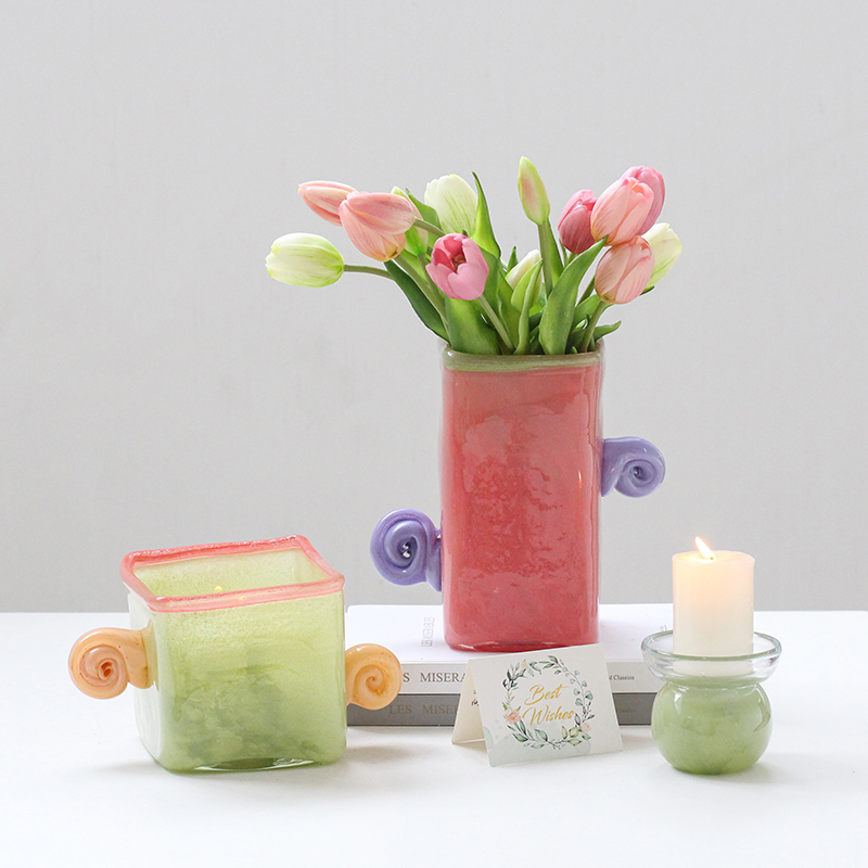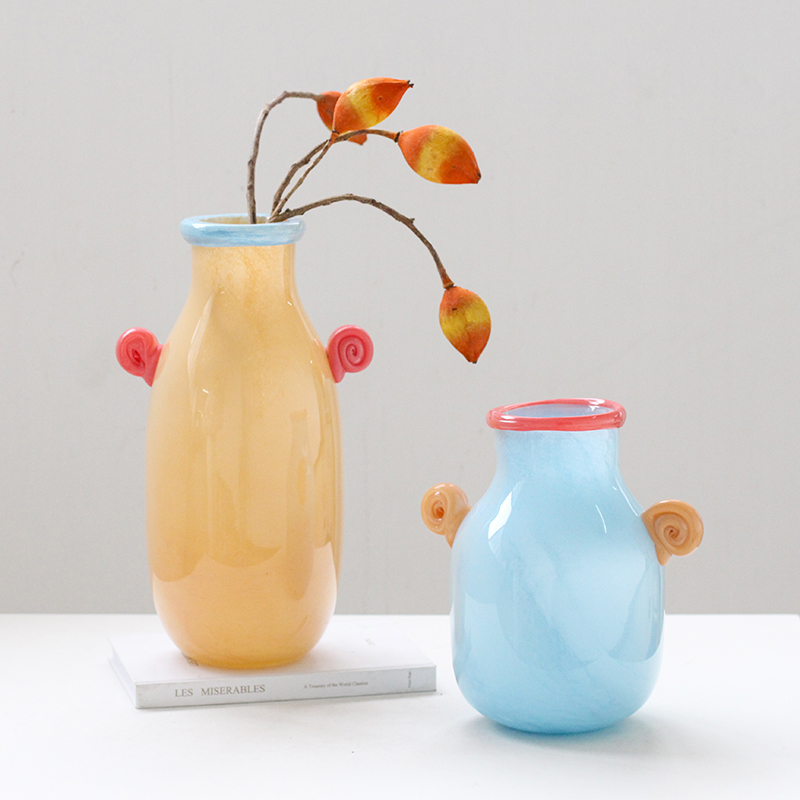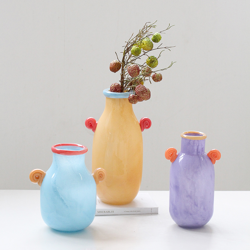 北欧创意双耳糖果色手工可爱花瓶鲜花餐桌电视柜多巴胺装饰玻璃瓶