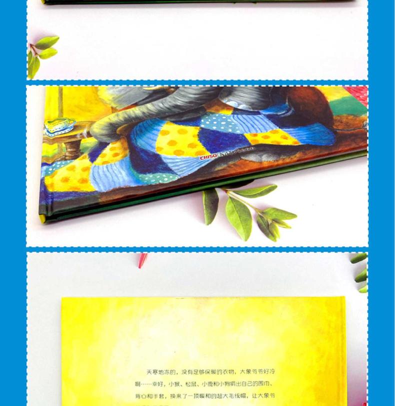 天寒地冻的,没有足够保暖的衣物,大象爷爷好冷啊....幸好,小猴、松鼠、小鹿和小狗捐出自己的围巾、背心、和手套,换来了一顶暖和的超大毛线帽,让大象爷爷得到了温暖。