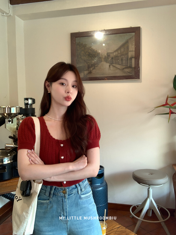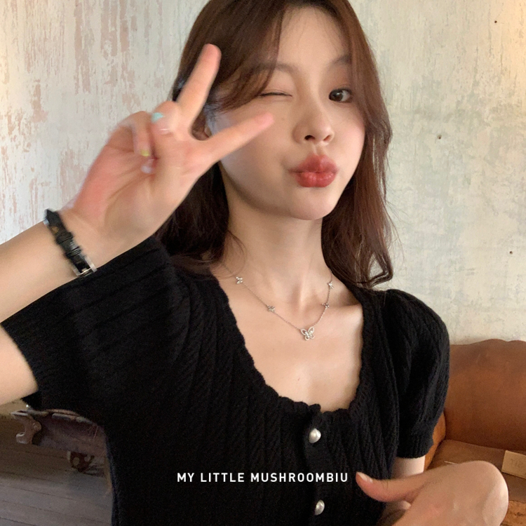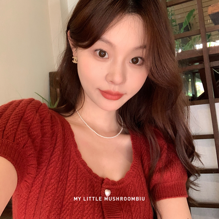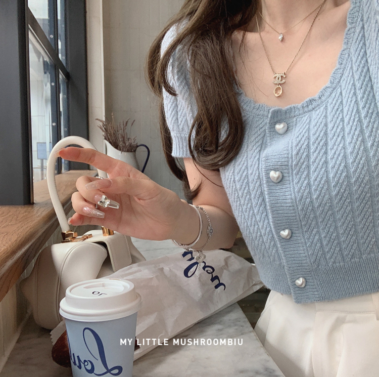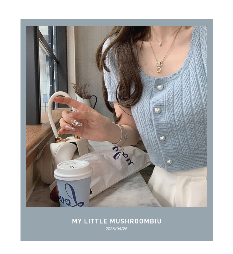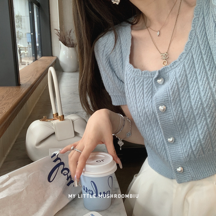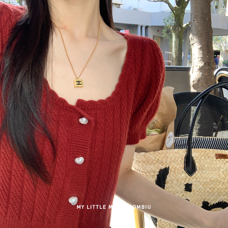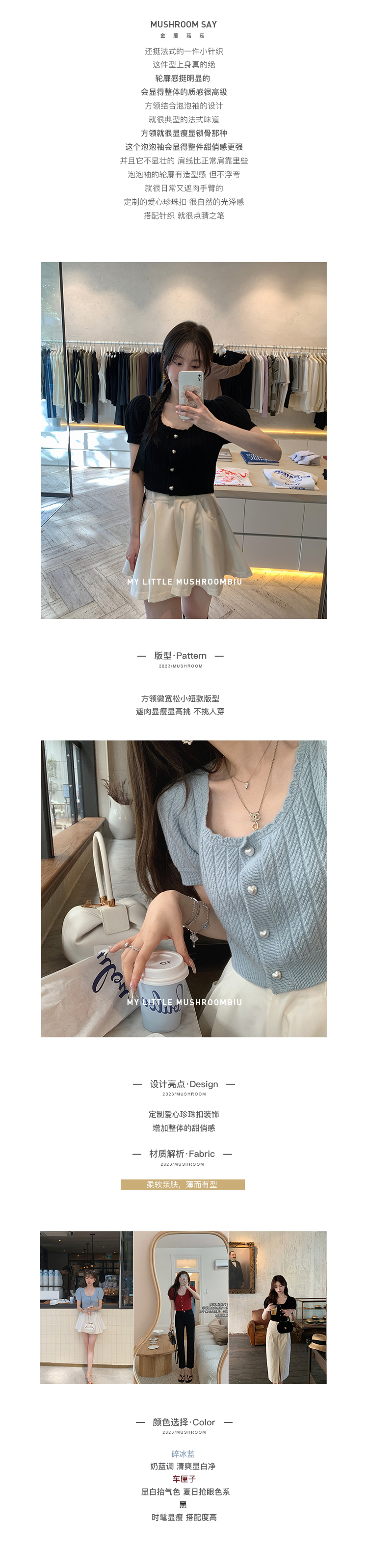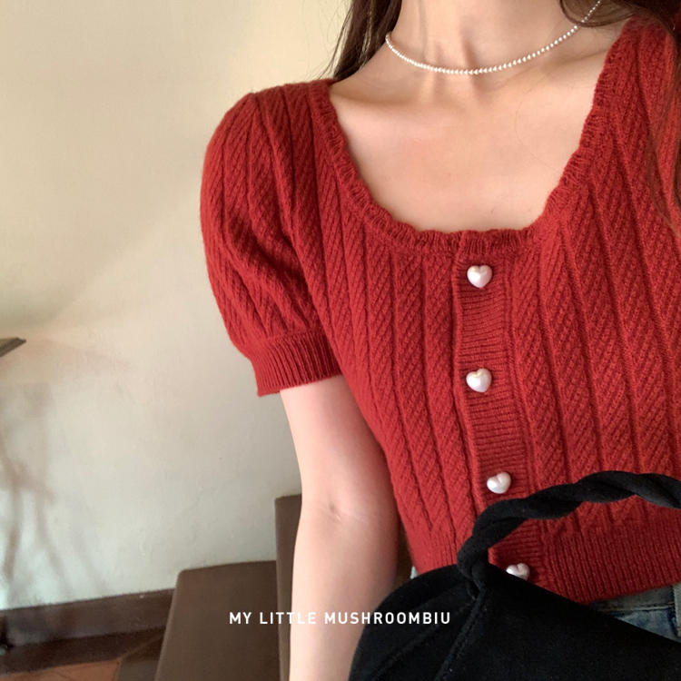 XS码 金蘑菇菇 雀跃 爱心小针织 /轻甜法式方领微宽松小短款针织上衣