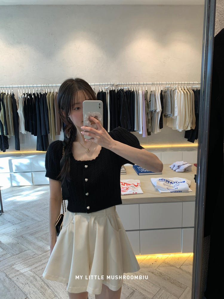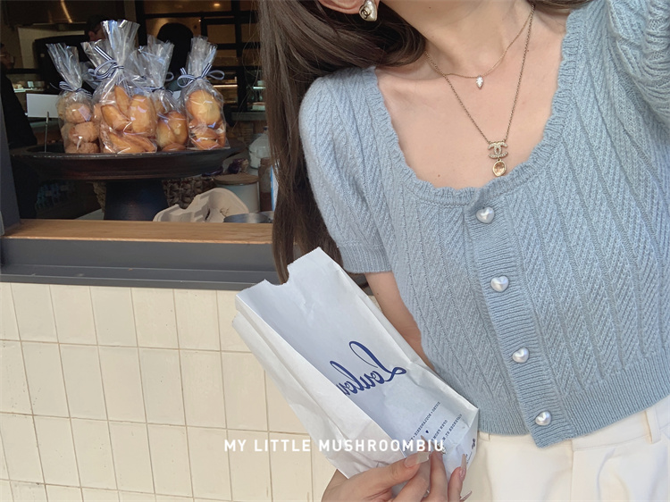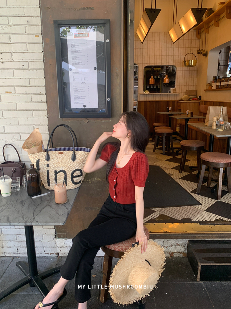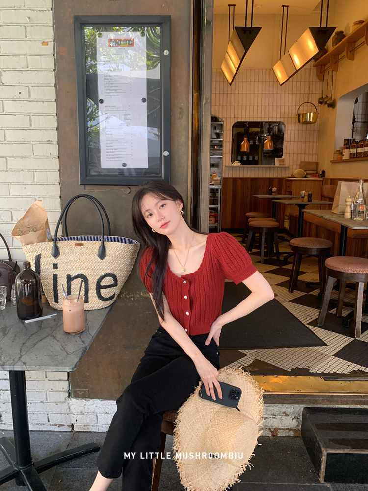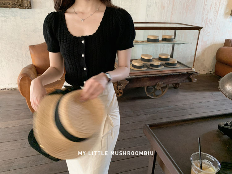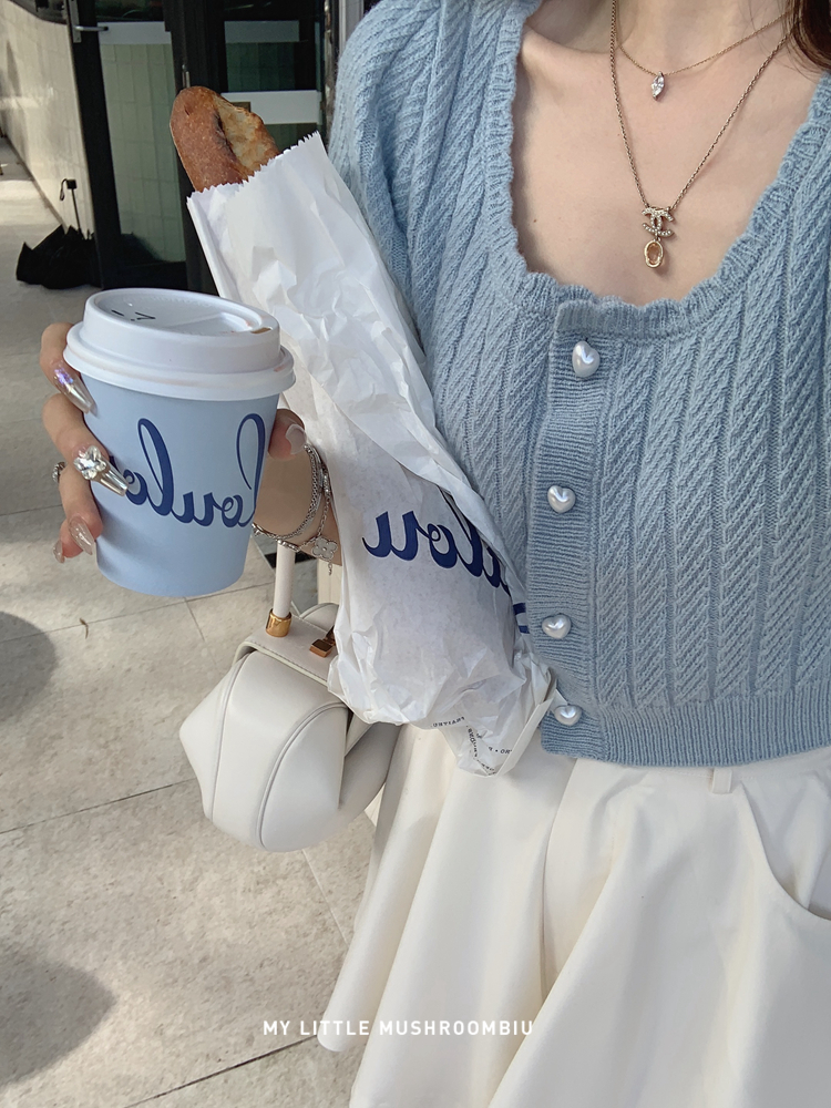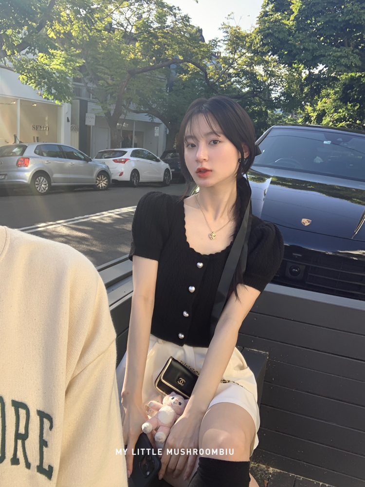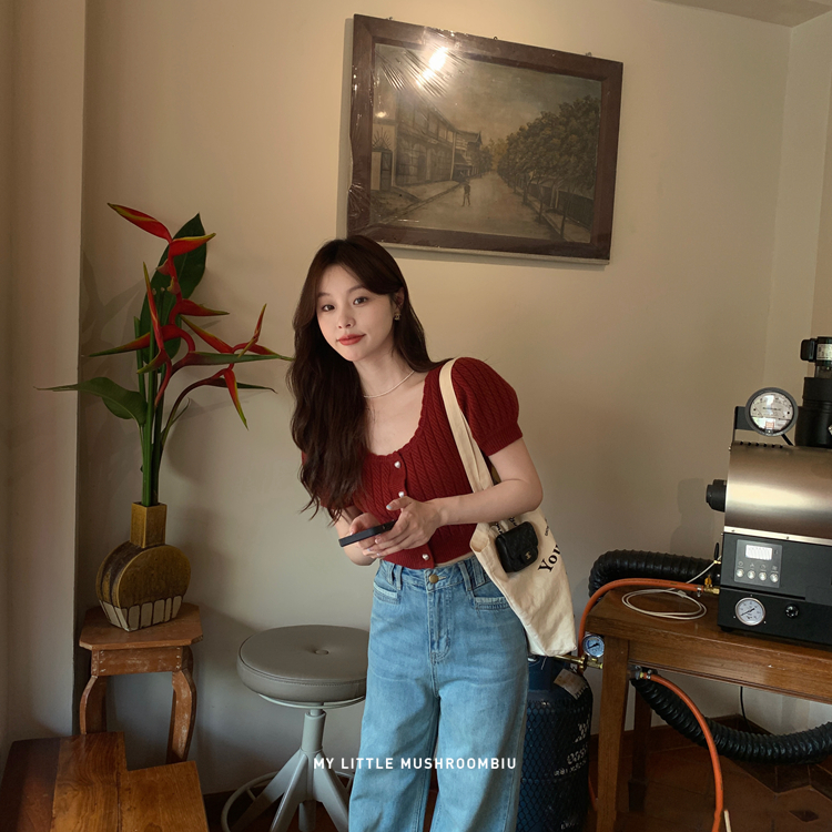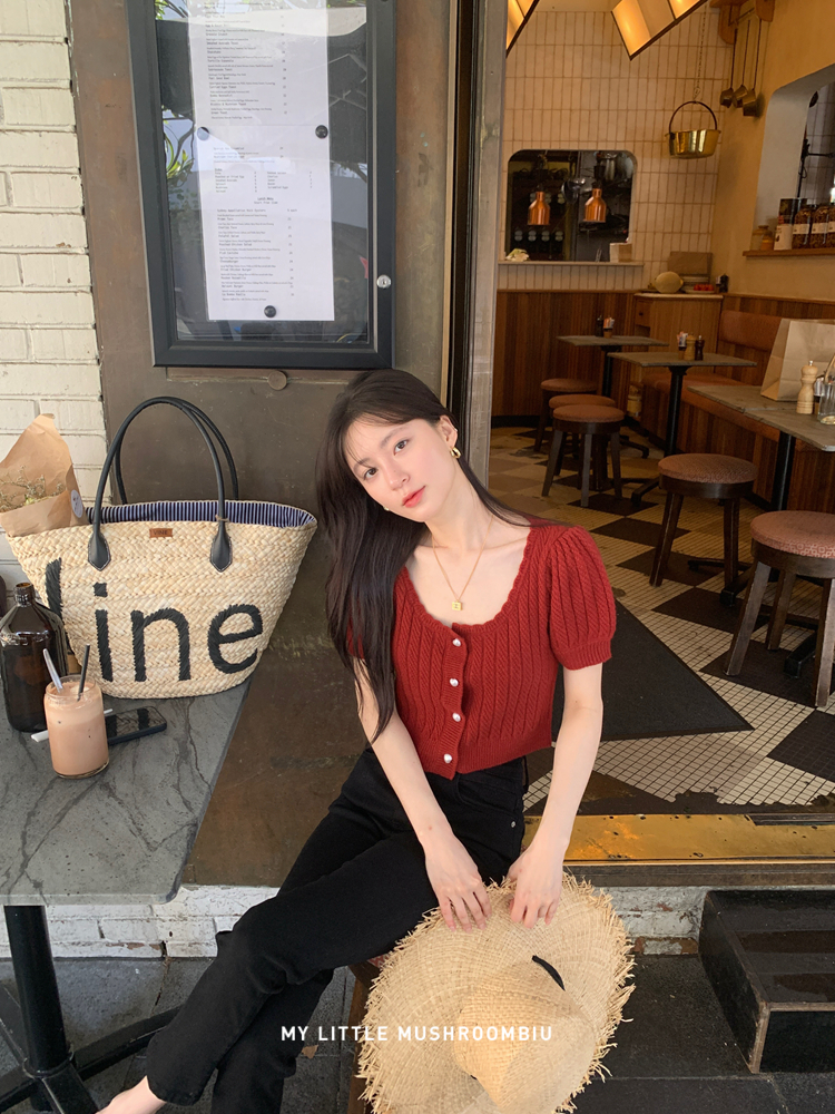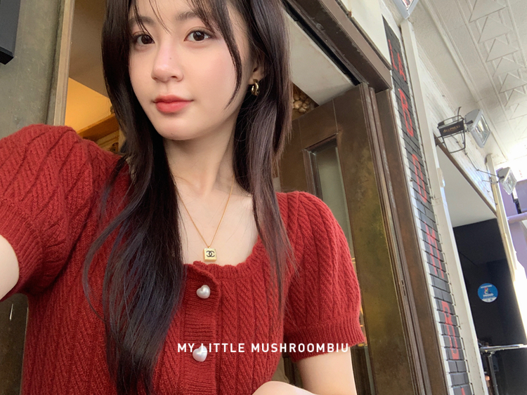 XS码 金蘑菇菇 雀跃 爱心小针织 /轻甜法式方领微宽松小短款针织上衣