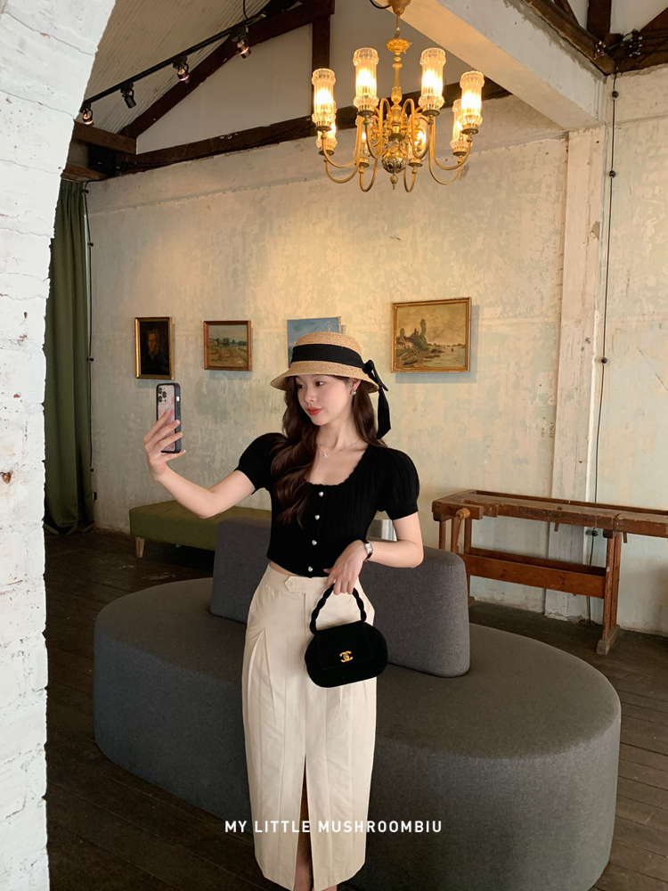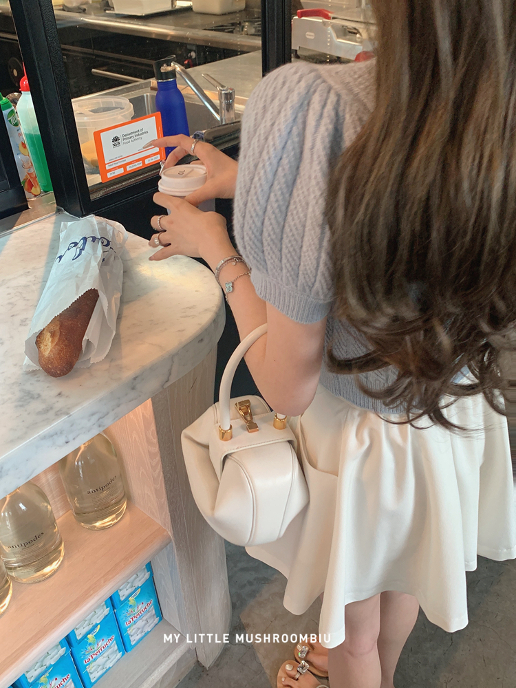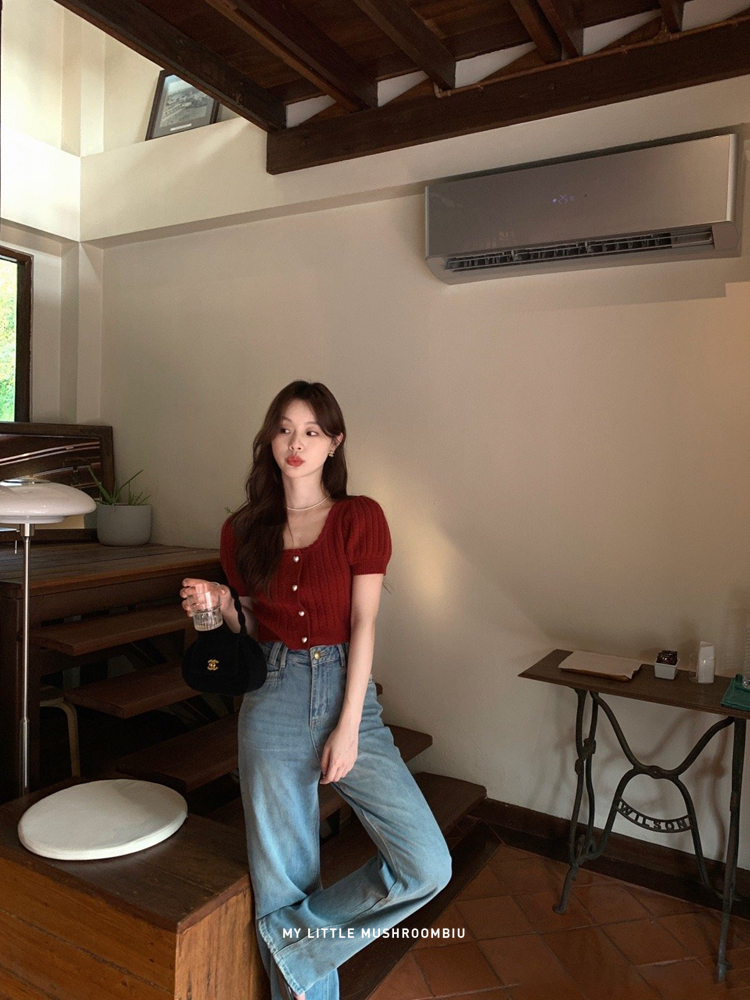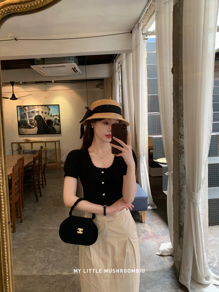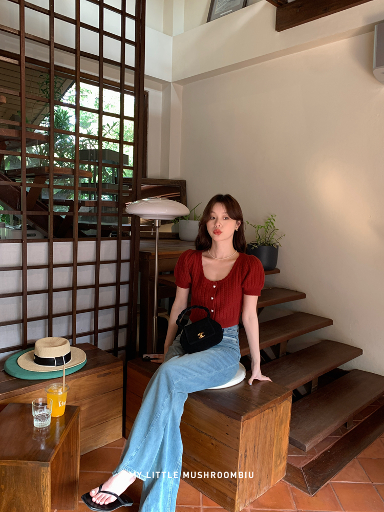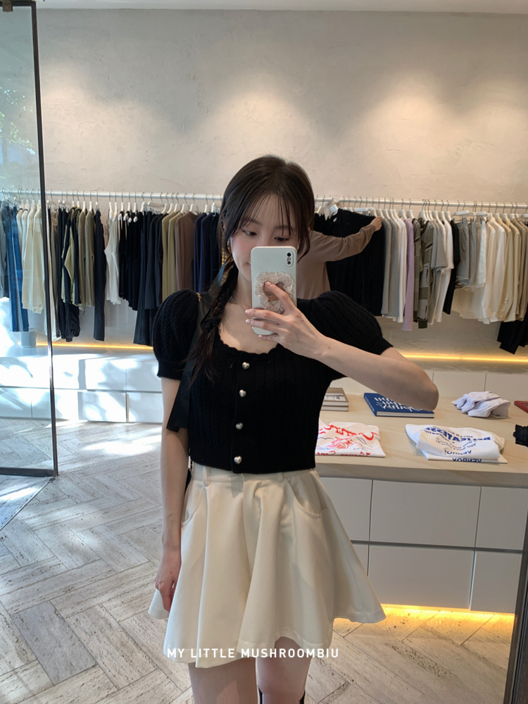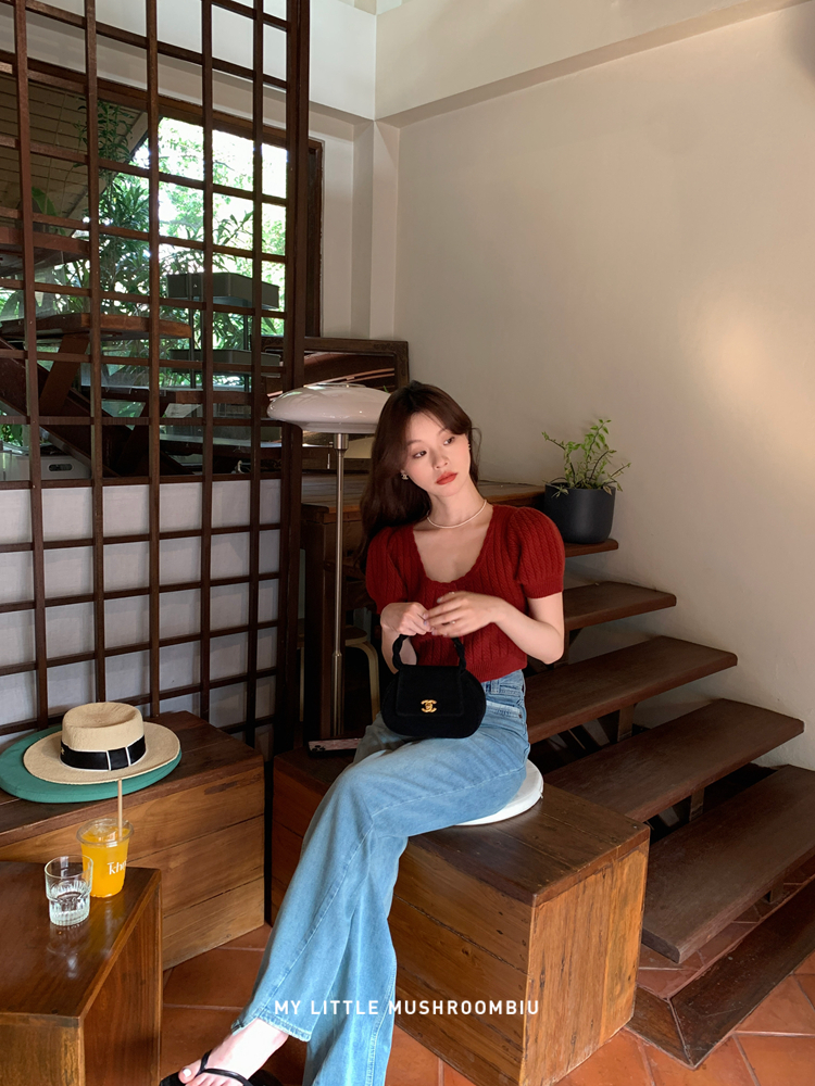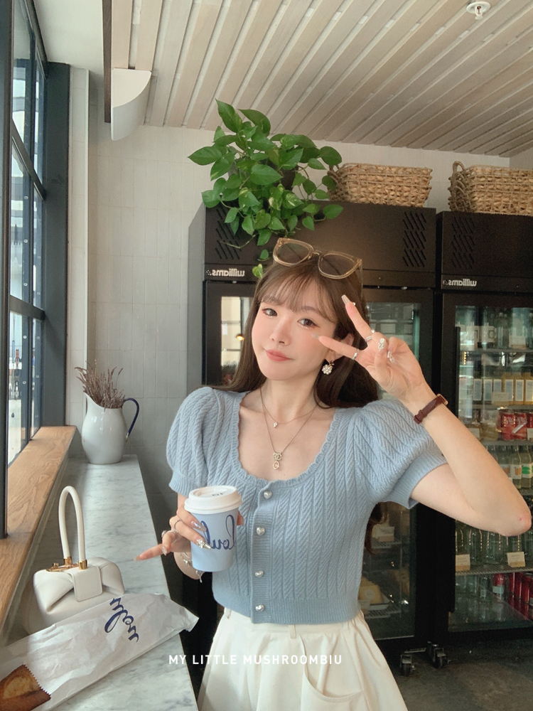 XS码 金蘑菇菇 雀跃 爱心小针织 /轻甜法式方领微宽松小短款针织上衣