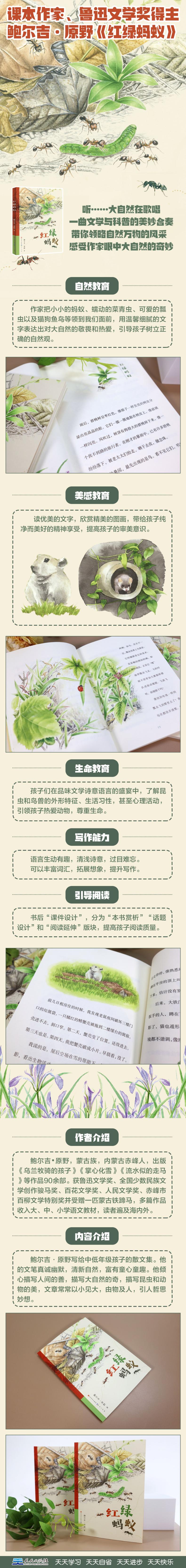 热爱自然,尊重动物作家把小小的蚂蚁、蠕动的菜青虫、可爱的瓢虫以及猫狗鱼鸟等领进书中,表达出对大自然的敬畏和热爱,对生活在大自然中所有生命的爱与尊重提高孩子表达能力文字生动有趣,清浅诗意,许多语言读一遍就能深深记住,并且能够给人复述出来,锻炼孩子的语言表达能力,拓展孩子的词汇量开阔孩子的视野这部作品是一曲文学与科普的美妙合奏,让孩子们在品味文学诗意语言的盛宴中,了解昆虫和鸟兽的外形特征、生活习性,甚至心理活动,开阔孩子视野,引领孩子们生发对人生的感悟和思考。引导孩子学会观察书后增加“课件设计”,分为“本书赏析”“话题设计”和“阅读延伸”版块,提高孩子阅读质量,引导孩子学会观察生活