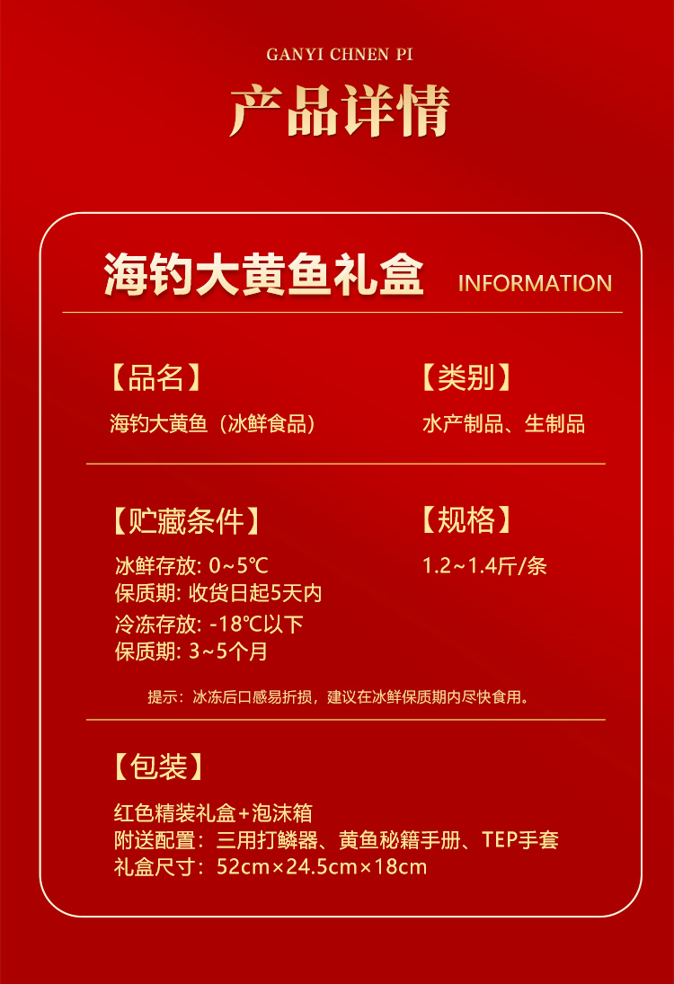 ★最佳品尝方式:到货后将闽东壹鱼配送泡沫箱内的冰袋置于按照10:1(水:盐)进行配比的淡盐水中,待水温降至-5℃后,放入宰杀干净的大黄鱼,腌制20分钟,口感更佳。