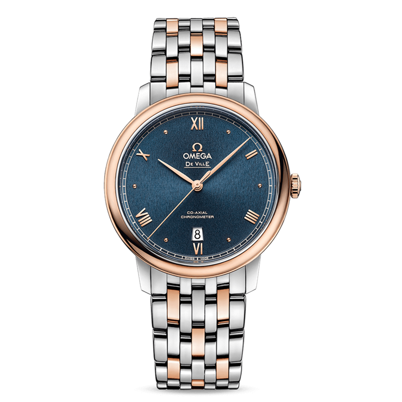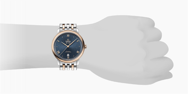 镜面材质 | 蓝宝石水晶玻璃 | 表盘 | 精钢 18K玫瑰金表壳,饰以垂直压纹元素,其上设有经蓝色PVD处理的太阳光芒射线表盘,环绕“轨道式”分钟圈。腕表的6点位置设有日历窗,欧米茄品牌标识、间隔出现的罗马数字与弧面形小时刻度,以及指针均采用镀红色18K金制成。 密底 |