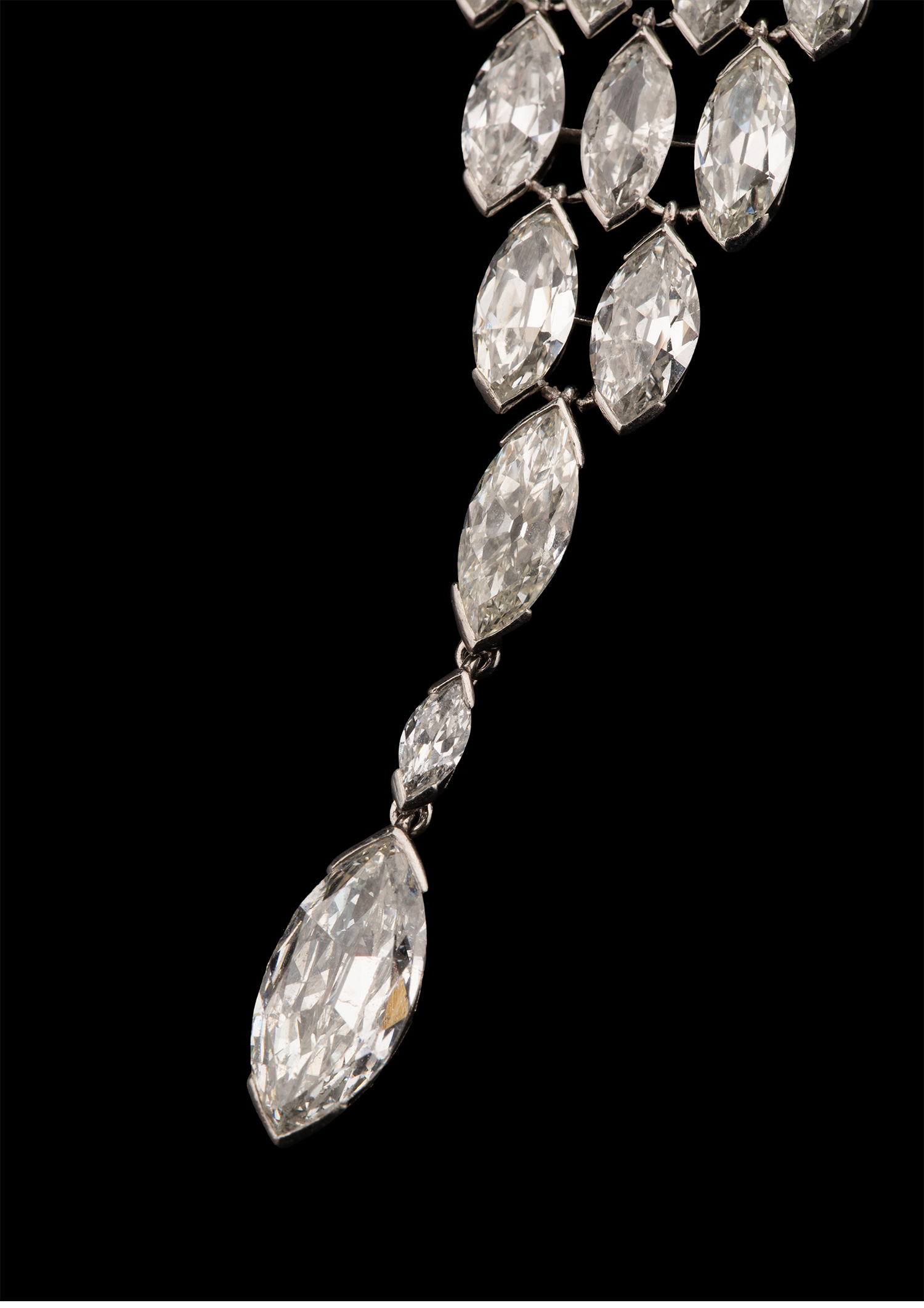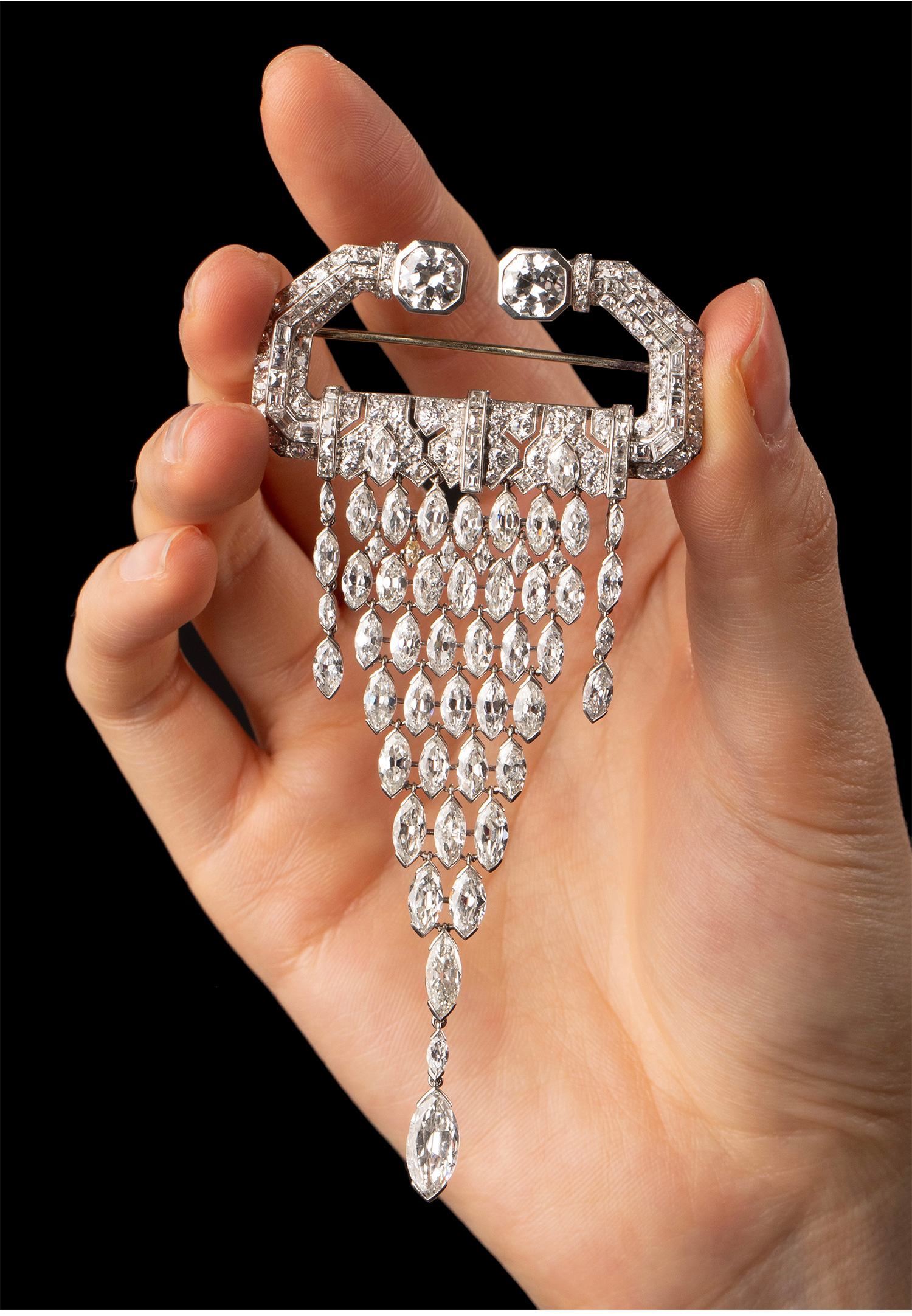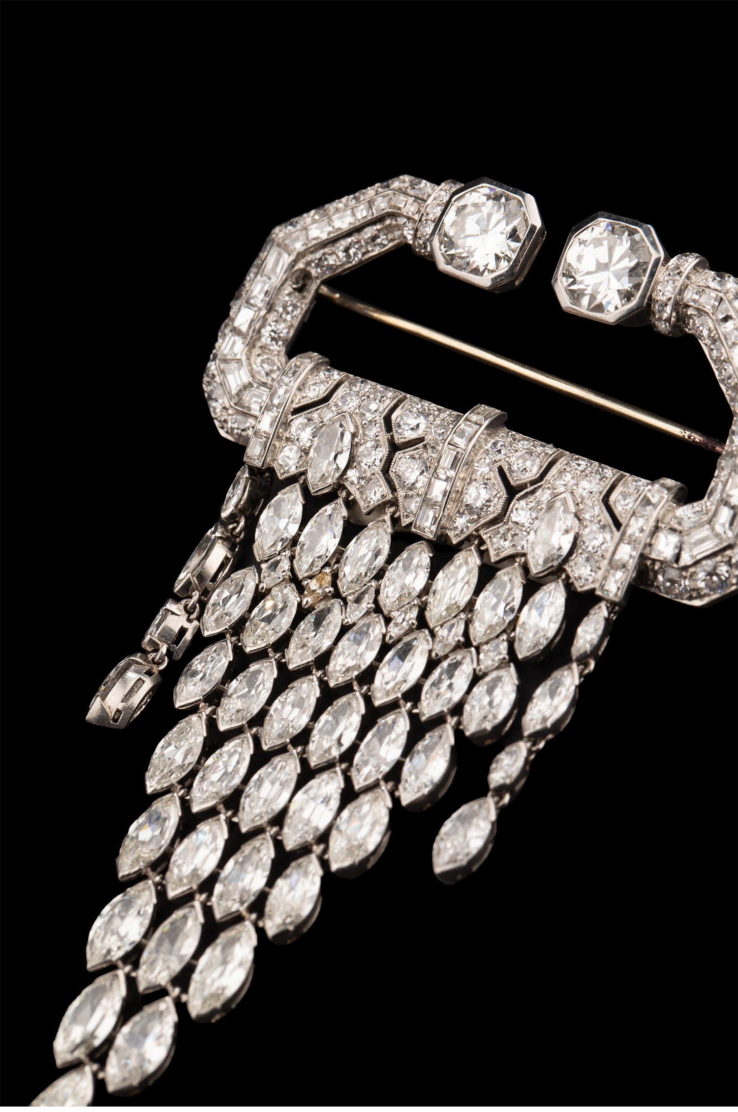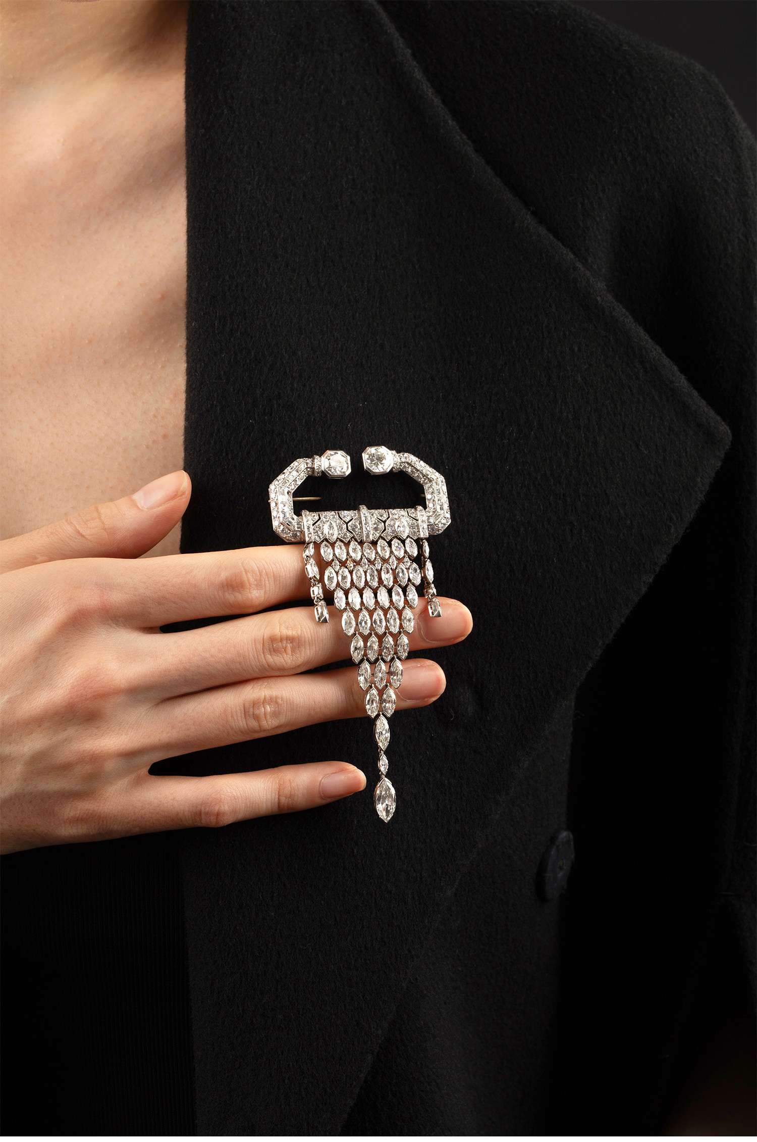 1930年代法国出品装饰艺术风格铂金镶嵌钻石流苏珠帘造型胸针