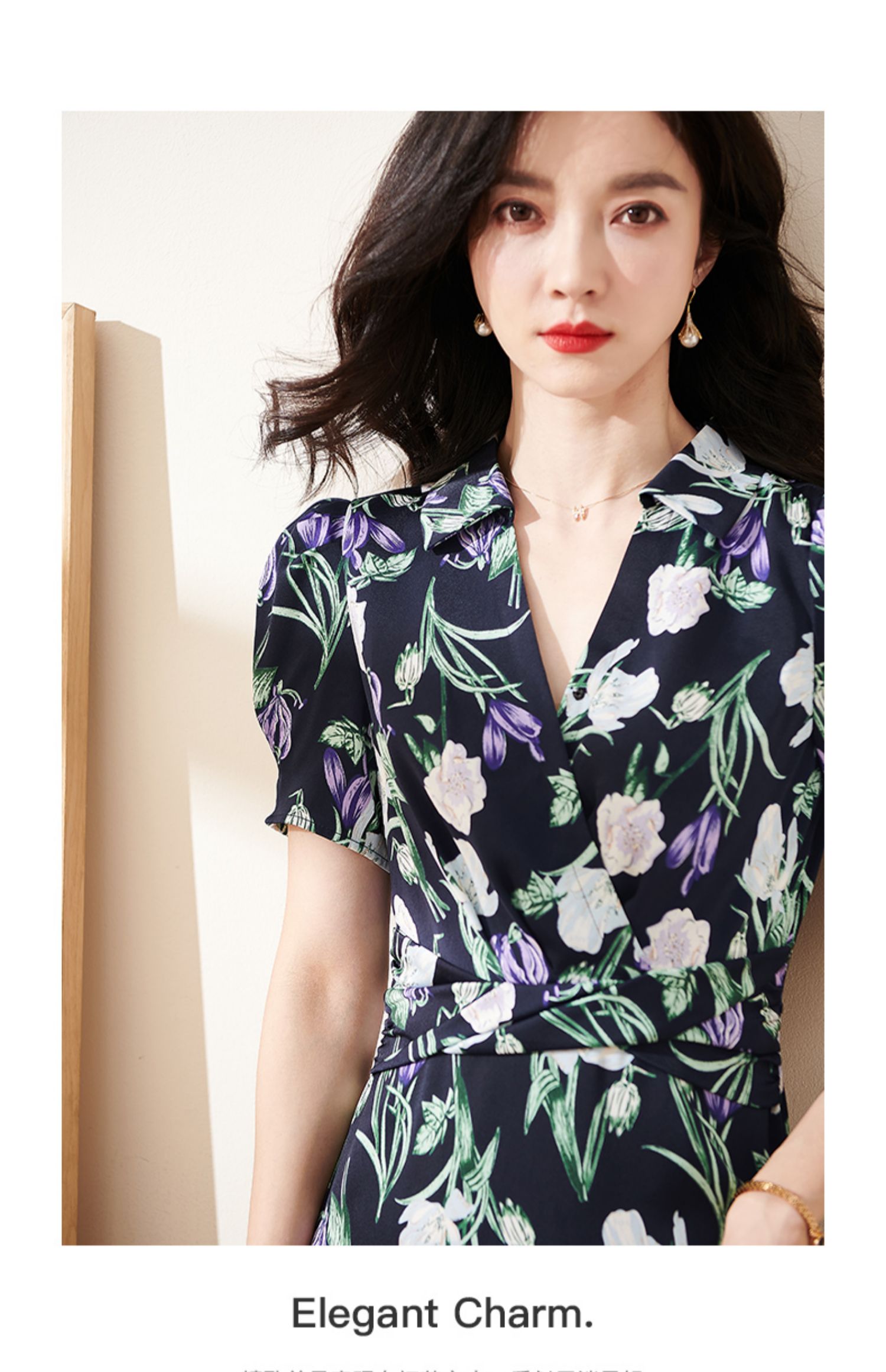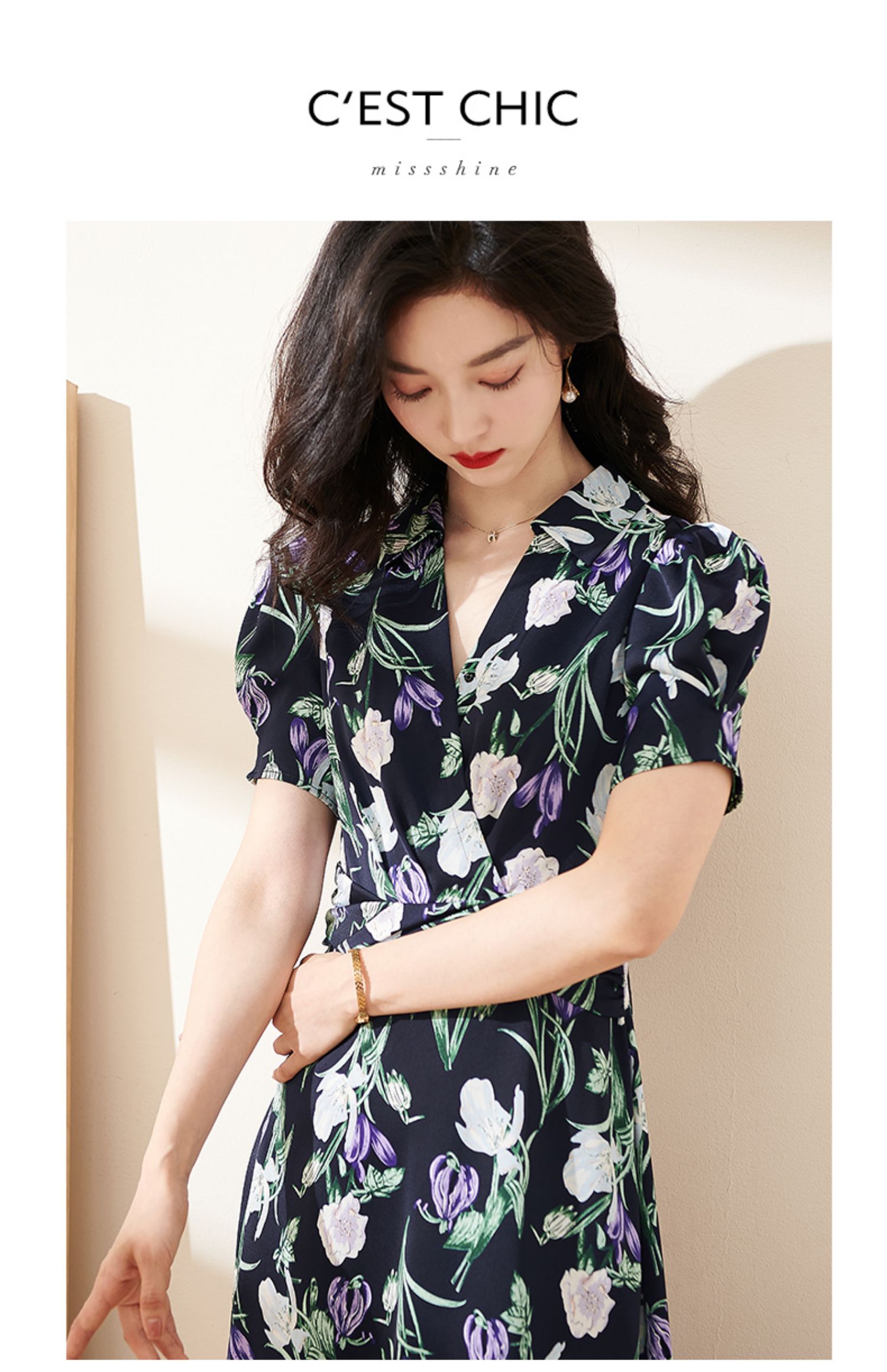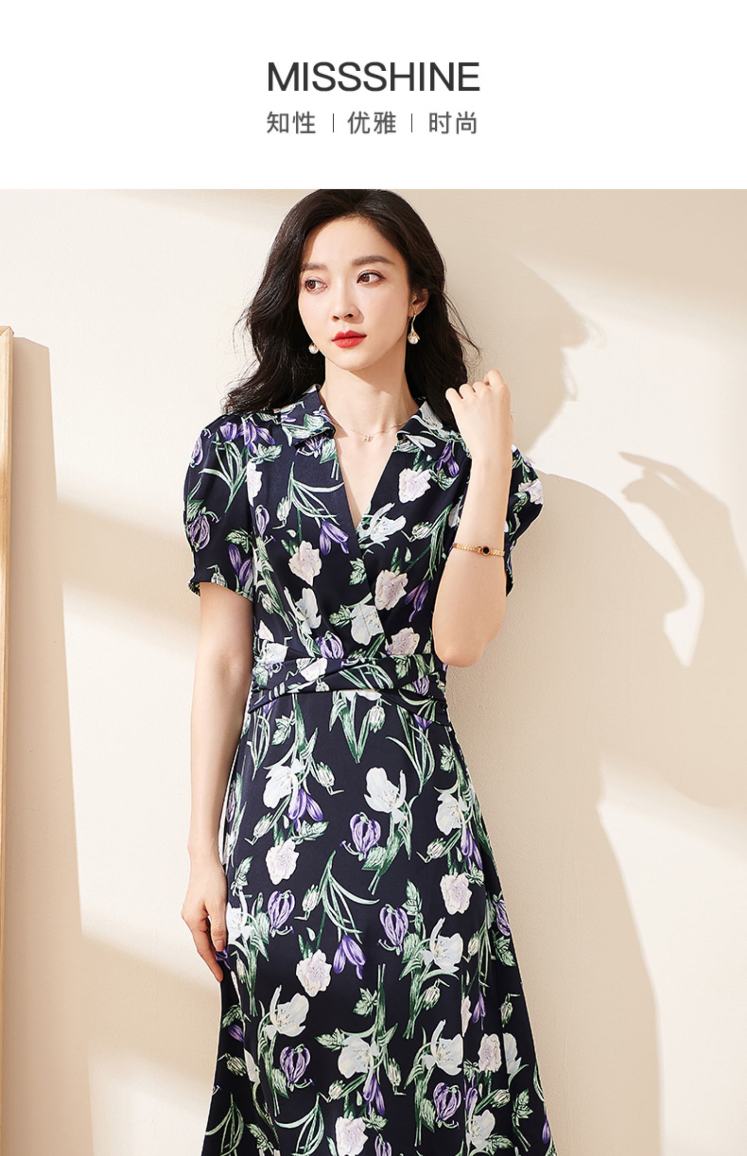 剩S/M 米思阳2024夏季新款知性优雅印花短袖连衣裙修身显瘦中长裙1355