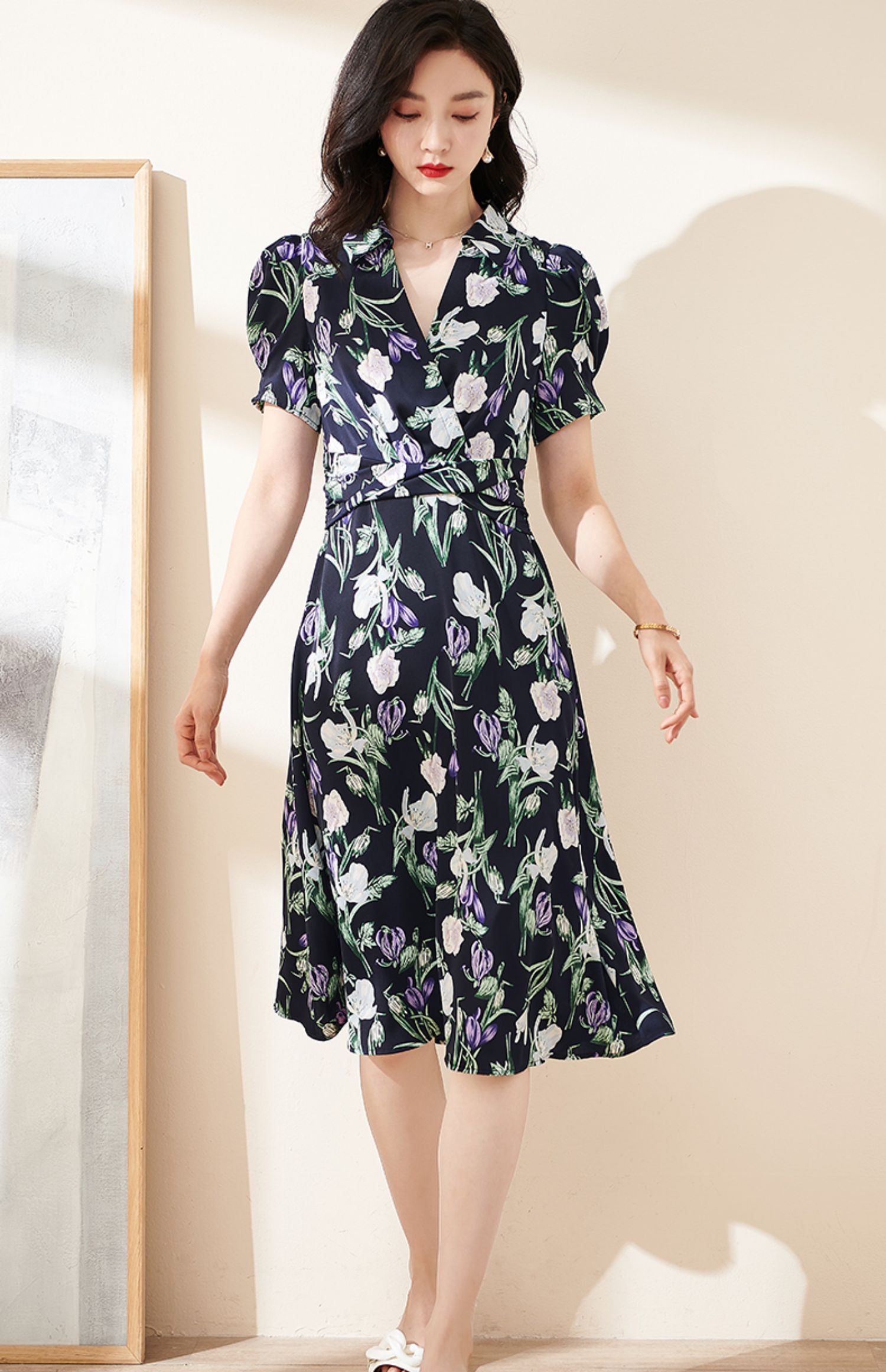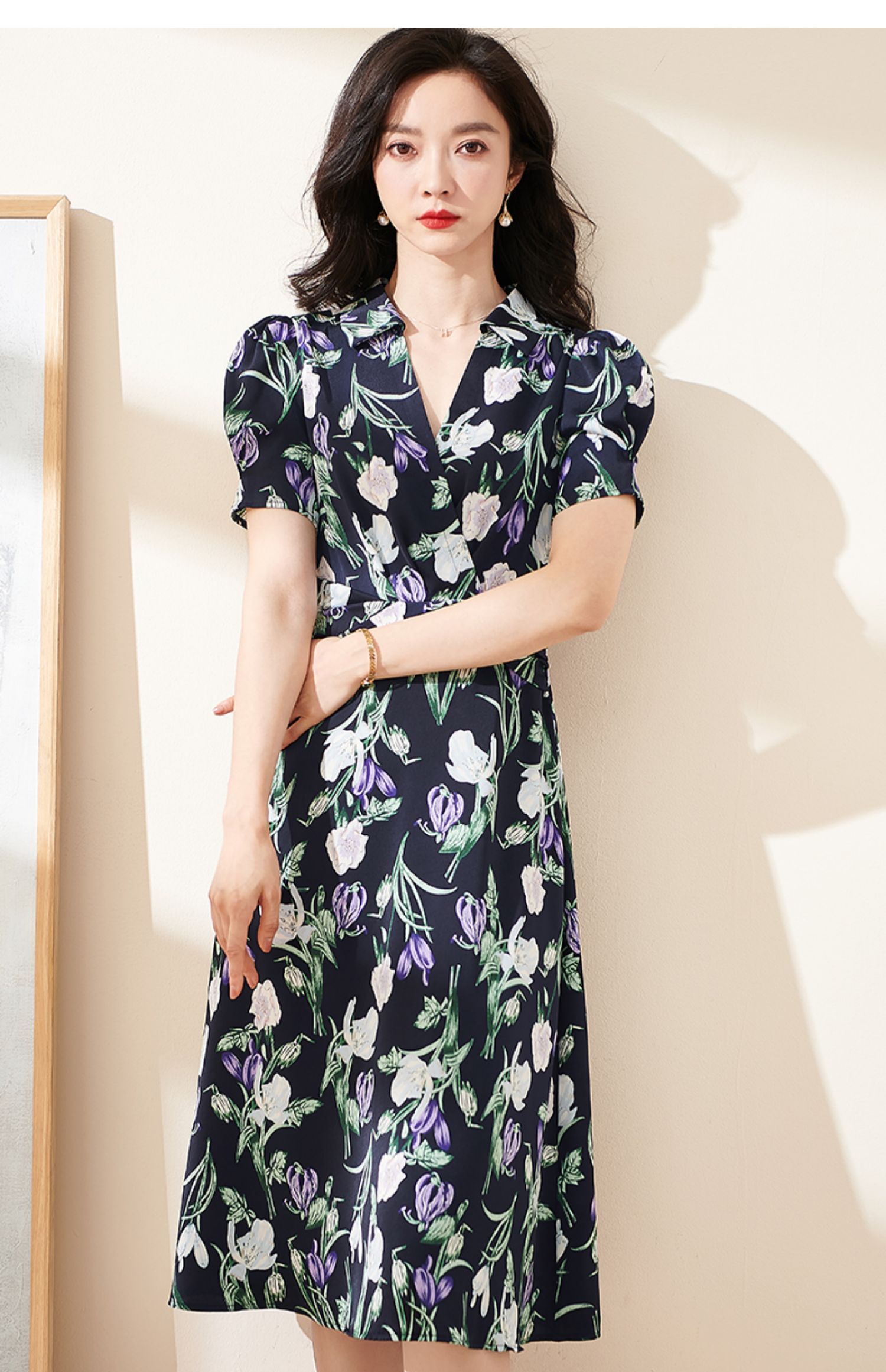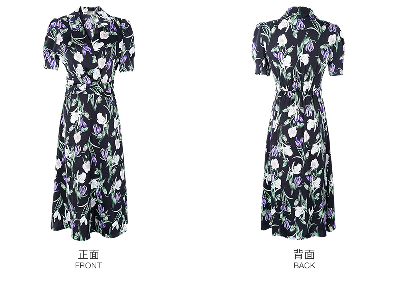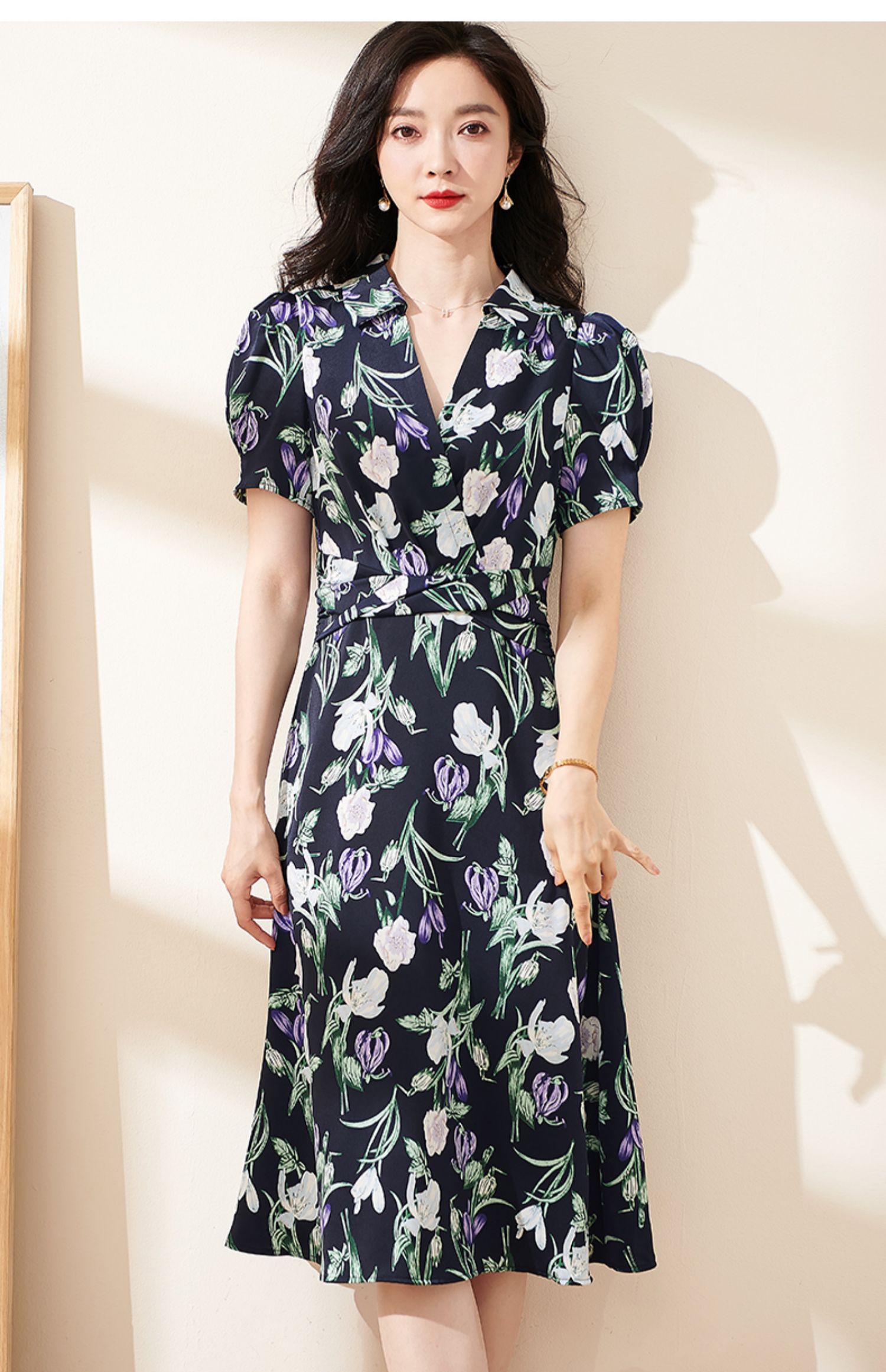 剩S/M 米思阳2024夏季新款知性优雅印花短袖连衣裙修身显瘦中长裙1355