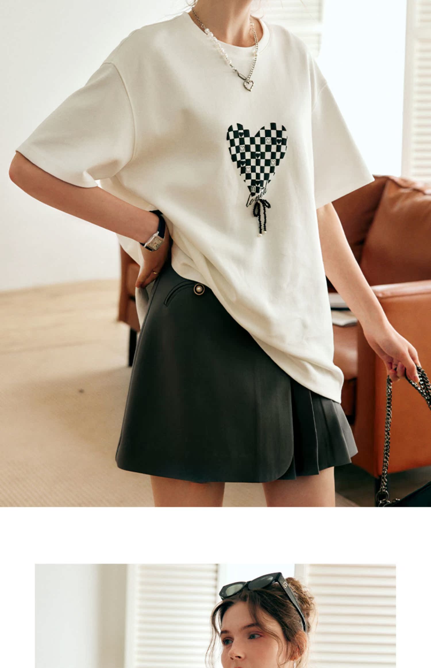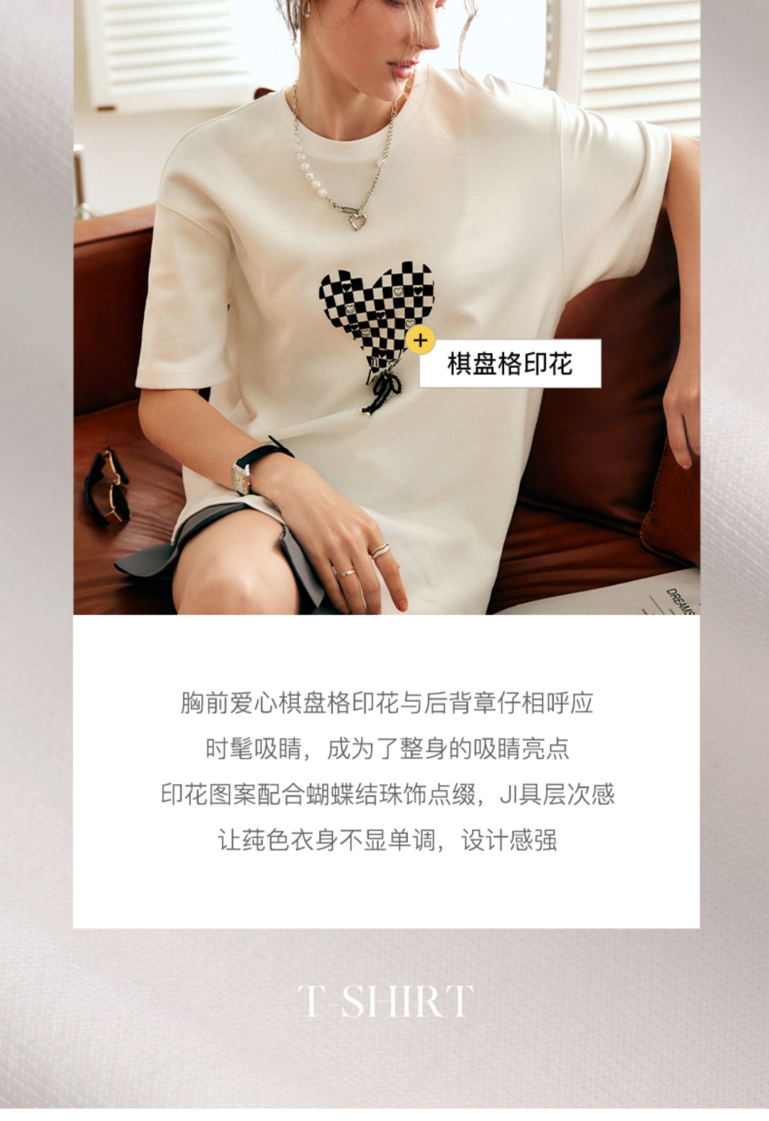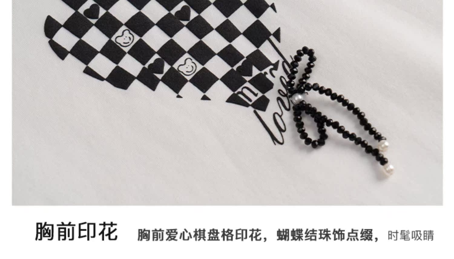 OLrain法式高级穿搭白色短袖T恤女夏季2022新款宽松棋盘印花上衣