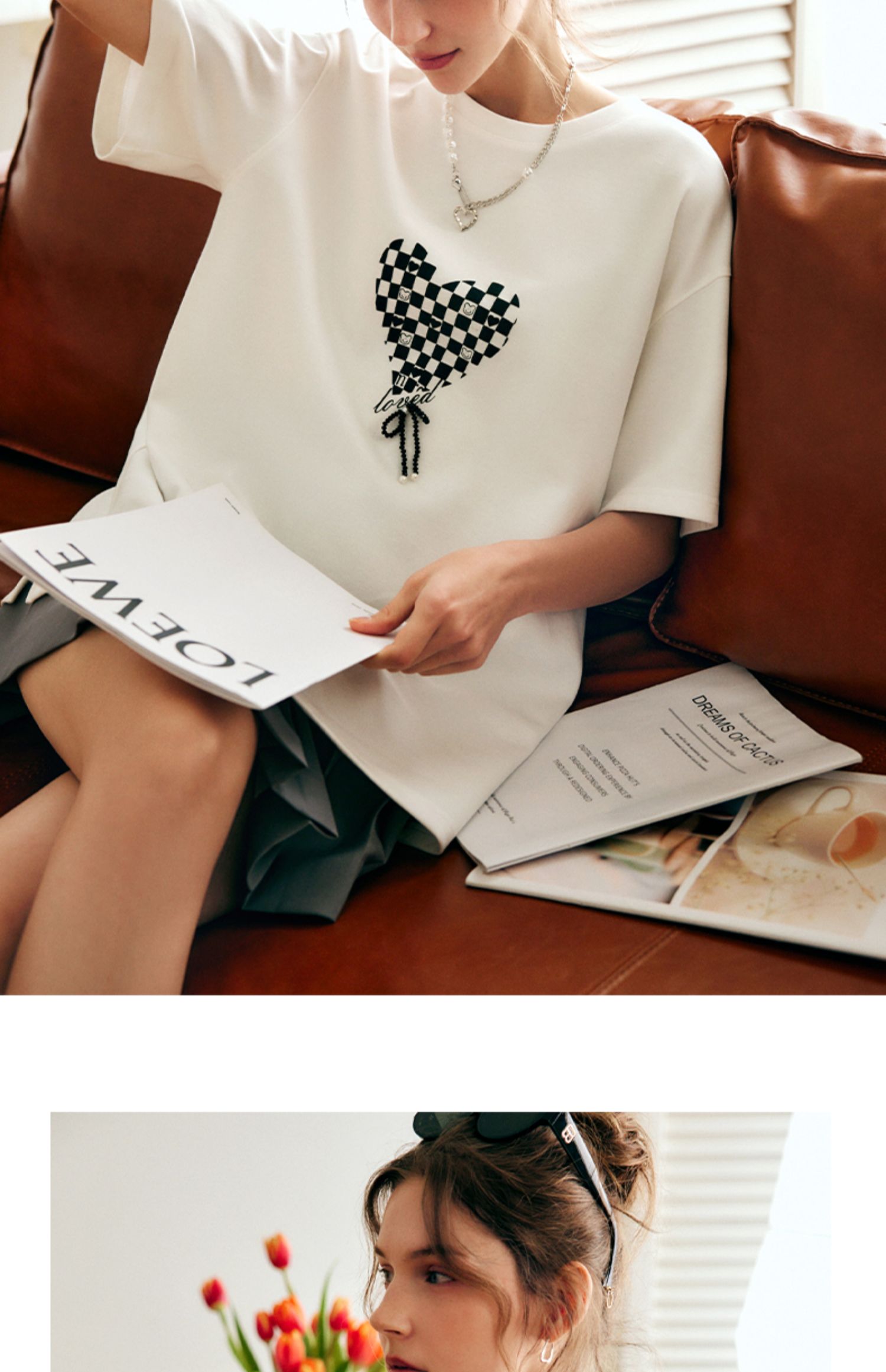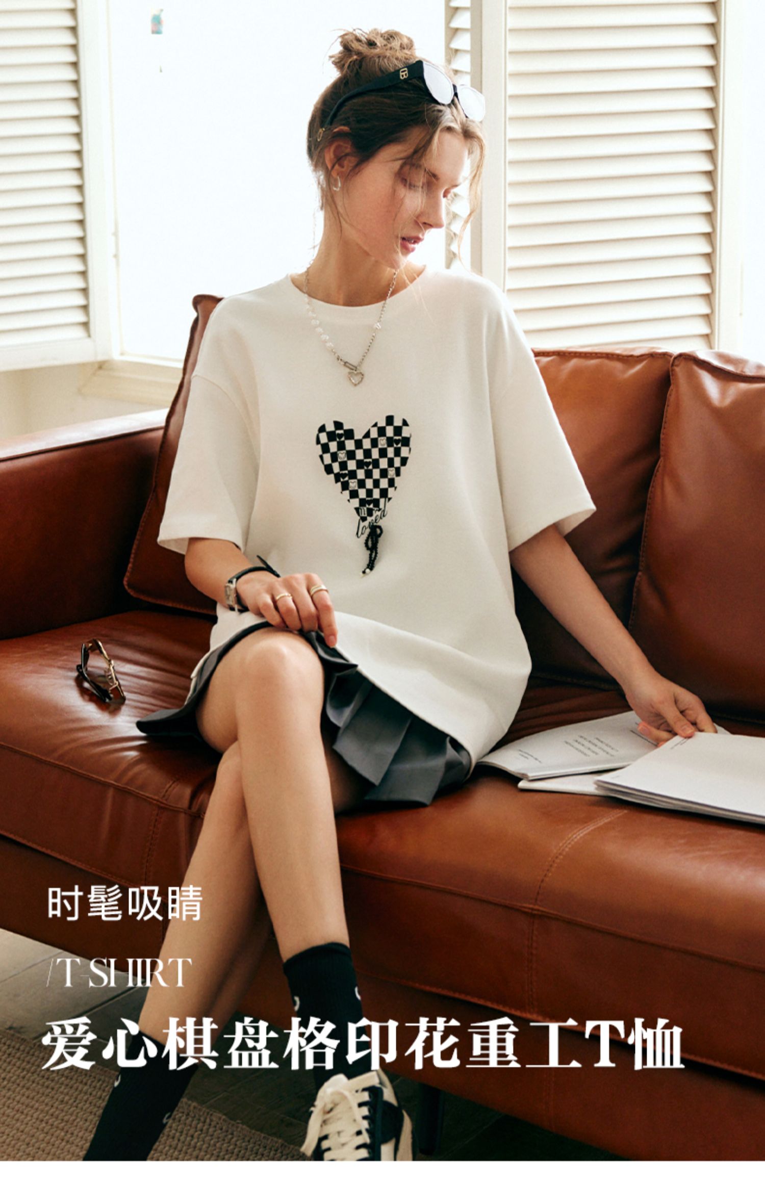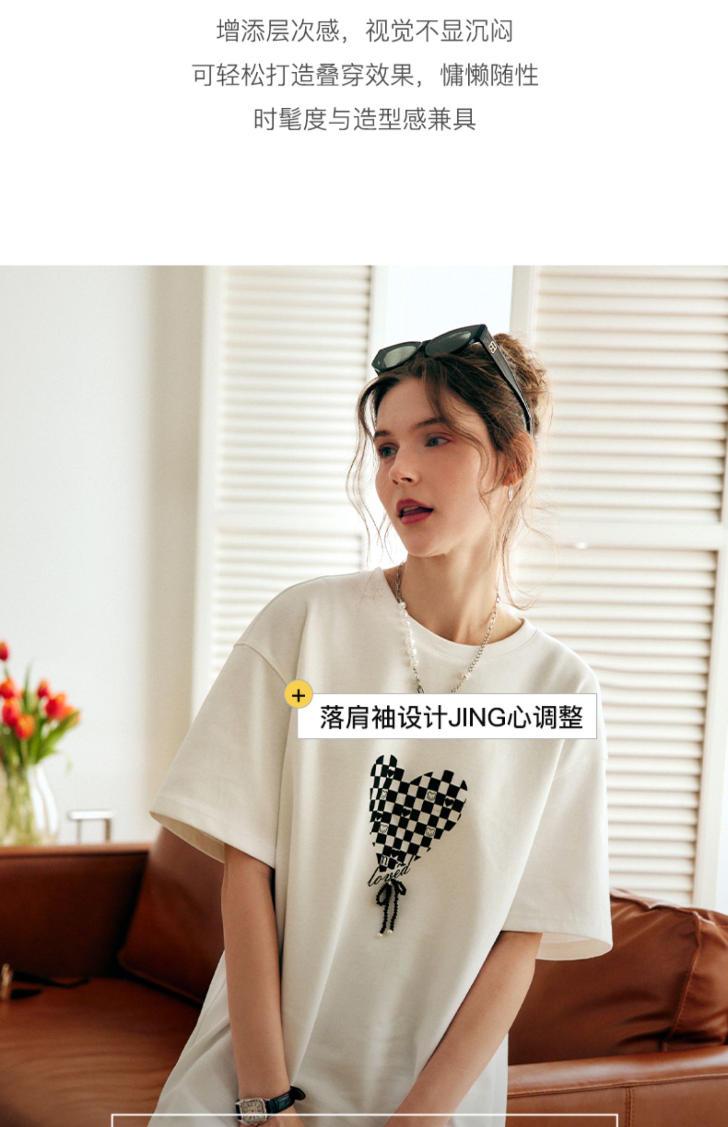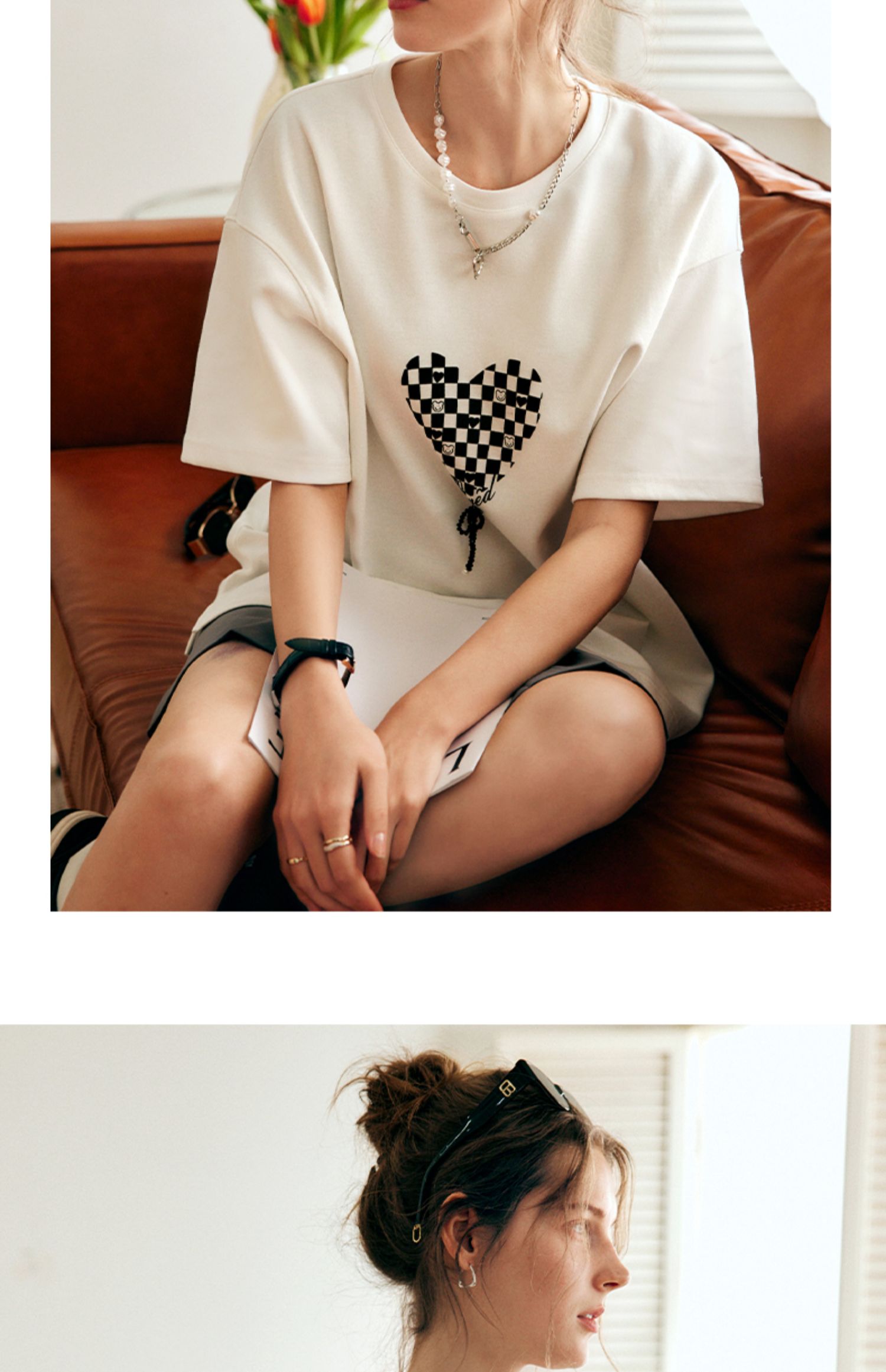 OLrain法式高级穿搭白色短袖T恤女夏季2022新款宽松棋盘印花上衣