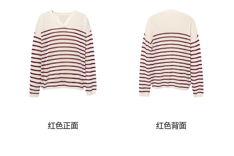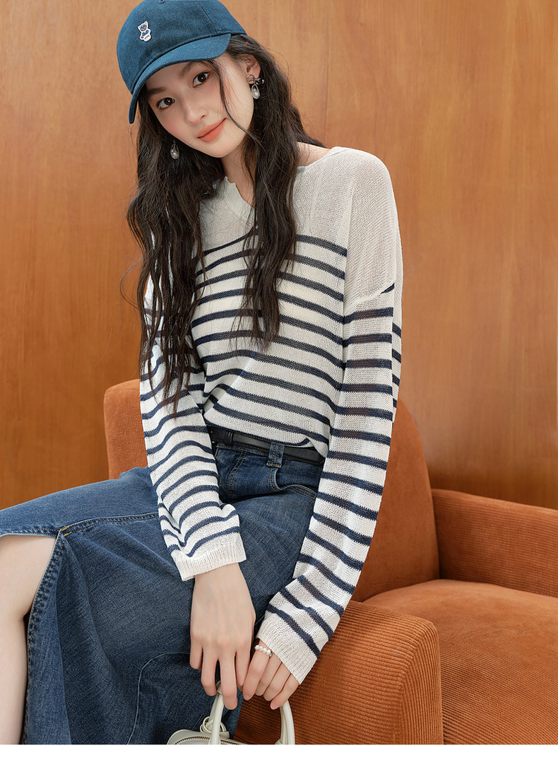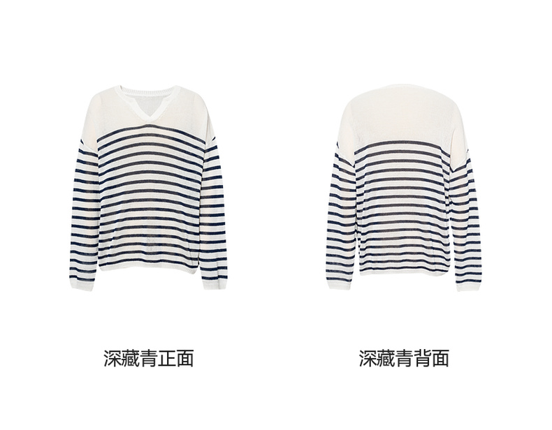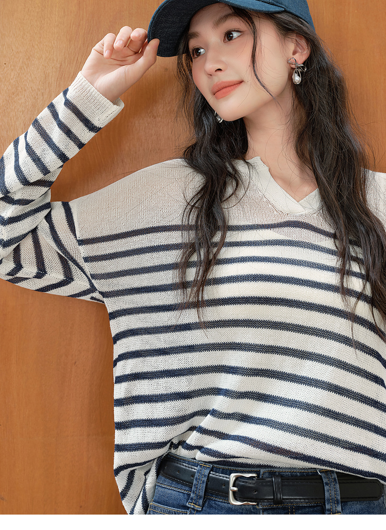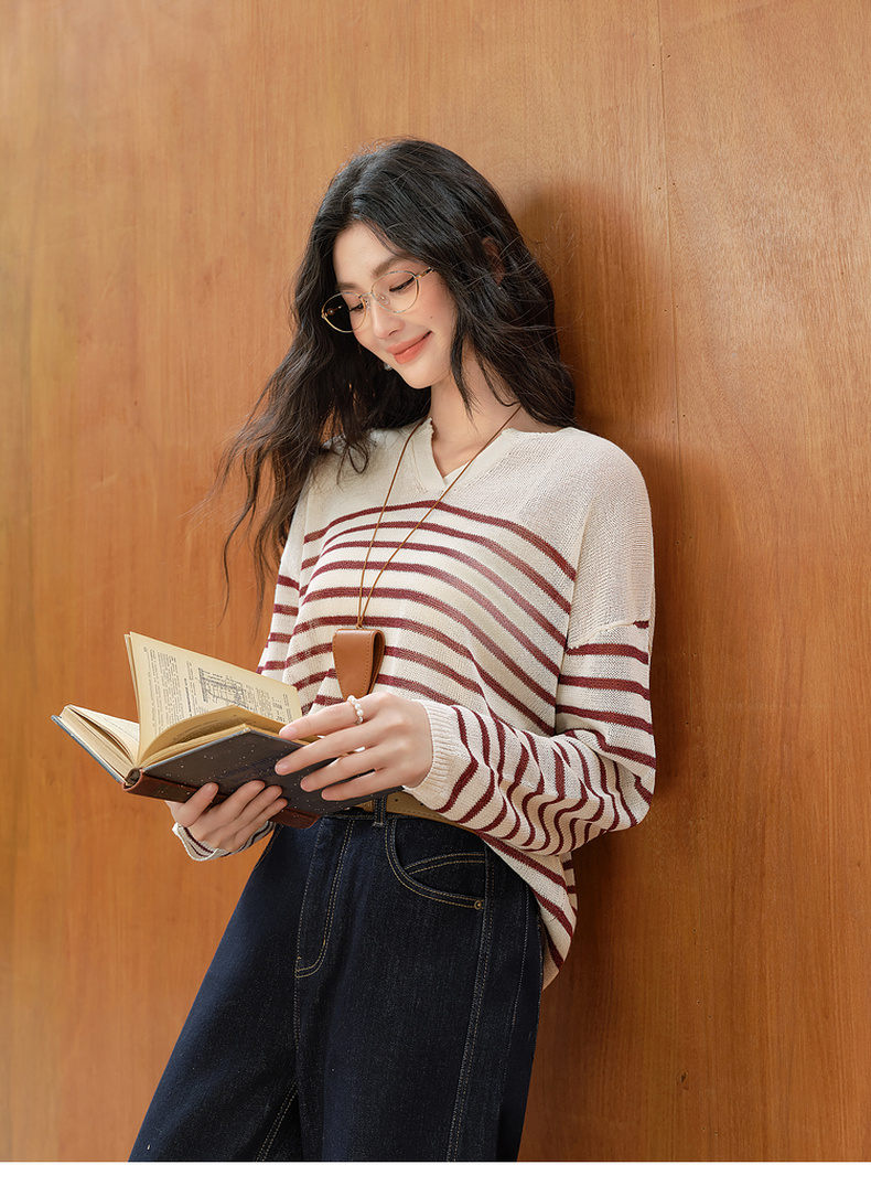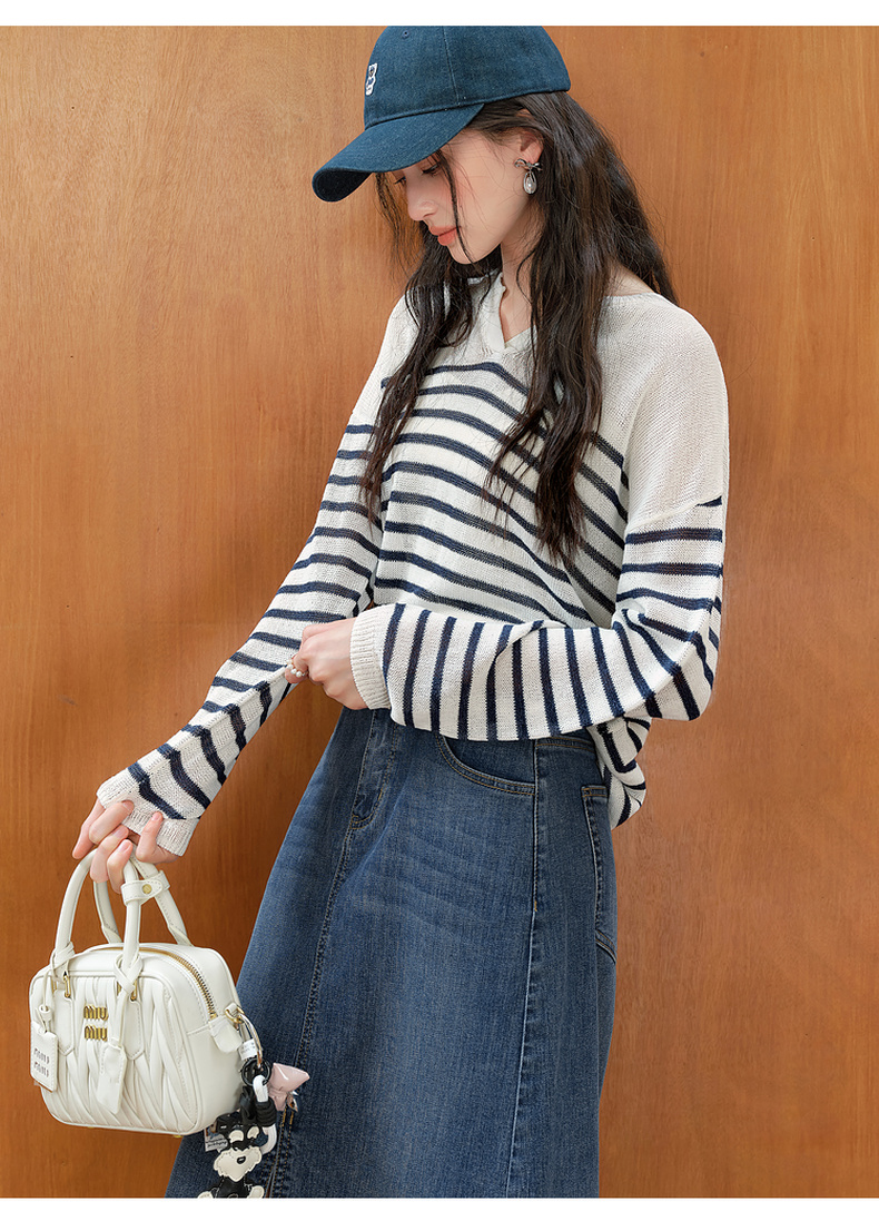 【严选】诗凡黎干爽透气条纹针织罩衫2025秋新款慵懒百搭松弛感小V领长袖7G7330931