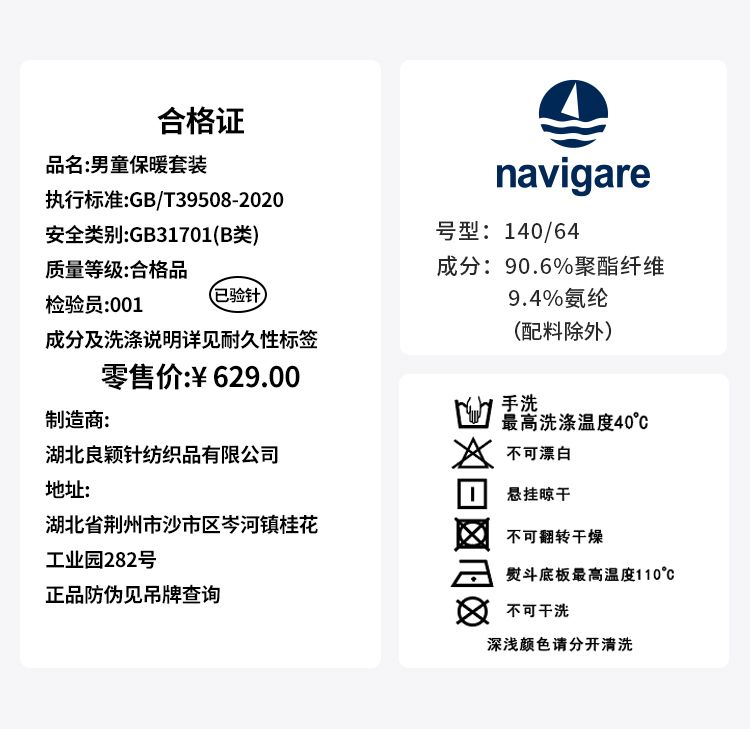 【纳维凯尔】【双面磨毛】【120-165】Navigare意大利小帆船男童秋冬款保暖内衣套装