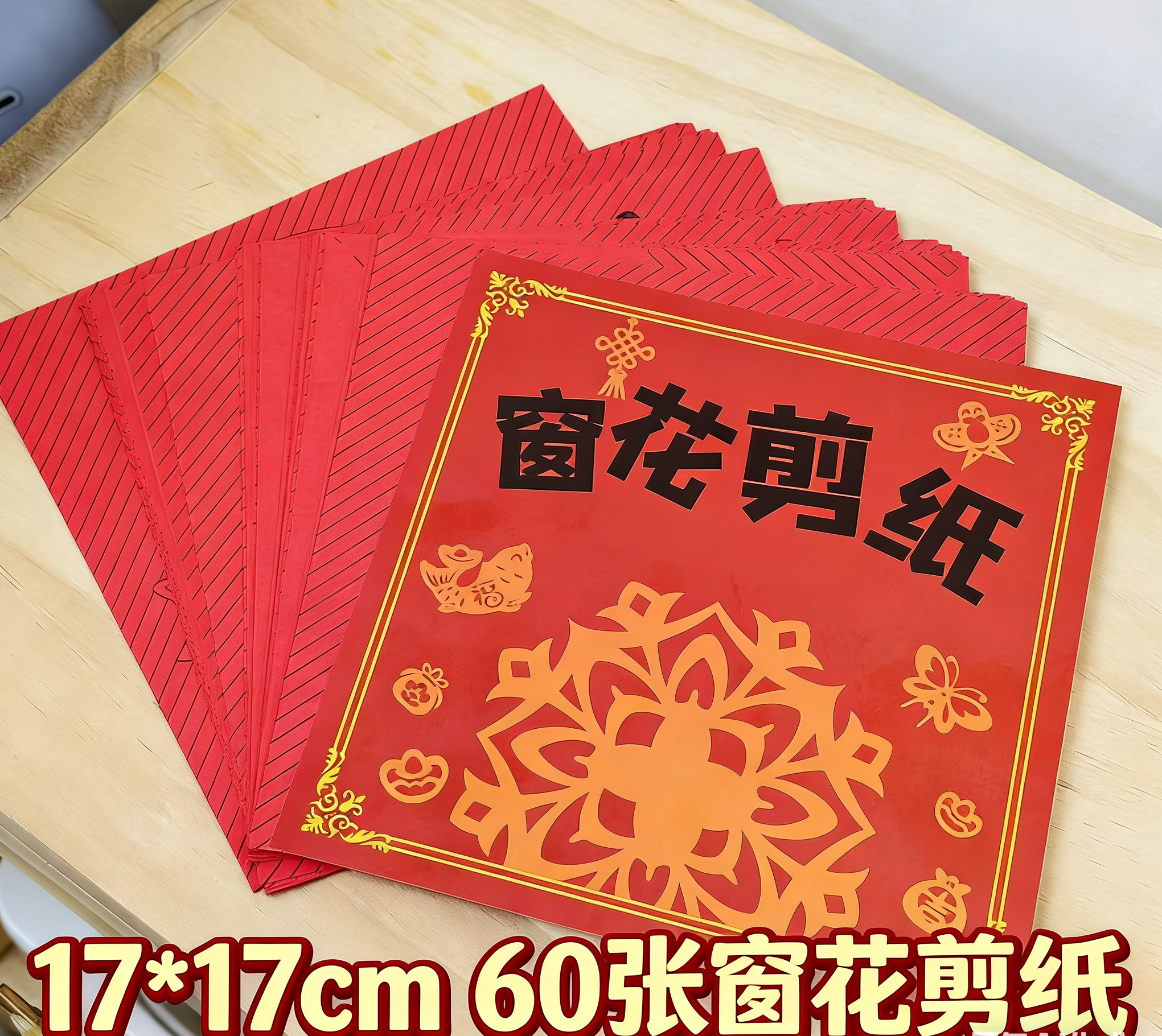 【商品名称】新年窗花剪纸 【团品规格】17*17cm/60张/包 【材质说明】80g易剪纸 【发货时效】48h内发货 【物流说明】新疆西藏内蒙不发,北上+1元 【售后说明】1.商品非质量问题不支持退换;2.质量、缺件问题请签收后48小时内反馈,过期无法为您处理喔;3.快递送货外观有严重破损的请拒收。