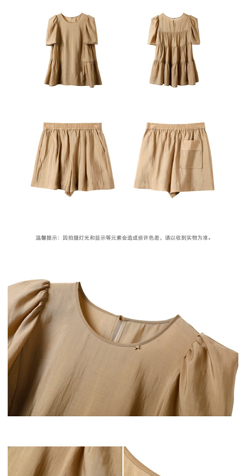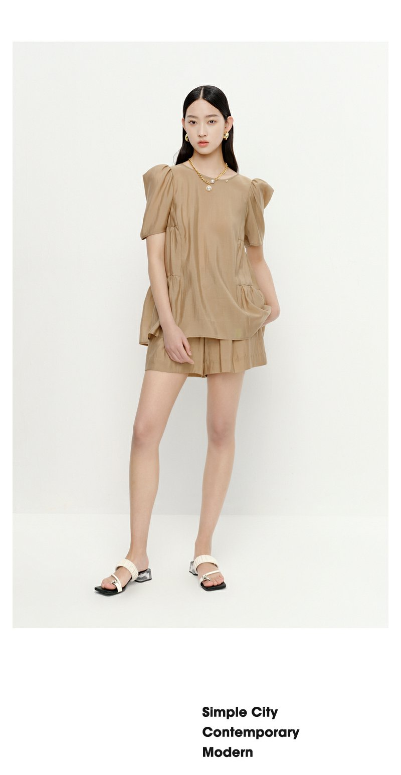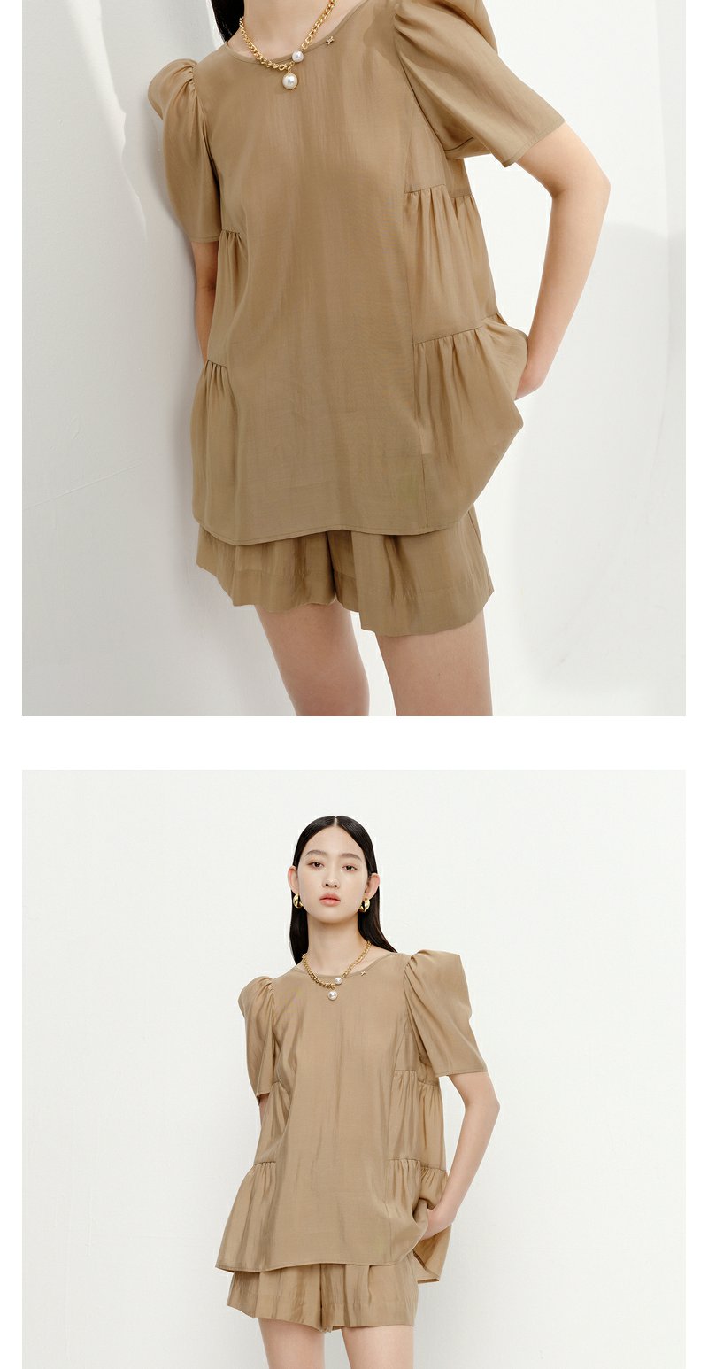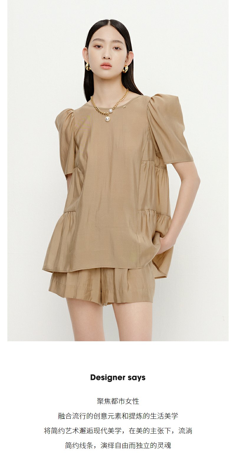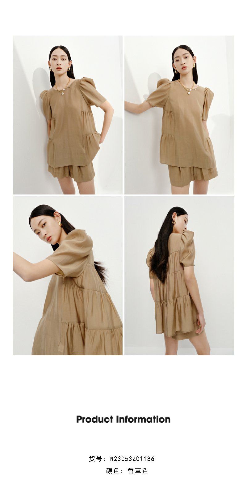 NEELLY纳俪商场同款夏季新款泡泡袖天丝衬衫女圆领套装阔腿短裤N23053Z01186
