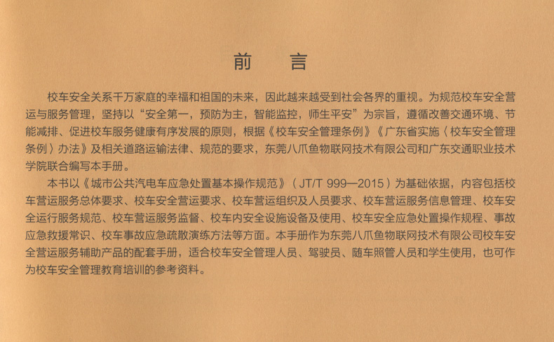 本书根据《校车安全管理条例》《广东省实施〈校车安全管理条例〉办法》及相关道路运输法规、规范的要求,由东莞八爪鱼物联网技术有限公司和广东交通职业技术学院联合编写。详细阐述校车运营中对校车运营服务的总体要求,以及对车辆、人员、运行服务、信息管理、服务监督等方面的具体要求。