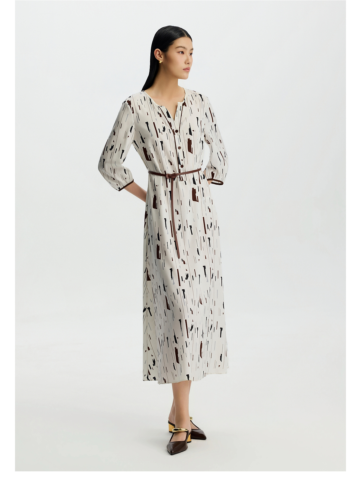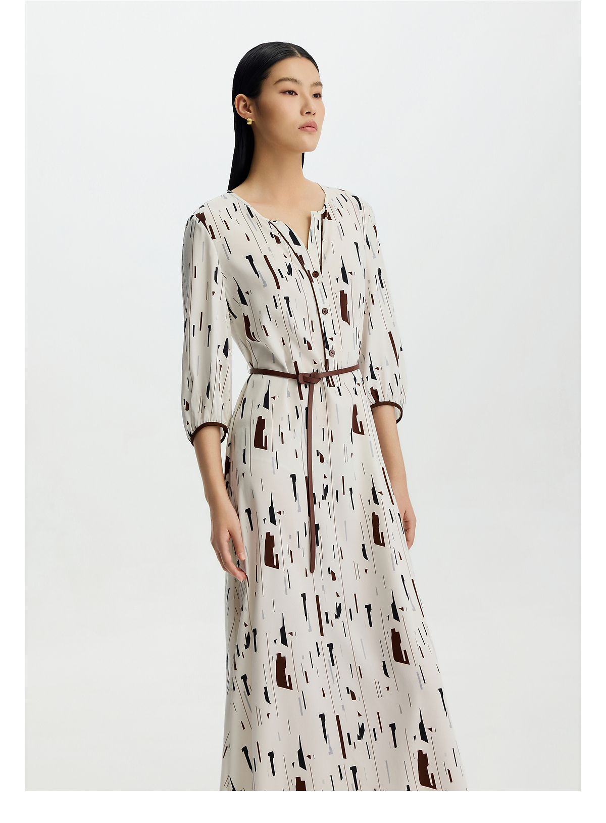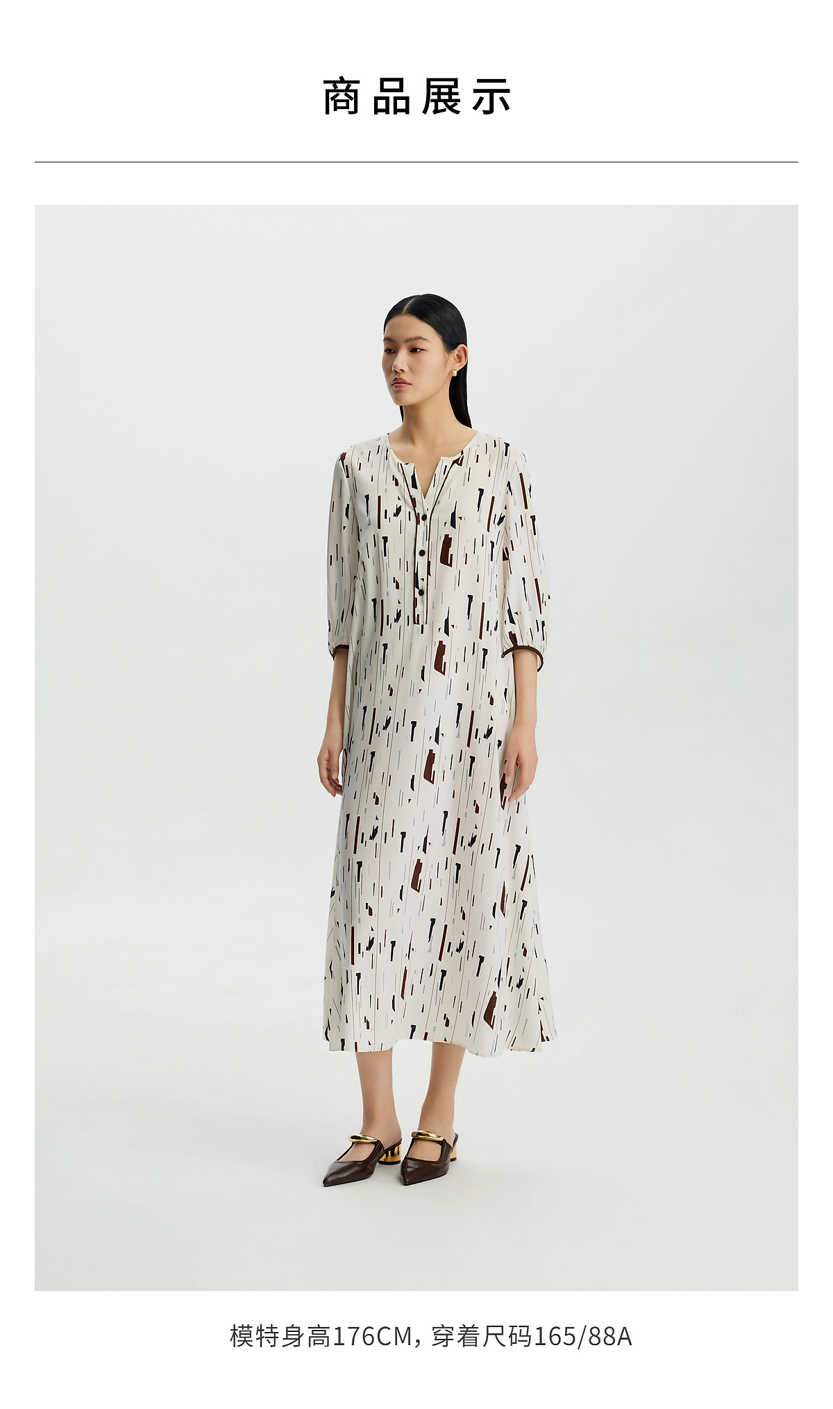 PURE TOUCH女装26夏新款印花连衣裙七分灯笼袖弹力斜纹蚕丝中长裙