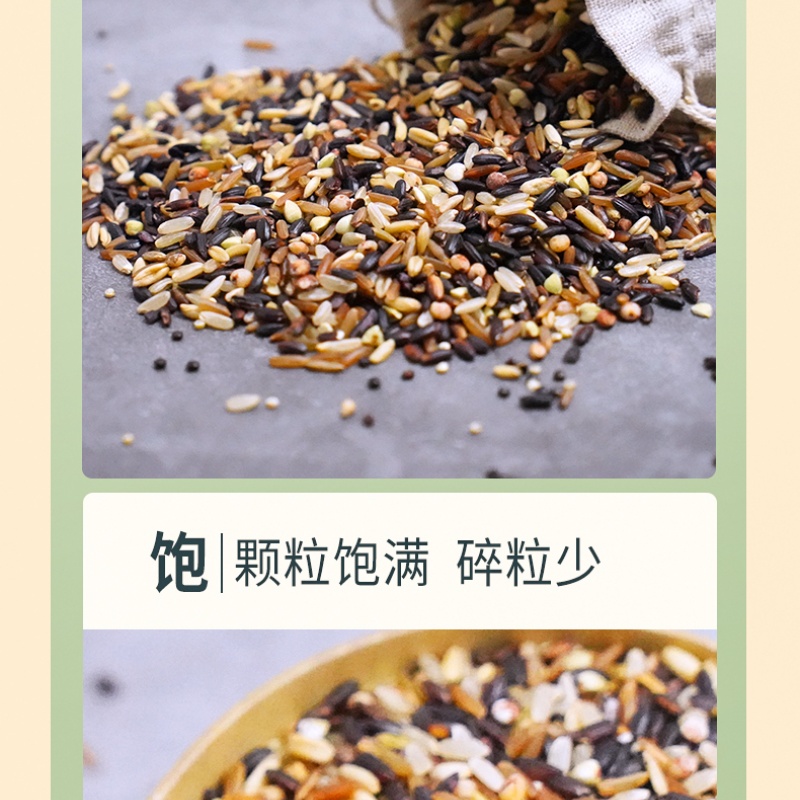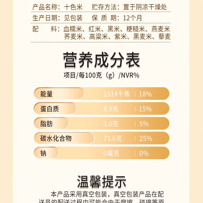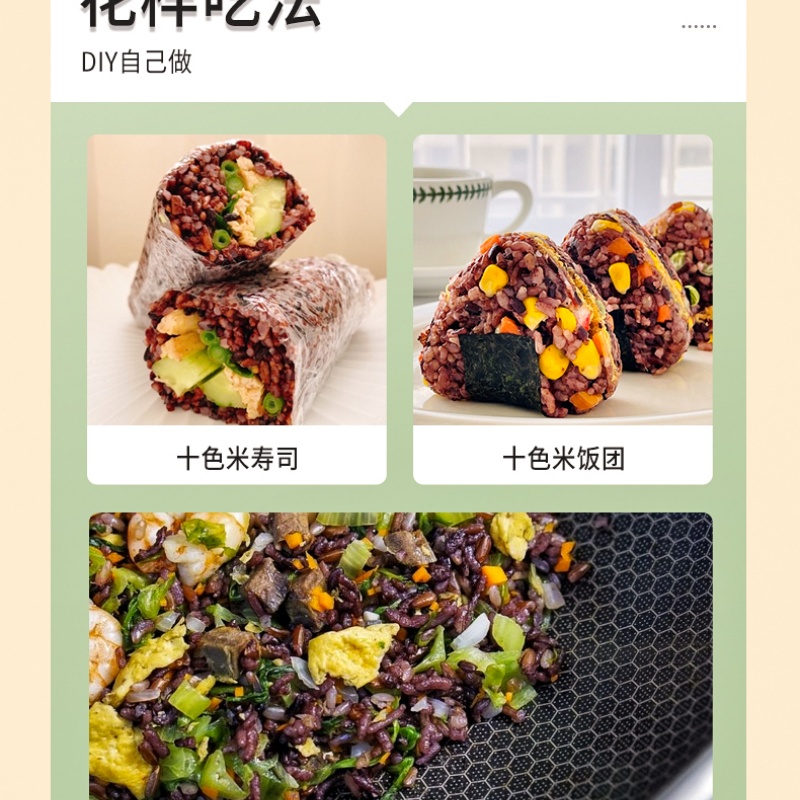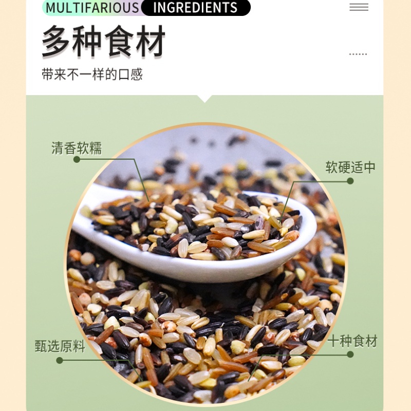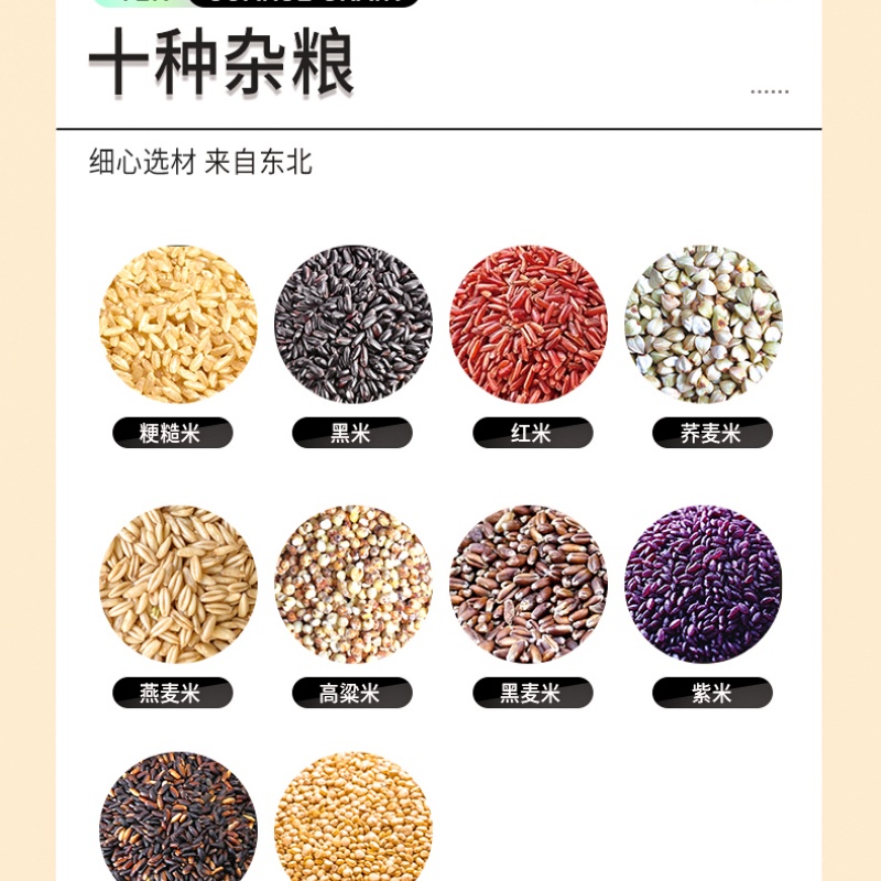 【产品卖点】:东北黑土地种植不抛光不打蜡不染色,十色米配料很干净 不加香精 色素 防腐剂 糙米 黑米 红米 燕麦 荞麦 黑麦米 高粱米7种米含有大量的膳食纤维和谷维素 还添加了富含微量元素的血糯米和紫米和藜麦 整体的营养比5色7色更丰富 不仅全面提升营养价值,还可以使口感变得更加软糯