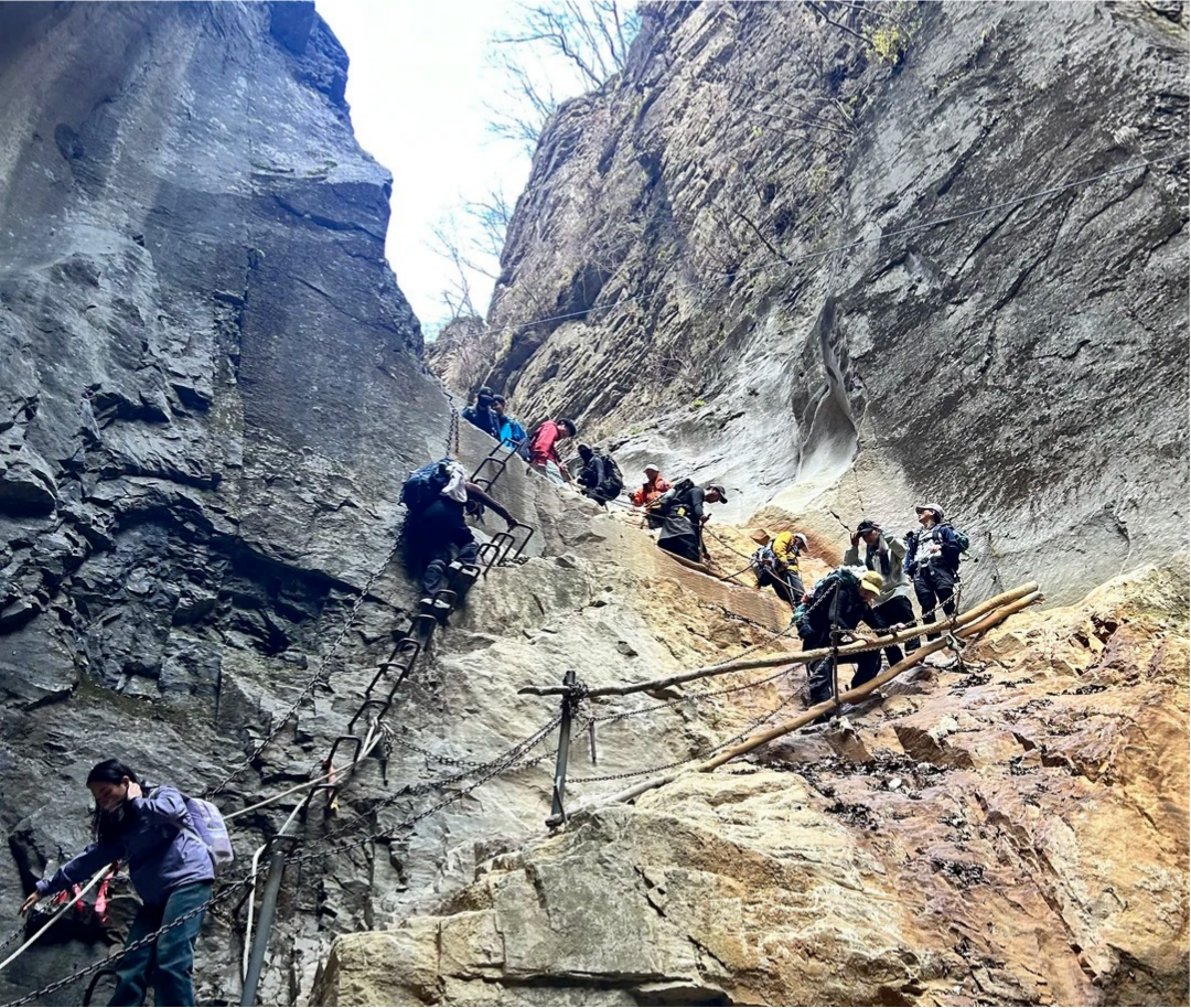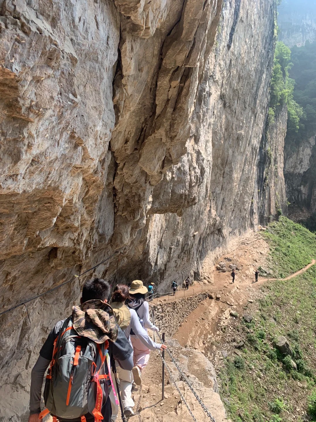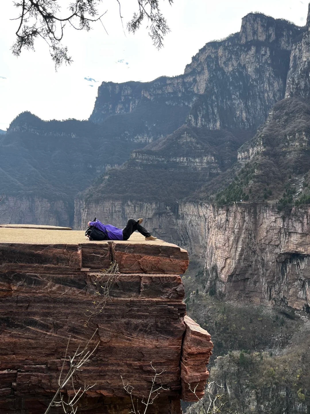 休整后向悬空平台进发,临崖路段虽平缓却需格外留心,脚下是万丈深渊,身旁是层峦叠嶂。站在平台边缘,风从山谷呼啸而过,整座太行的壮阔尽收眼底。