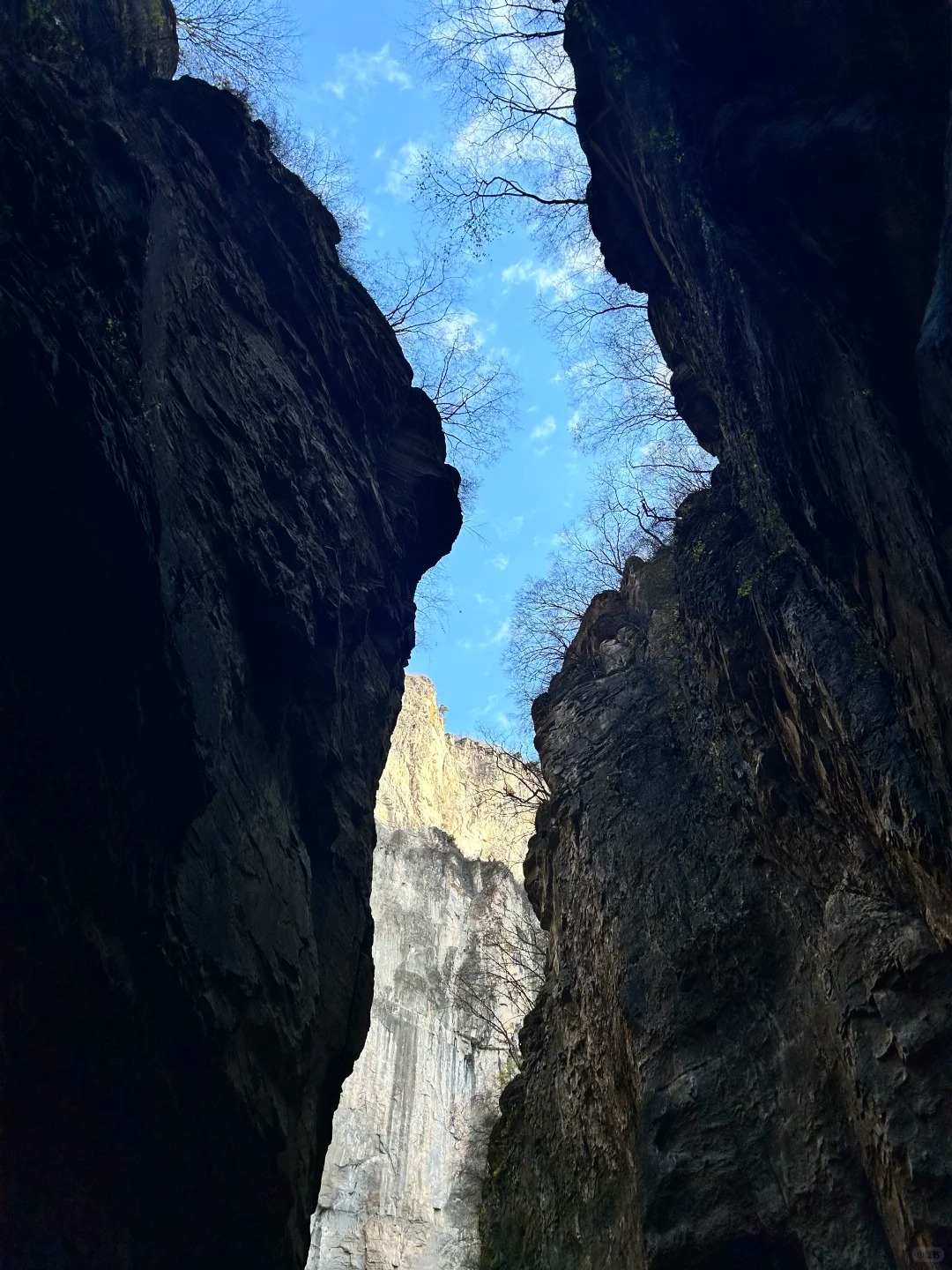 当我们走在被岁月磨过的石阶,身旁溪涧潺潺,草木清香裹着风扑面而来,不多时便抵达一线天——两侧红岩绝壁仅容一人通行,最窄处抬头只剩天际一线。