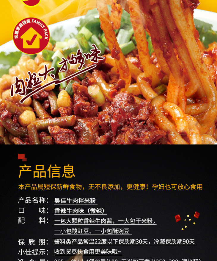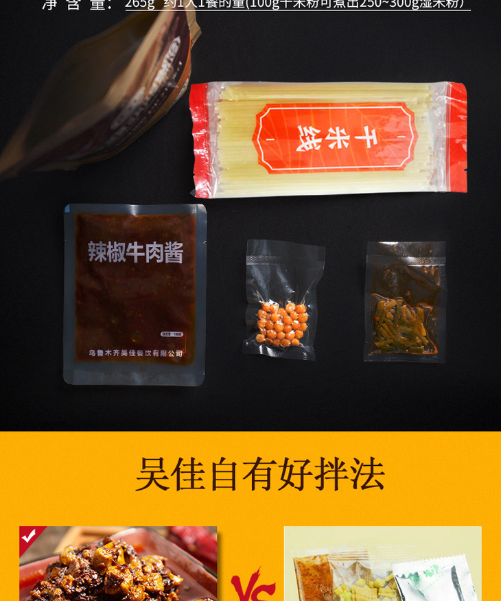 本产品规格为:牛肉酱1袋100,干粉1袋130克,酸豇豆1包20克,酥豌豆1包15克。(1人份量)