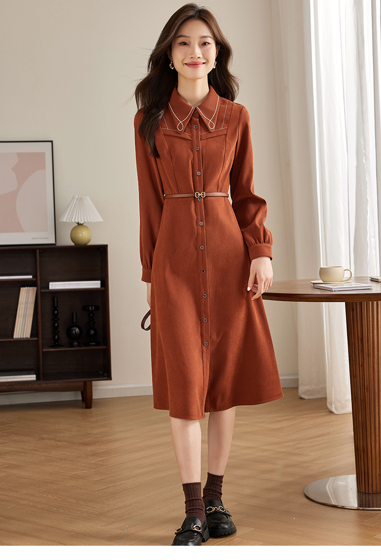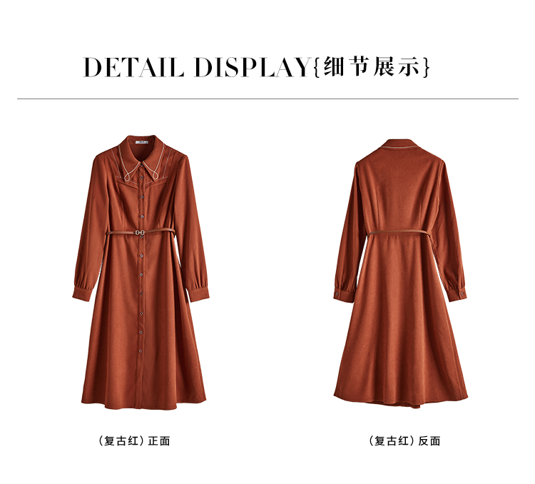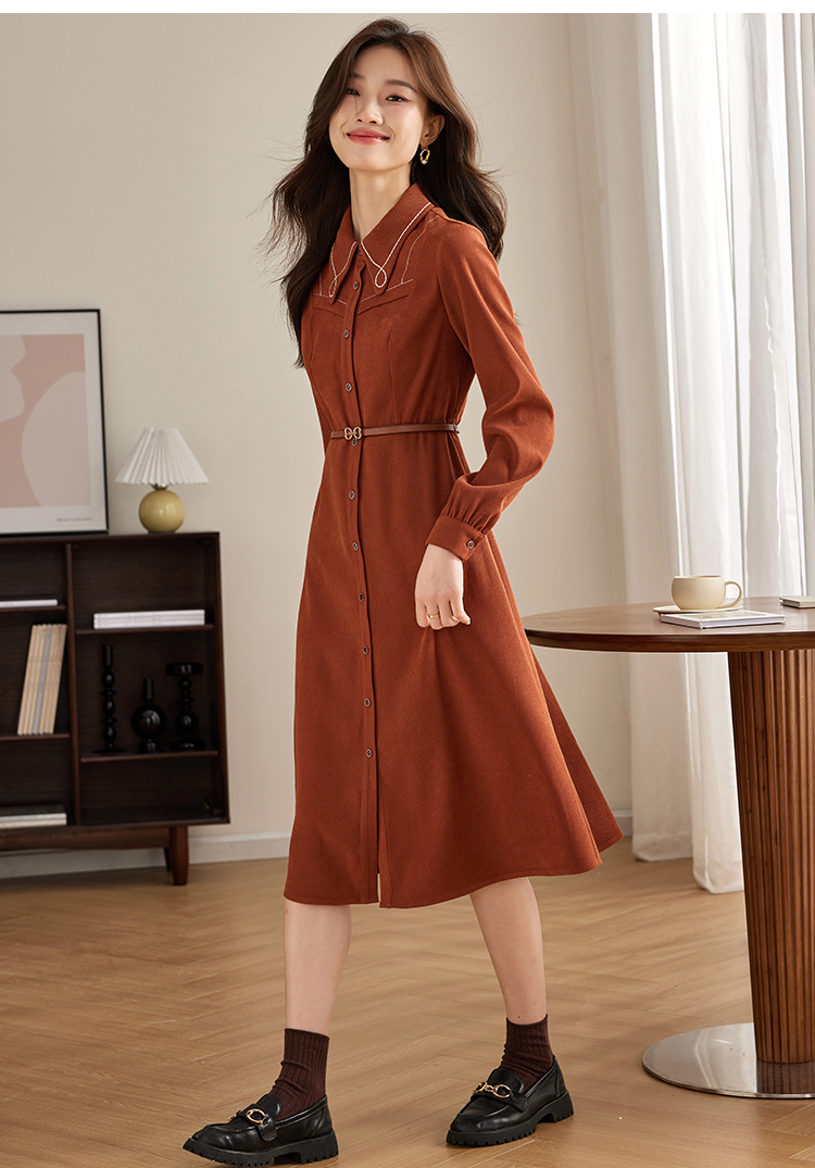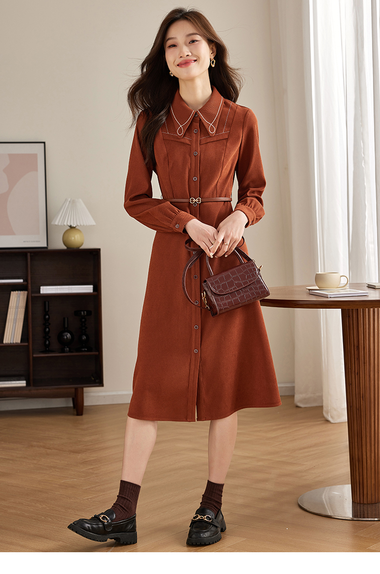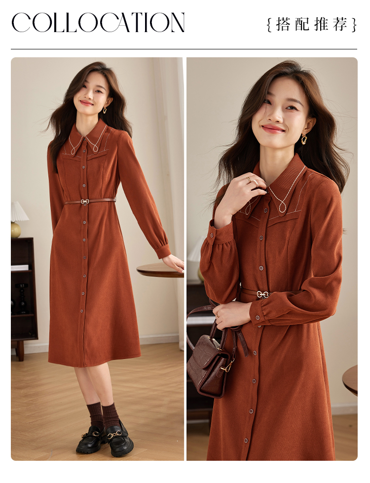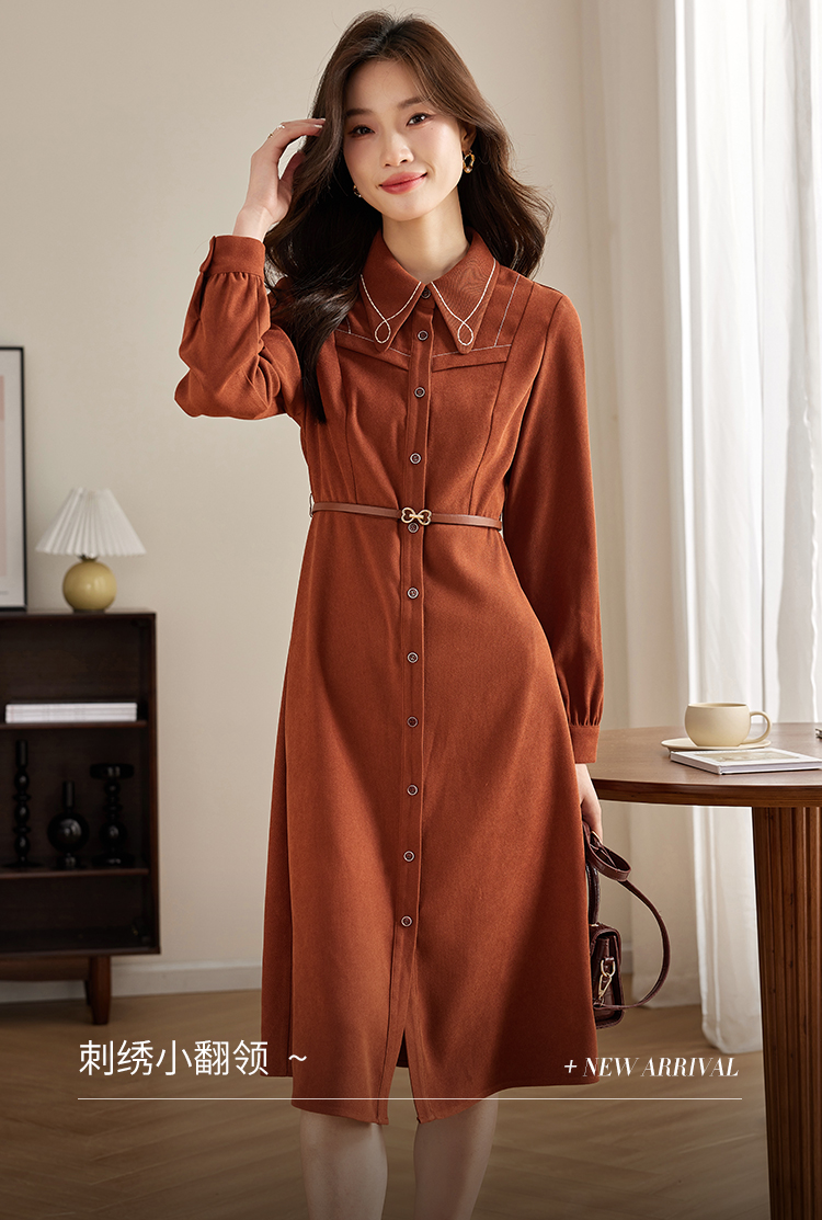 【专属特价】熙世界绒感磨绒连衣裙女长袖2025年秋冬新款高级感刺绣翻领衬衫裙