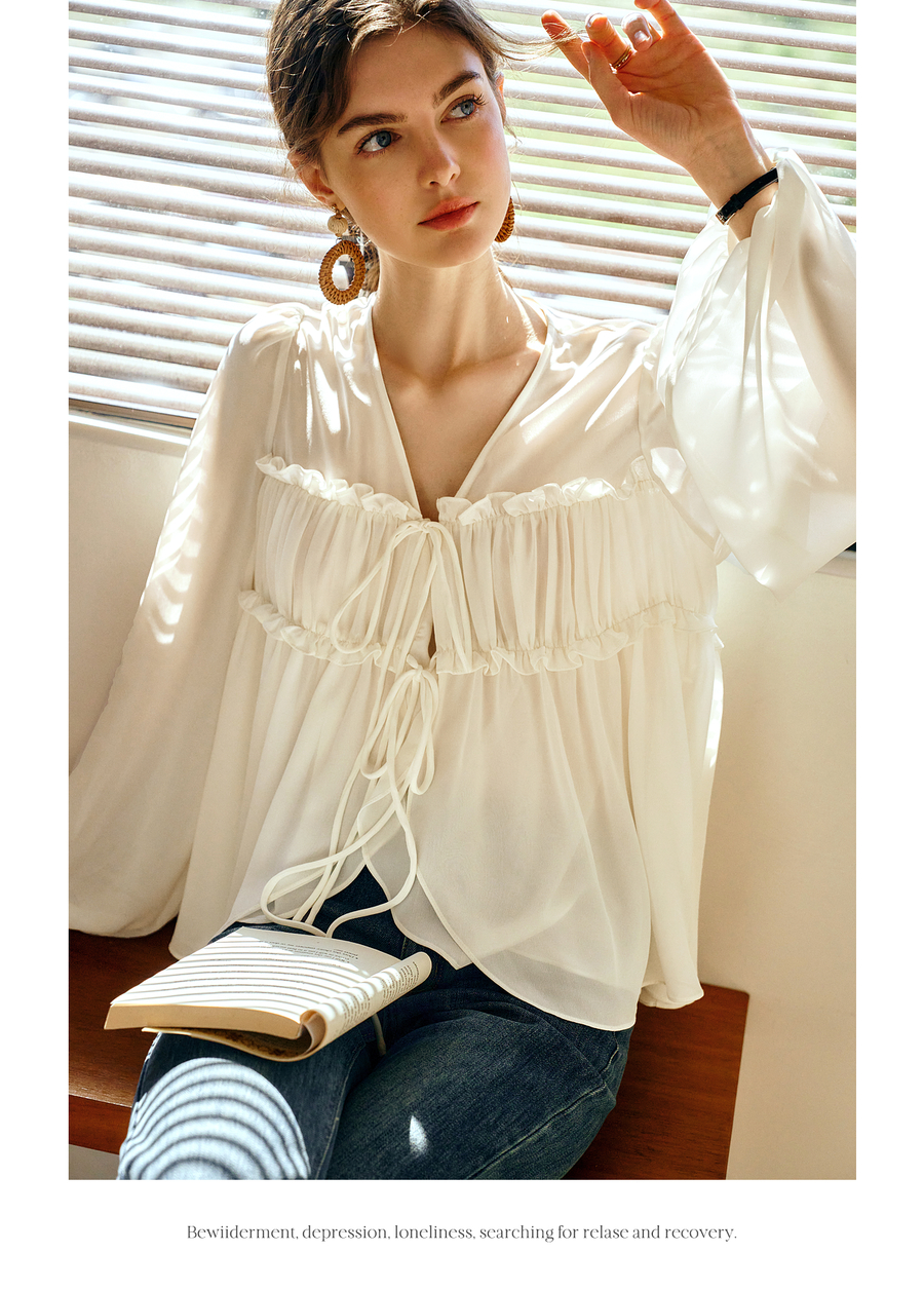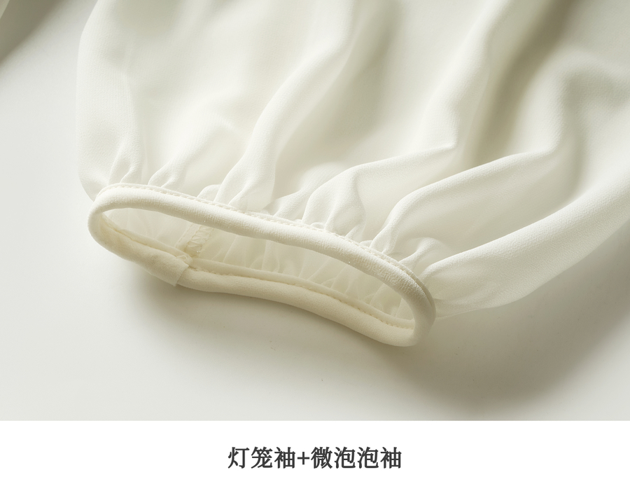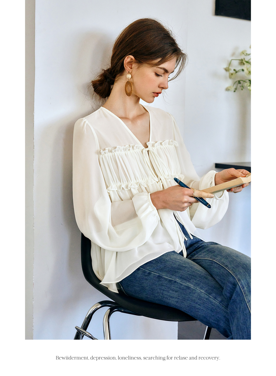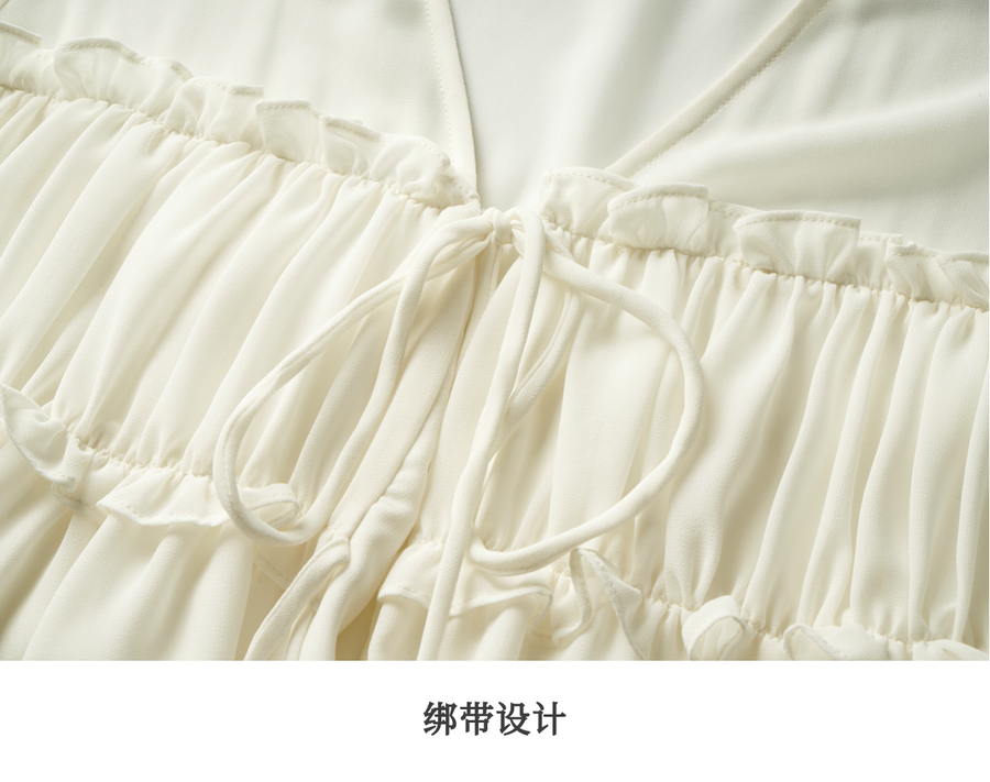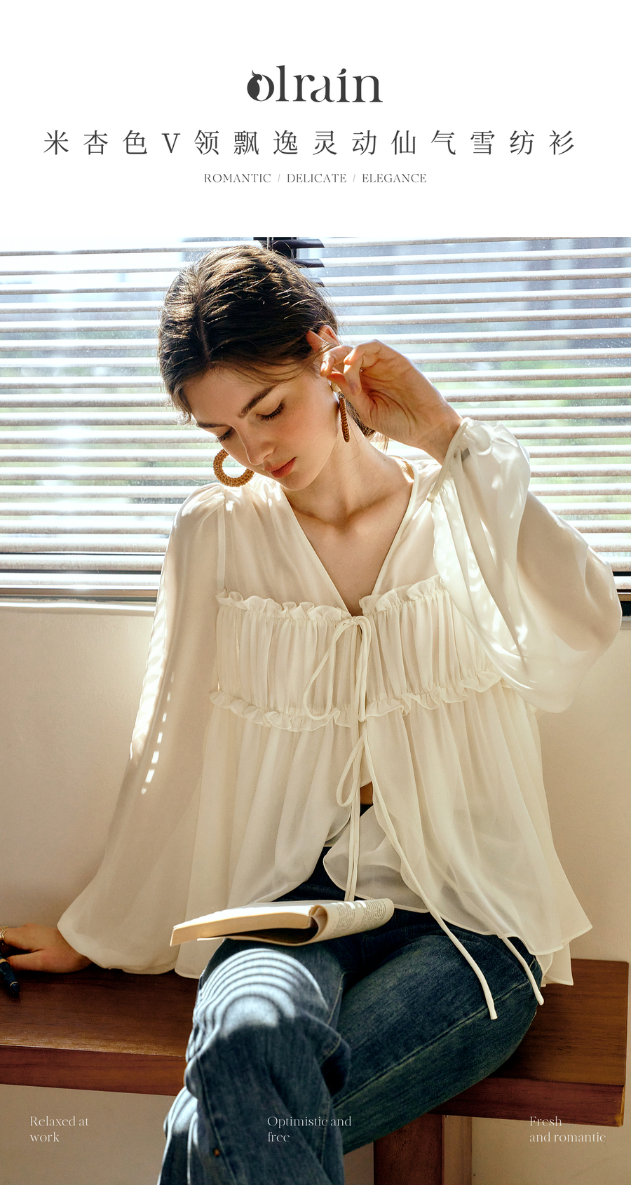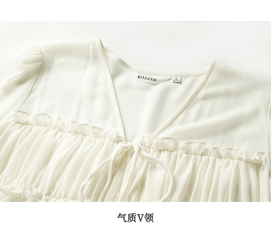 OLrain欧芮儿米杏色V领雪纺衫女春季2025年新款设计感度假风衬衣