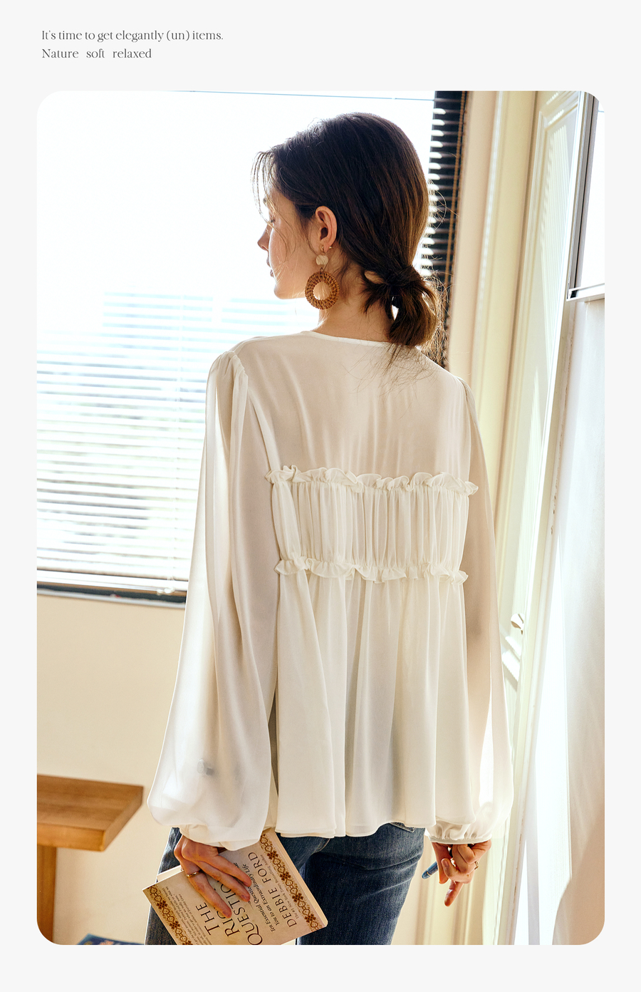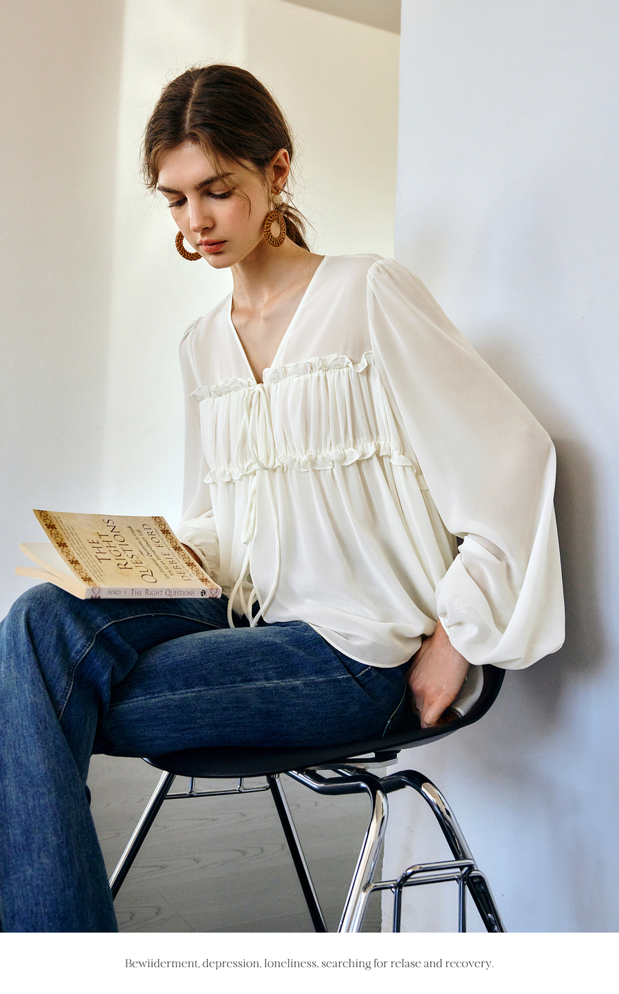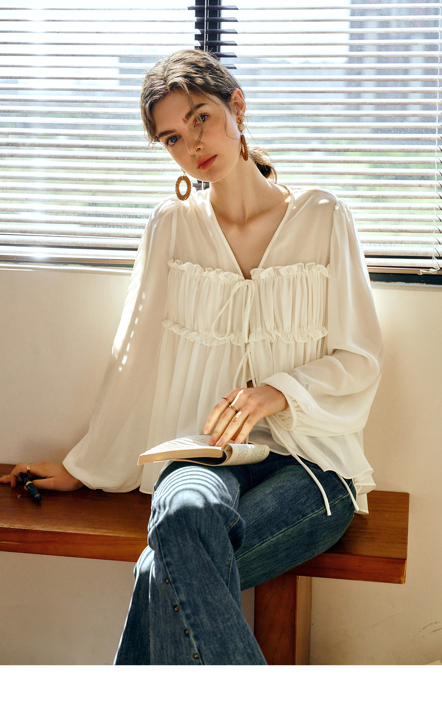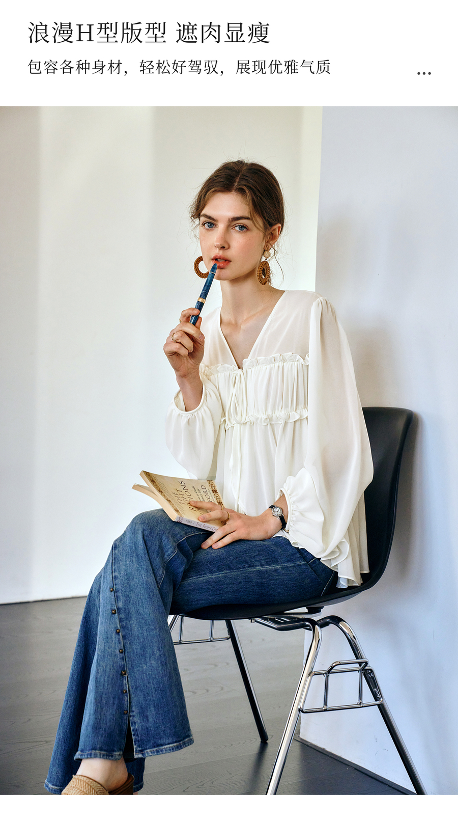 OLrain欧芮儿米杏色V领雪纺衫女春季2025年新款设计感度假风衬衣