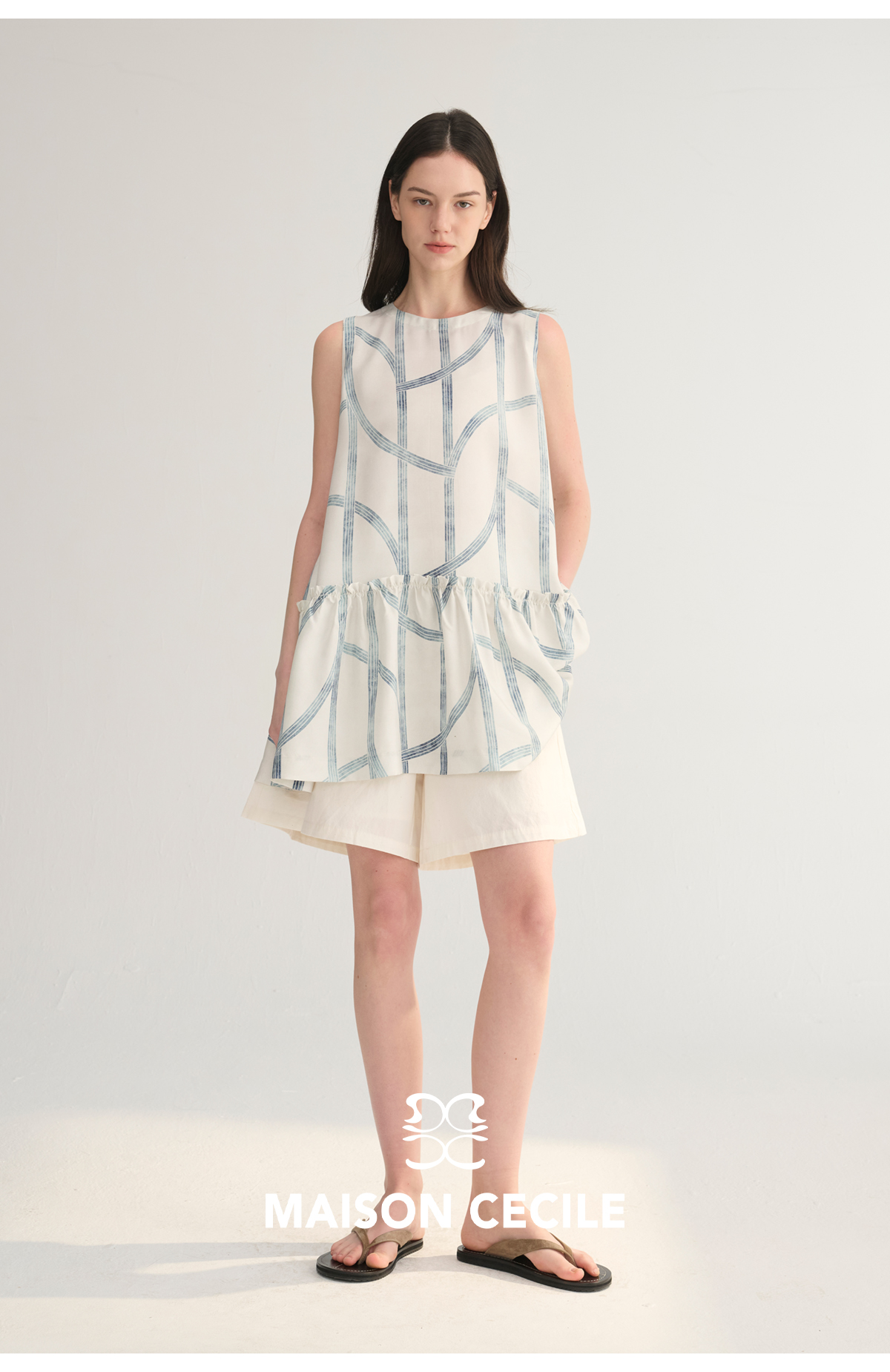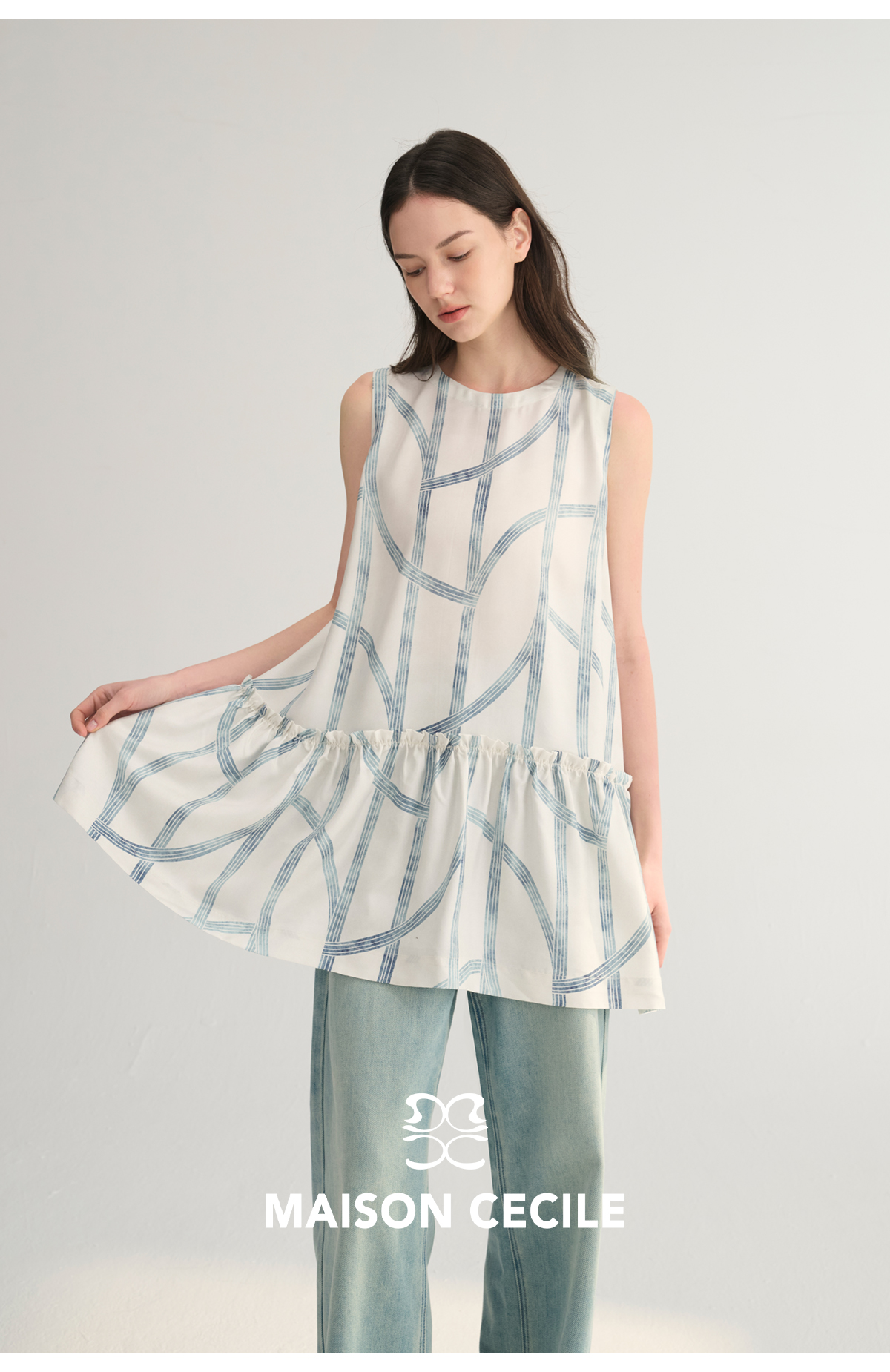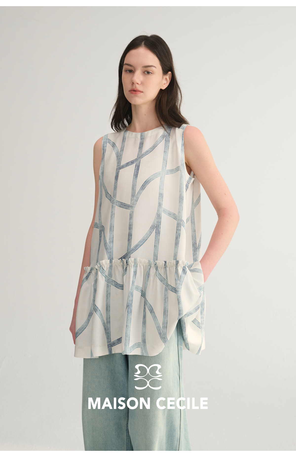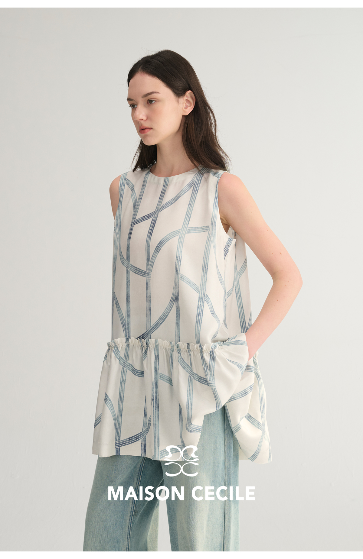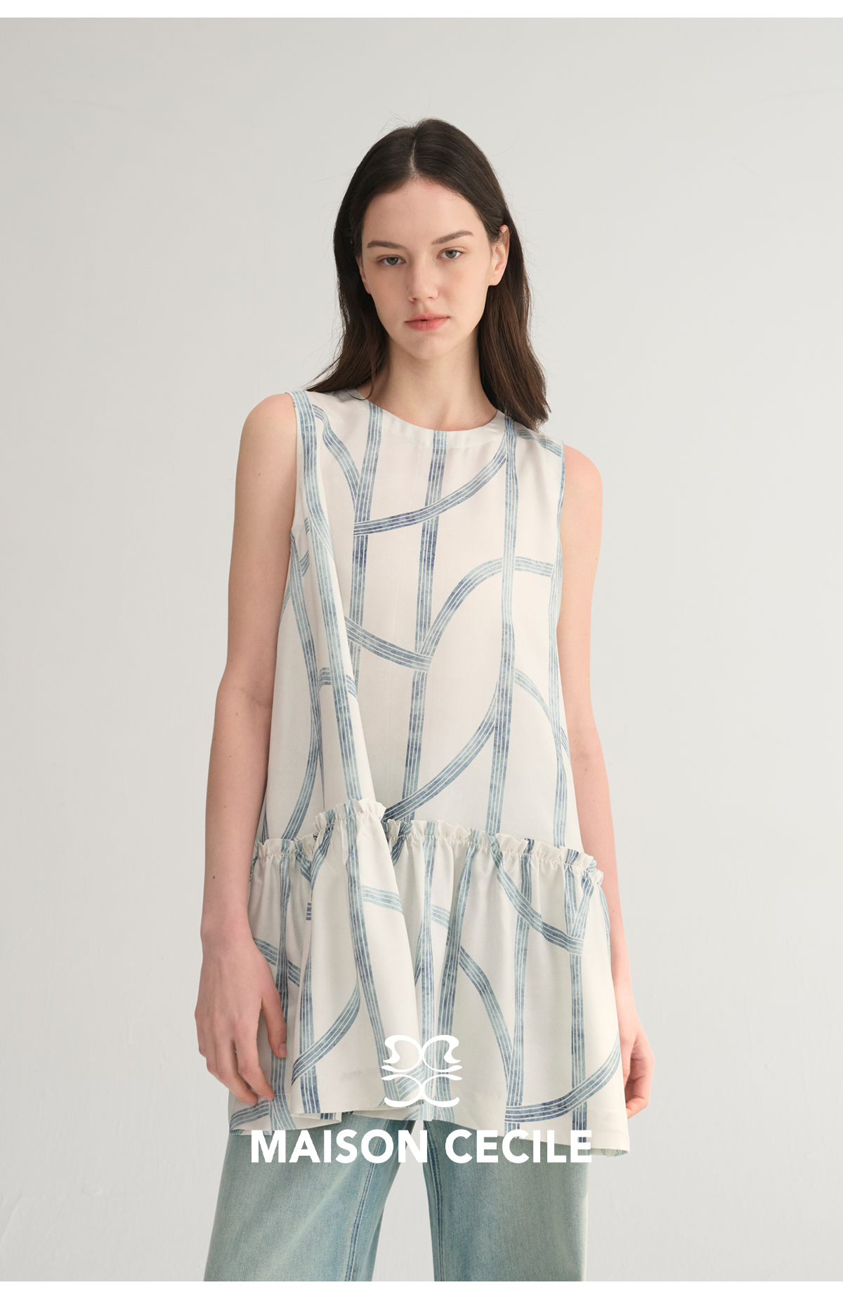MC桑蚕丝du家印花条纹设计感无袖拼接娃娃衫上衣MAISON CECILE