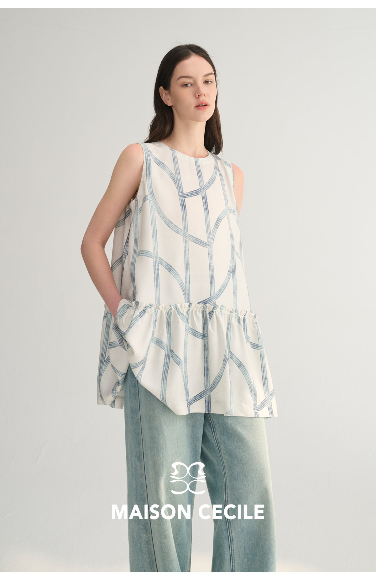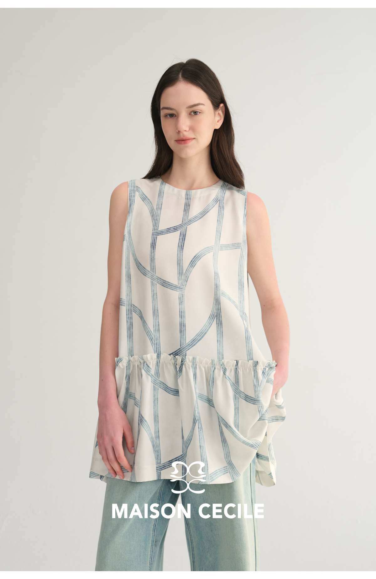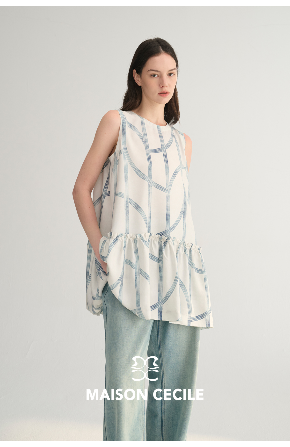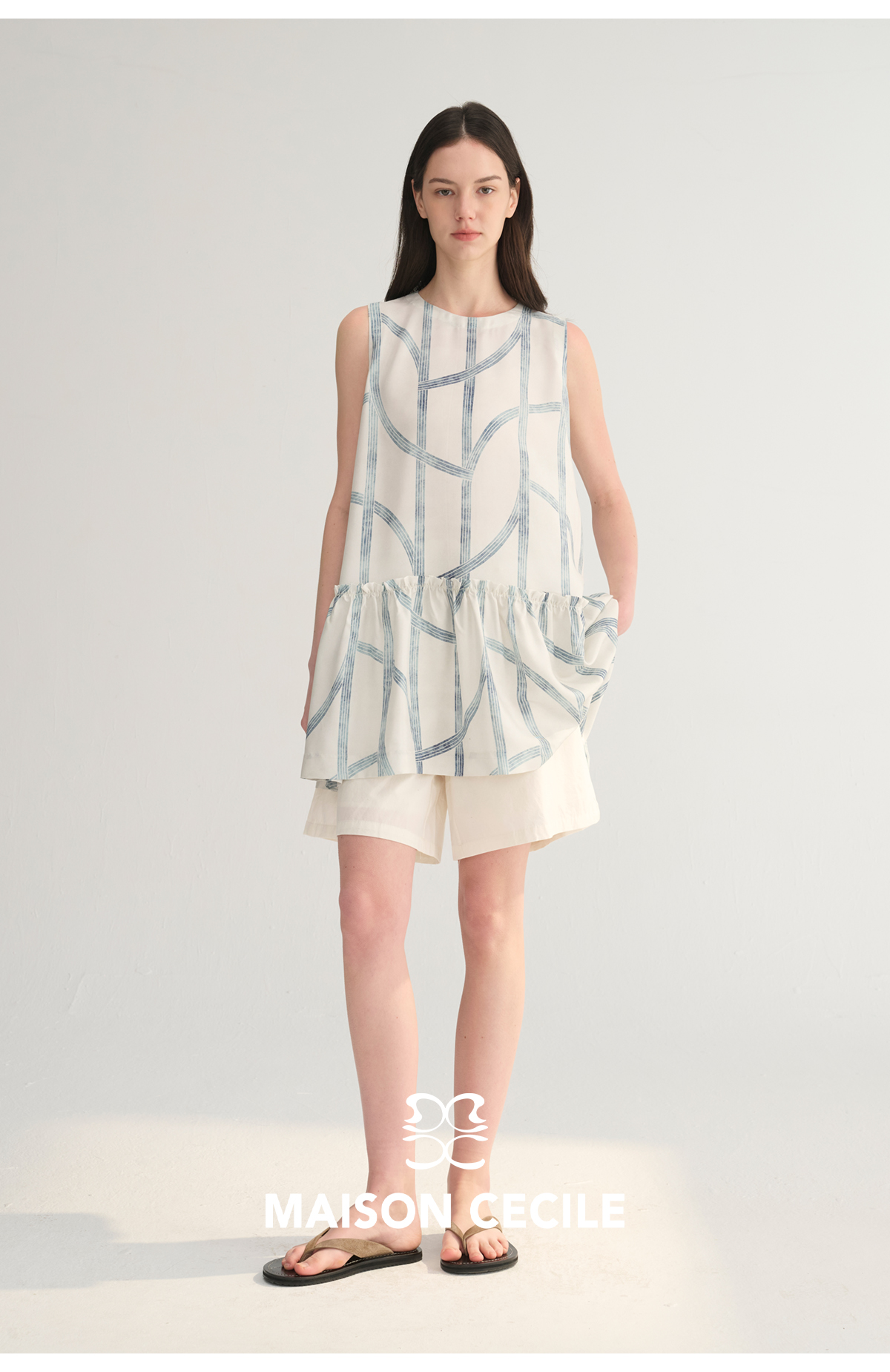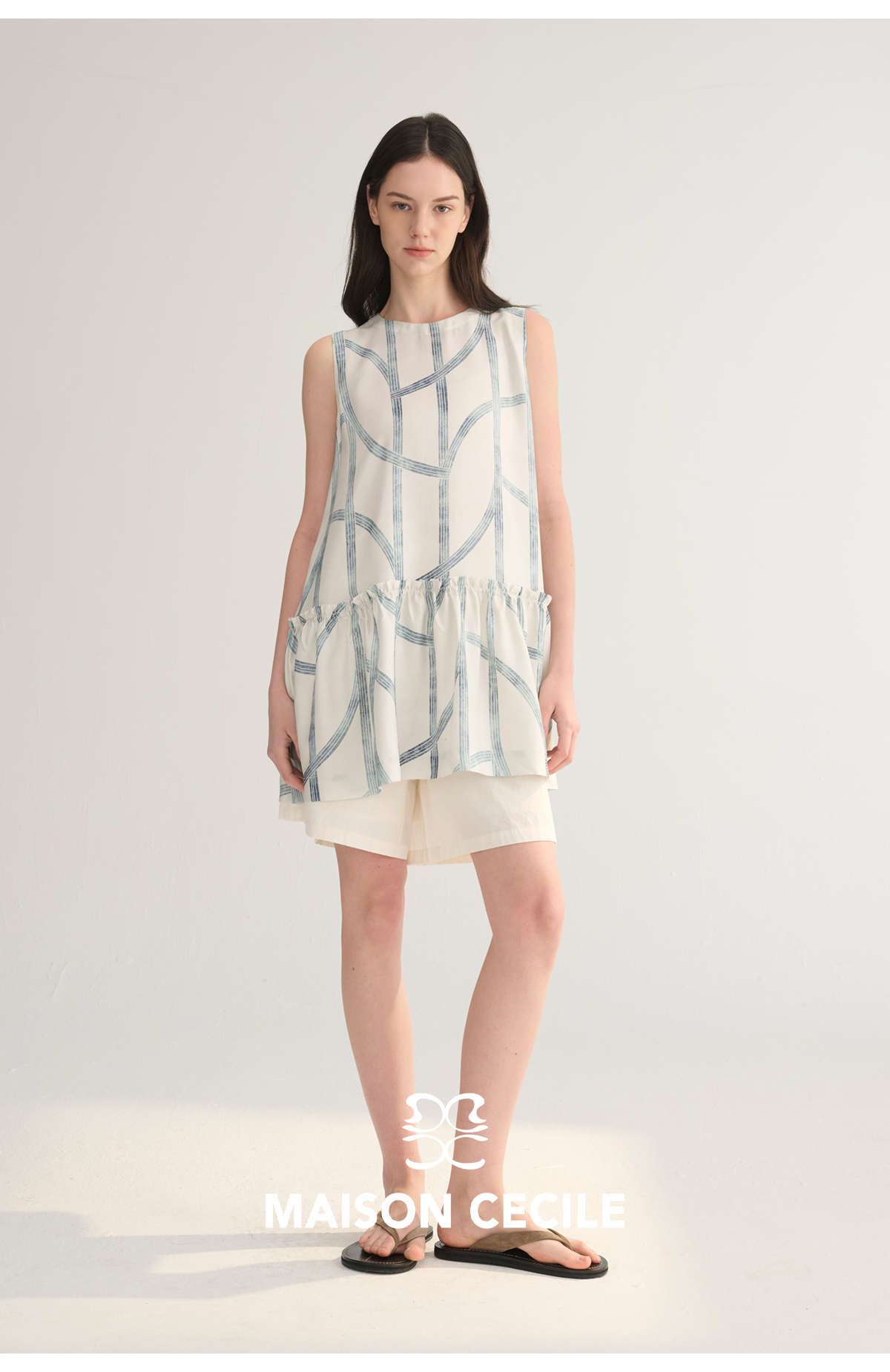 MC桑蚕丝du家印花条纹设计感无袖拼接娃娃衫上衣MAISON CECILE