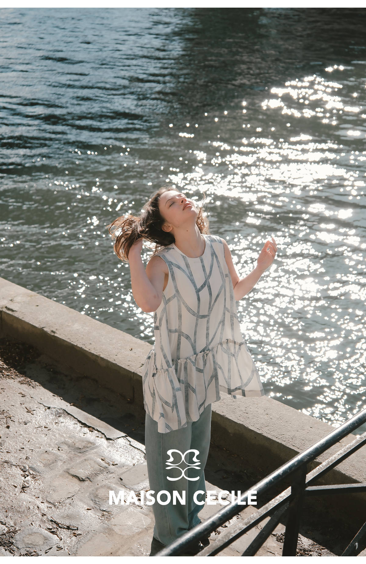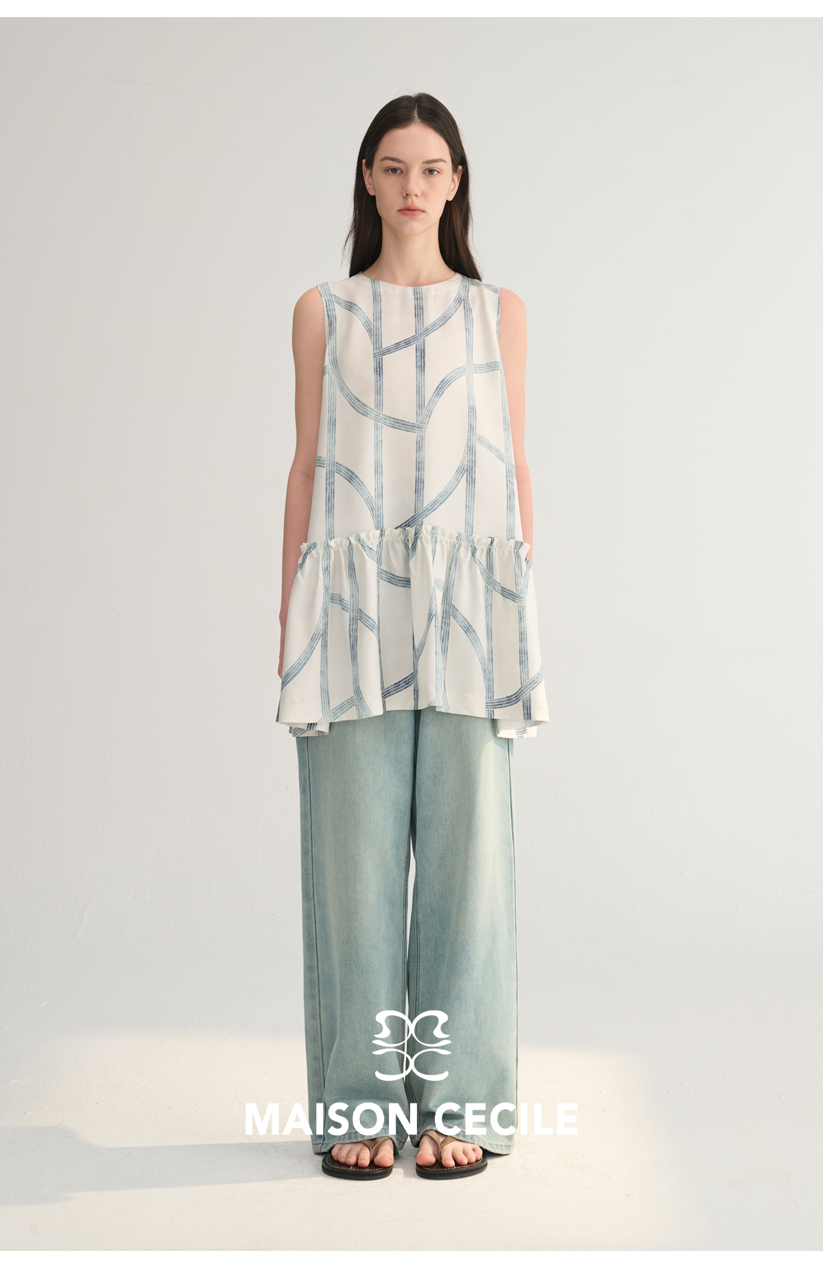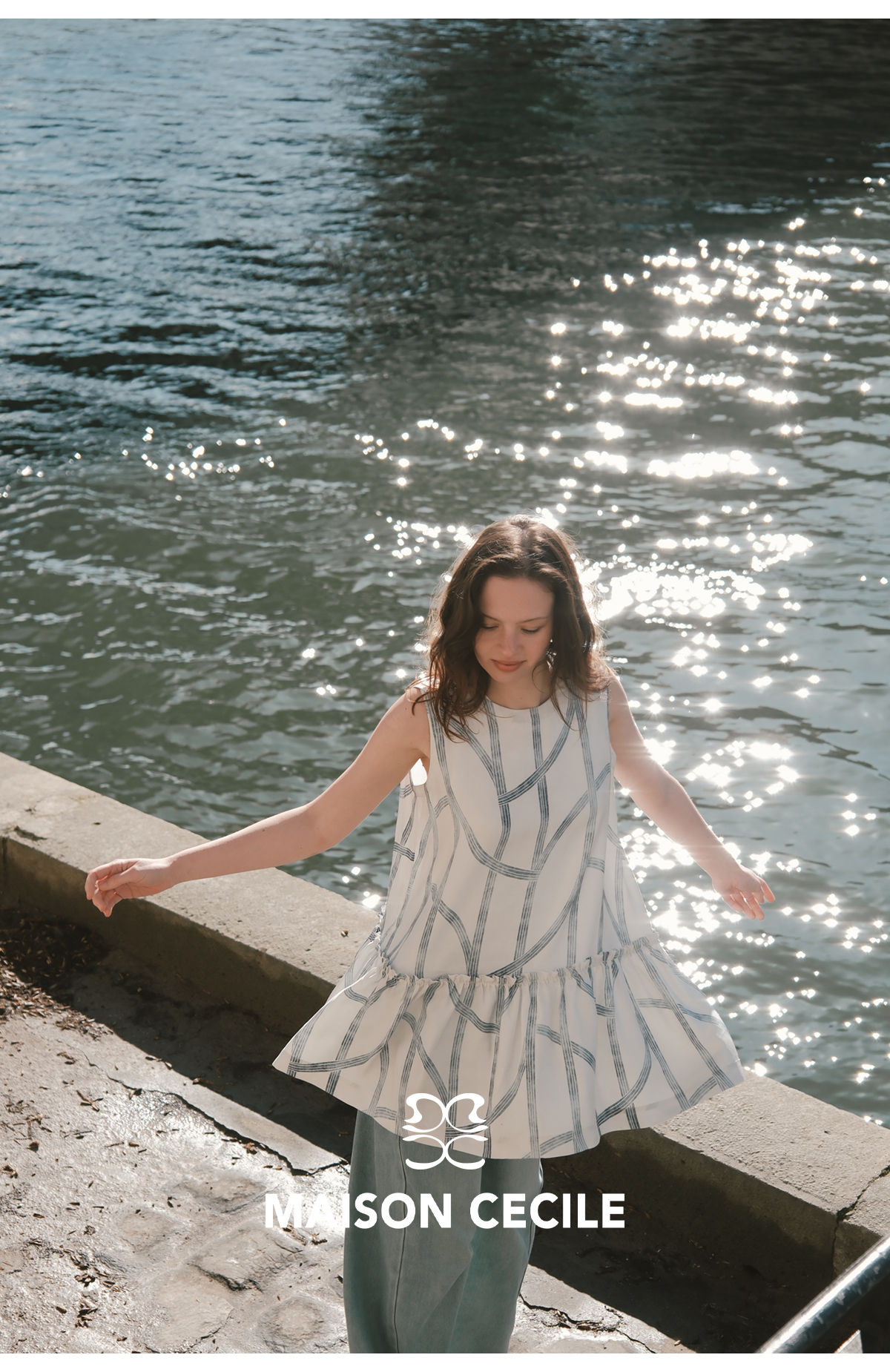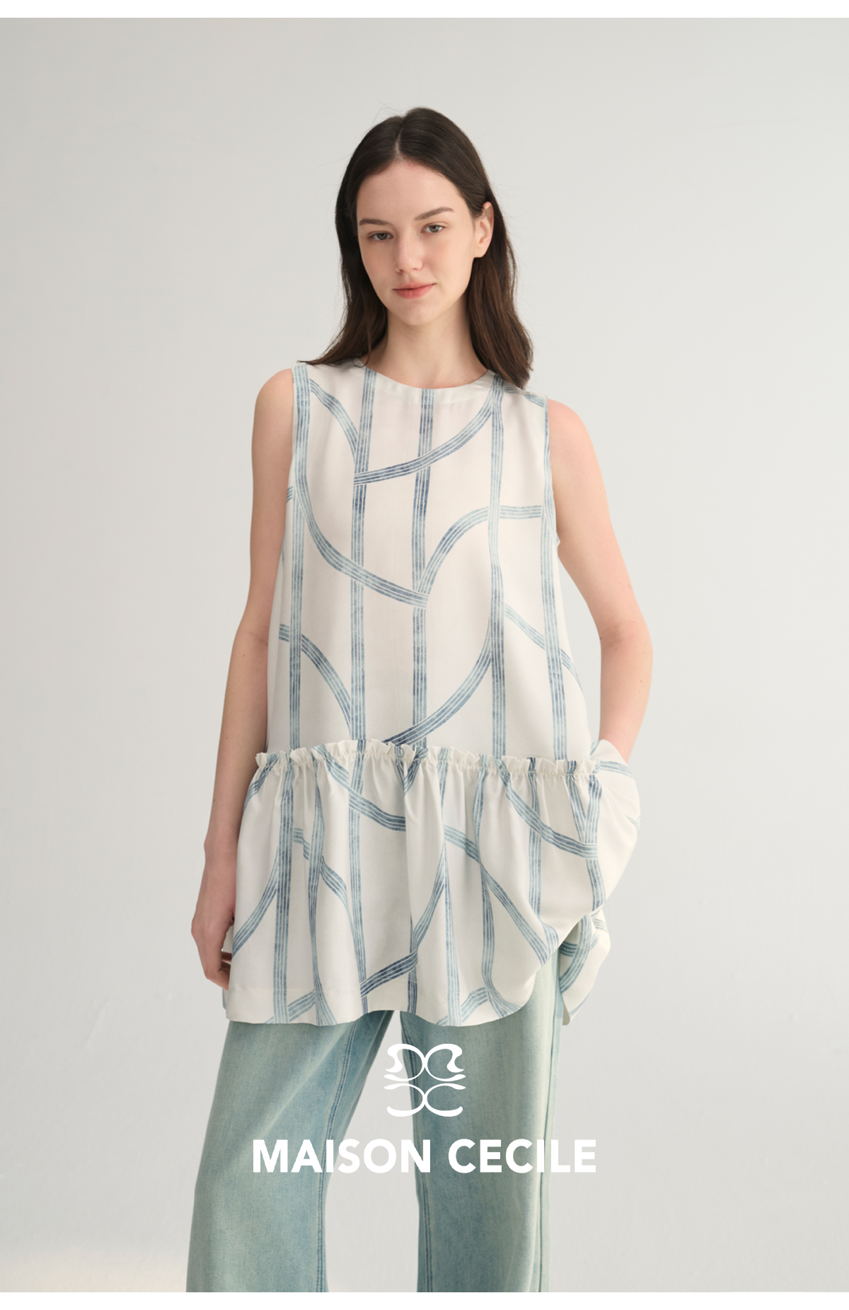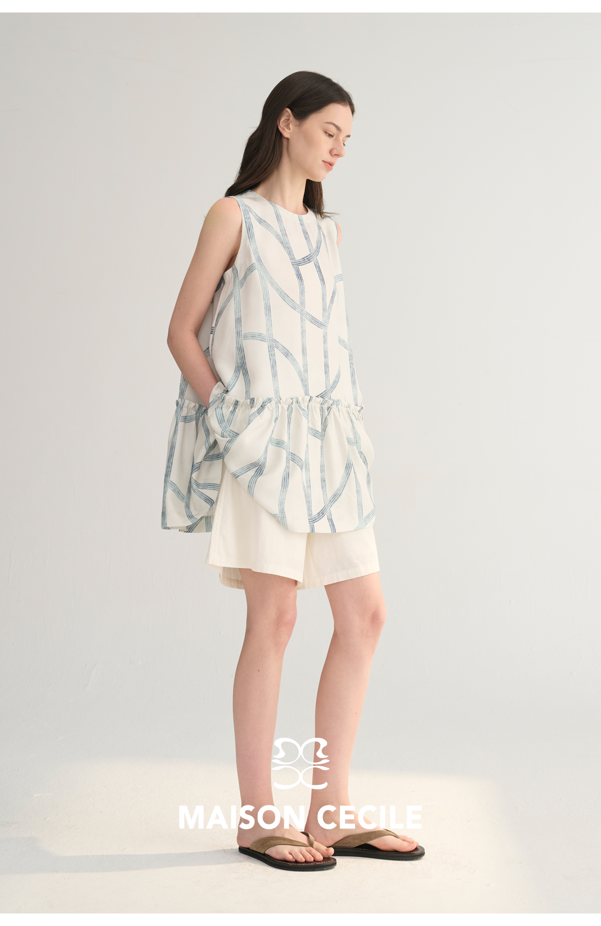 MC桑蚕丝du家印花条纹设计感无袖拼接娃娃衫上衣MAISON CECILE