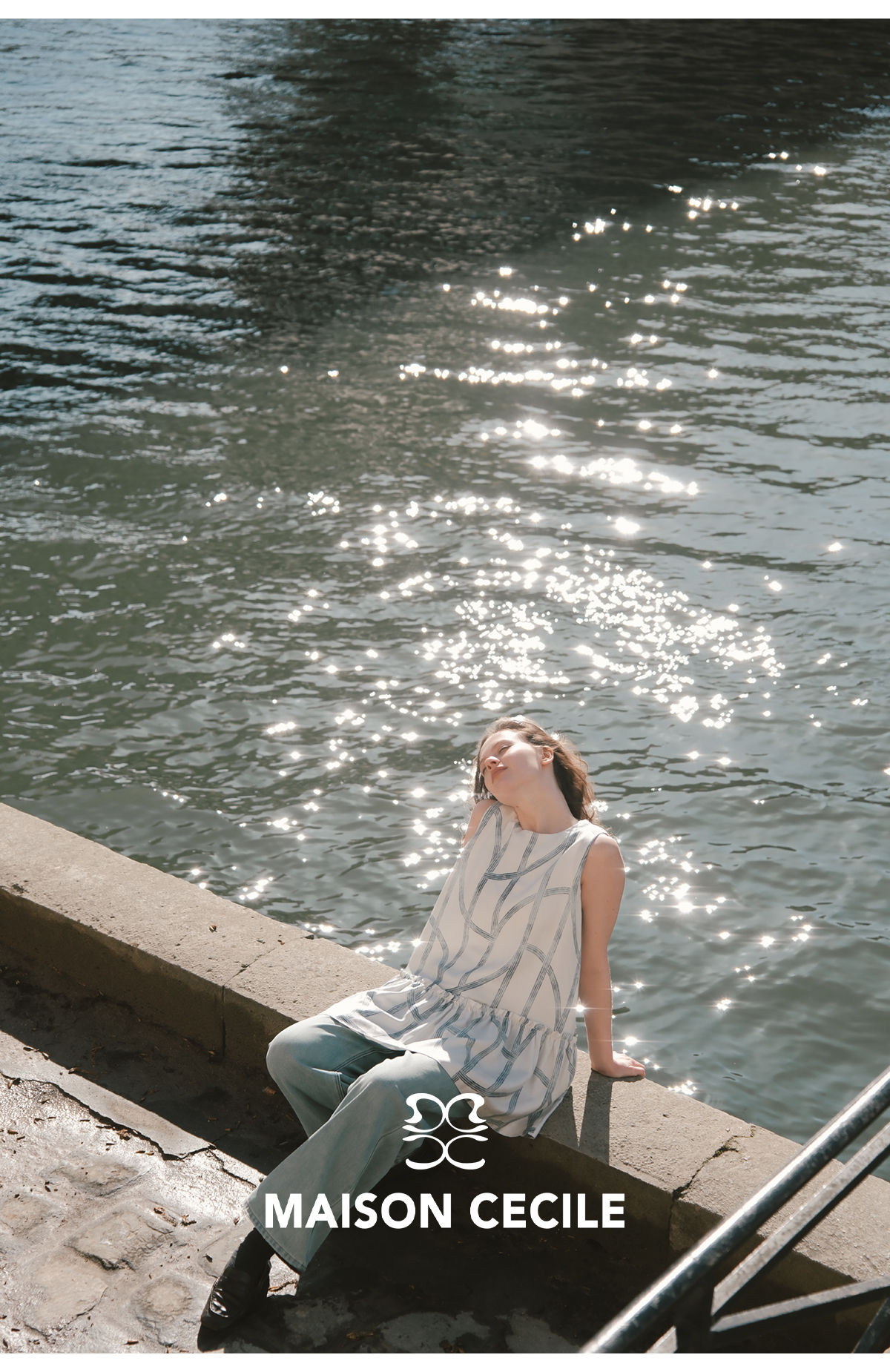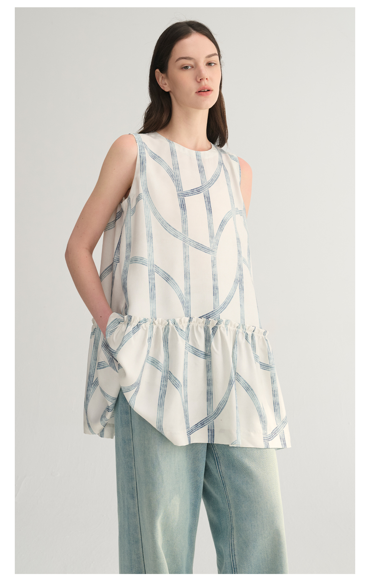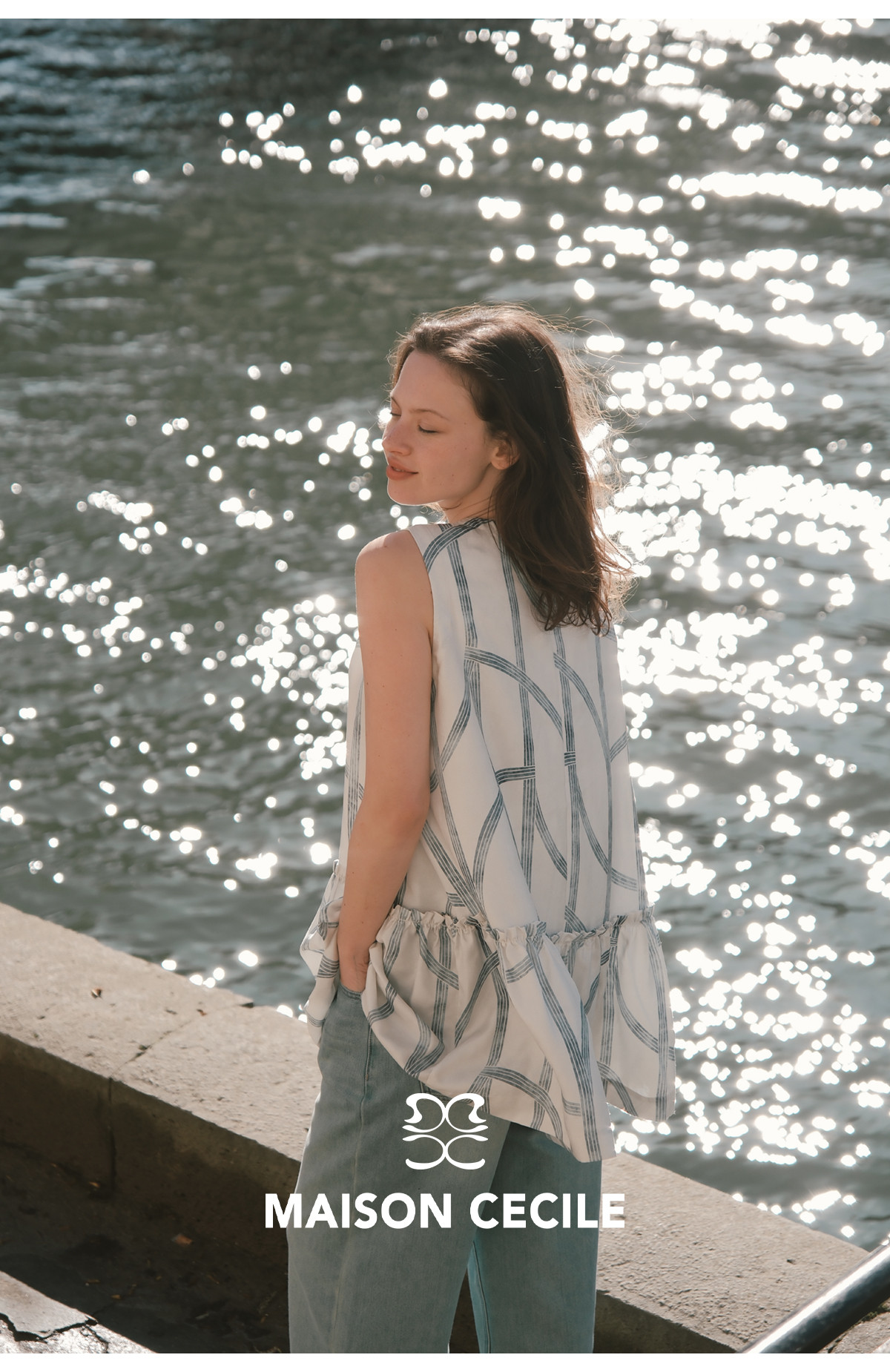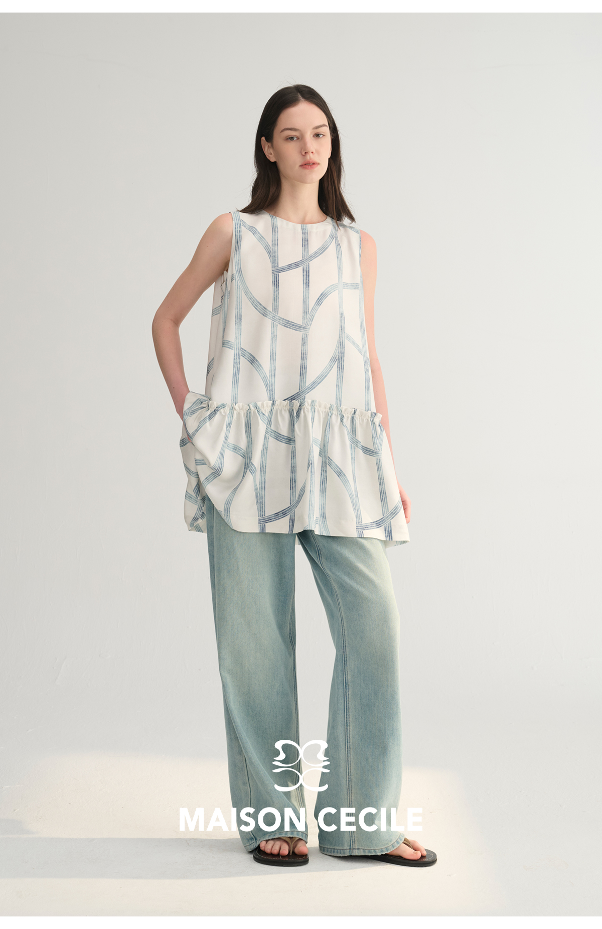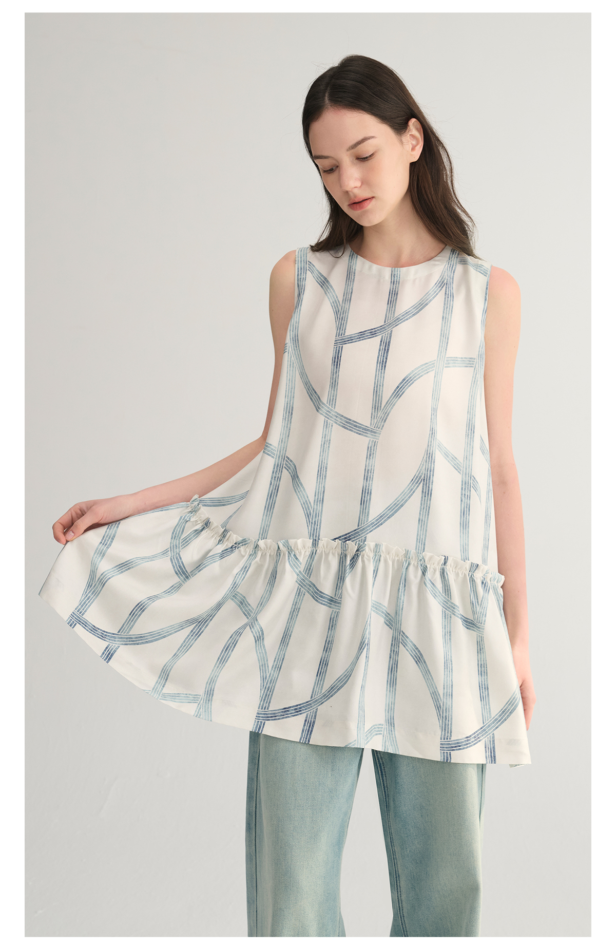 MC桑蚕丝du家印花条纹设计感无袖拼接娃娃衫上衣MAISON CECILE