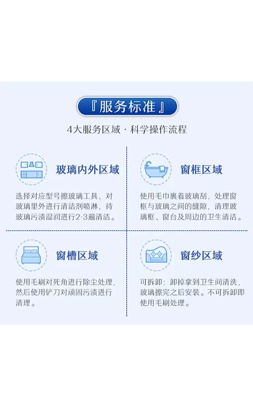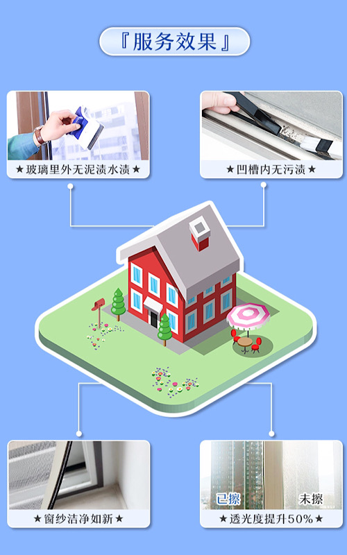 3.清洁范围:窗户玻璃、窗槽、窗框、纱窗等。