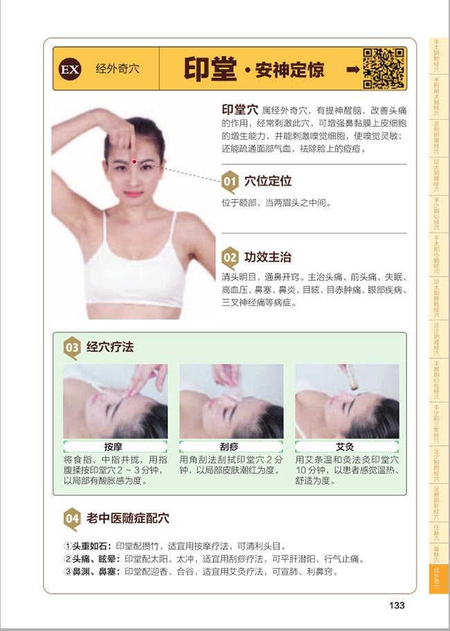 Peface 目录 从基础开始,走进经穴的世界 这就是与您朝夕相处的经穴 知道这些,取穴简单多了 对于经穴,您可以这样操作 辨清虚实,经穴理疗有补泻 为健康锦上添花的配穴方法 “穴”以致用, 个穴 *节 手太阴肺经穴 中府•清肺热、止咳喘 尺泽•清肺热、平喘咳 孔*•缓解咳喘及咳血 列缺•头脑清醒精神好 太渊•气血旺盛面色润 鱼际•声音洪亮精神好 第二节 手阳明大肠经穴 合谷•镇痛*穴 阳溪•止痛利关节 手三里•清热明目、调理肠胃 曲池•清热和营、降逆活络 臂臑•清热明目 肩髃•通经活络 迎香•祛风通窍 第三节 足阳明胃经穴 承泣•眼睛干涩找承泣 四白•主治面瘫、眼病 头维•头脑清,头维按 地仓•治疗面瘫 颊车•治疗面神经疾病 下关•治疗面部疾病 天枢•治疗大肠疾患 归来•调经止带 水道•治小便不利 梁丘•顽固胃病寻梁丘 犊鼻•屈伸不利取犊鼻 足三里•若要肠胃好,三里经常找 上巨虚•主治大肠疾患 丰隆•祛痰化湿 内庭•胃热上冲取内庭 第四节 足太阴脾经穴 隐白•健脾止血 商丘•健脾消食 三阴交•健脾利肝肾 地机•保养生殖系统 阴陵泉•清脾理热、宣泄水液 血海•生血养颜 公孙•健脾胃、助消化 大包•止痛安神 第五节 手少阴心经穴 极泉•健脑强心 少海•健齿减痛,胃口好 通里•缓解神经衰弱 阴郄•清心安神 神门•宁心安神 少冲•中风、休克急救 第六节 手太阳小肠经穴 少泽•立消喉痛、急救中风 后溪•舒筋活络 小海•清热、止头痛 天宗•活血通络,止痛 肩中俞•解表宣肺、养肝明目 颧髎•缓解面部麻痹,治眼疾 听宫•聪耳开窍 第七节 足太阳膀胱经穴 睛明•通络明目、治眼疾 攒竹•缓解头痛、流泪 大杼•清热祛痛 肺俞•治疗项背疼痛、咳嗽喘逆 心俞•治心胸、神志、胃肠疾患 膈俞•散热化血 肝俞•清肝明目 胆俞•治疗胆疾 脾俞•健脾和胃 胃俞•治胃痛胃胀 三焦俞•治三焦失调 肾俞•治腰酸腰痛 志室•补肾、利湿、强腰膝 大肠俞•缓解湿重腰痛 膀胱俞•治疗大小便疾病 委中•治腰背下肢疾病 承山•治小腿抽筋 昆仑•舒筋活络 八髎•缓解痛经、治阳痿 至阴•治胎位不正 第八节 足少阴肾经穴 涌泉•急救穴之一 太溪•壮阳固肾 照海•调经止痛 复溜•调理肾脏 俞府•止咳平喘 大赫•调经助阳 肓俞•便秘不用愁 第九节 手厥阴心包经穴 曲泽•清心平燥 间使•安神利心 内关•健胃和气 大陵•健心强体 劳宫•意外急救 中冲•防暑治暑 第十节 手少阳三焦经穴 阳池•清热通络 外关•去火通络 支沟•通便利腑 肩髎•祛湿通络 翳风•聪耳通窍 角孙•消肿止痛 丝竹空•明目、治眼疾 关冲•清热、治耳喉疾病 第十一节 足少阳胆经穴 听会•保五官健康 风池•壮阳益气 肩井•、通乳、止痛 日月•预防肌*老化,增强性功能 带脉•行气活血 膝阳关•清热降温 阳陵泉•疏肝解郁 悬钟•疏肝益肾 第十二节 足厥阴肝经穴 行间•调经止痛 太冲•疏肝养血 曲泉•男女生殖系统保健 阴包•利尿、止痛、调经 章门•调脾胃、助消化 期门•疏肝理气活血 第十三节 任脉穴 中极•行气活血 关元•固本培元 气海•延年益寿 神阙•通经行气 水分•理气止痛 建里•健胃和气 中脘•促进消化 膻中•舒畅心胸 天突•理气平喘 廉泉•开舌窍、利咽喉 承浆•舒筋活络 第十四节 督脉穴 长强•清热通便 腰阳关•强腰膝 命门•滋阴壮阳 至阳•利膈退黄疸 身柱•补气壮阳,增强性功能 大椎•祛风散寒 百会•提神醒脑、防脱发 哑门•开窍醒神 风府•理气解郁 神庭•清热宁神 人中•回阳救逆,疏通气血 第十五节 经外奇穴 印堂•安神定惊 四神聪•强健精神 鱼腰•清热明目 太阳•消除疲劳 子宫•调经止带 定喘•止咳平喘 夹脊•调节脏腑 鹤顶•通利关节 胆囊•疏肝利胆 活“穴”活用,手到病除 *节 经穴保日常健康 感冒•想要摆脱,拔罐理疗不错 发热•周身难受,理疗刮痧效奏 咳嗽•难停止,刮痧理疗治 支气管炎•常喘息,按摩理疗来理气 哮喘•短气胸闷,按摩理疗效正 牙痛•要想解决,试试刮痧穴 打嗝•止不住,按摩来送福 呕吐•要想健脾胃,刮痧理疗功效好 消化不良•不欲食,按摩理疗试一试 腹胀•能治好,方法刮痧找 腹泻•不止体虚弱,艾灸理疗真不错 便秘•不管易坏事,穴位刮痧帮您治 肥胖症•身心皆惫,刮痧理疗相随 颈椎病•不可延误,艾灸理疗帮您除 腰肌劳损•感疲劳,刮痧理疗功效妙 小腿抽筋•止寒痛,艾灸理疗弄一弄 第二节•经穴保中老年健康 高血压•醒脑开窍,刮痧理疗有效 糖尿病•三多一少,滋阴还是按摩好 冠心病•按摩对付,疗效绝不辜负 心律失常•功效大,宁心安神按摩法 中风后遗症•按摩,疗效众口说不错 肩周炎•痛楚大,刮痧日渐除掉它 第三节•经穴保两性健康 阳痿•不必苦恼,方法按摩找 遗精•需益肾,刮痧疗效正 早泄•需益阳,艾灸来帮忙 性冷淡•日常调理,按摩理疗功效奇 月经不调•用刮痧,疗效真不差 痛经•防治不是梦,一切尽在艾灸中 白带异常•不用怕,燥湿止带拔罐法 乳腺增生•刮痧疗,理气散结真有效 产后缺乳•真有效,行气通乳艾灸疗 产后腹痛•用刮痧,活血止痛功效佳 子宫脱垂•初见,艾灸理疗举陷 更年期综合征•刮痧,安心宁不差 第四节•经穴舒缓亚健康 头痛•可轻可重,拔罐理疗祛痛 偏头痛•想要摆脱,按摩理疗效不