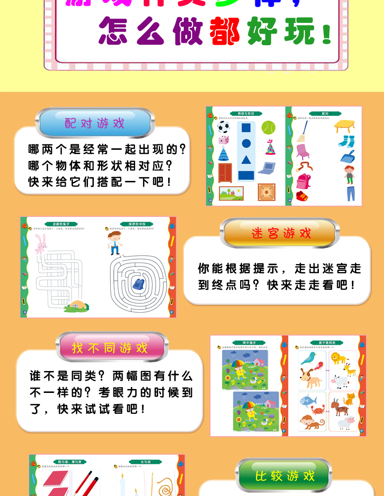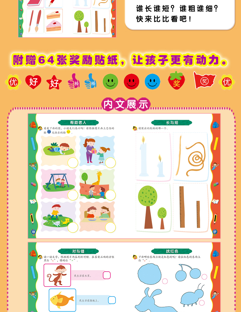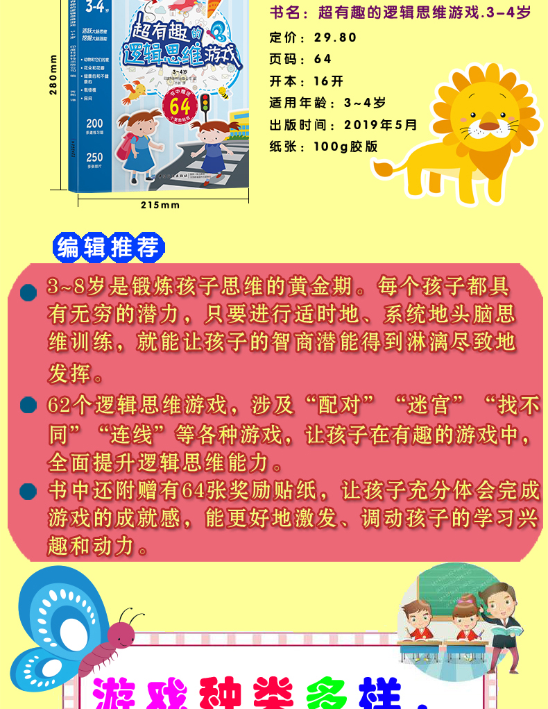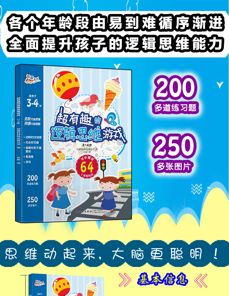 正版 超有趣的逻辑思维游戏:3~4岁儿童启蒙幼小衔接智力开发数学逻辑思维训练 比大小排序形状算数练习题 图形贴纸亲子互动游戏书